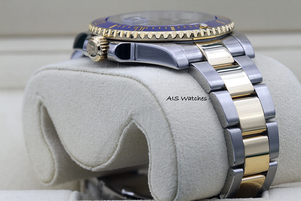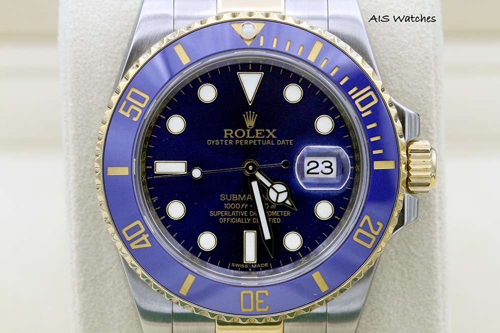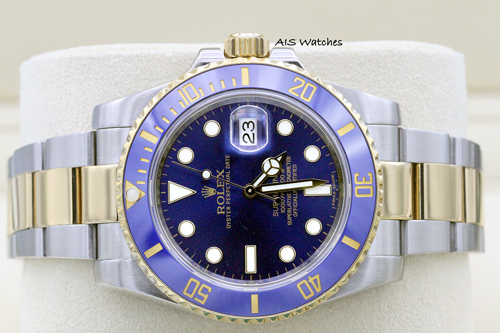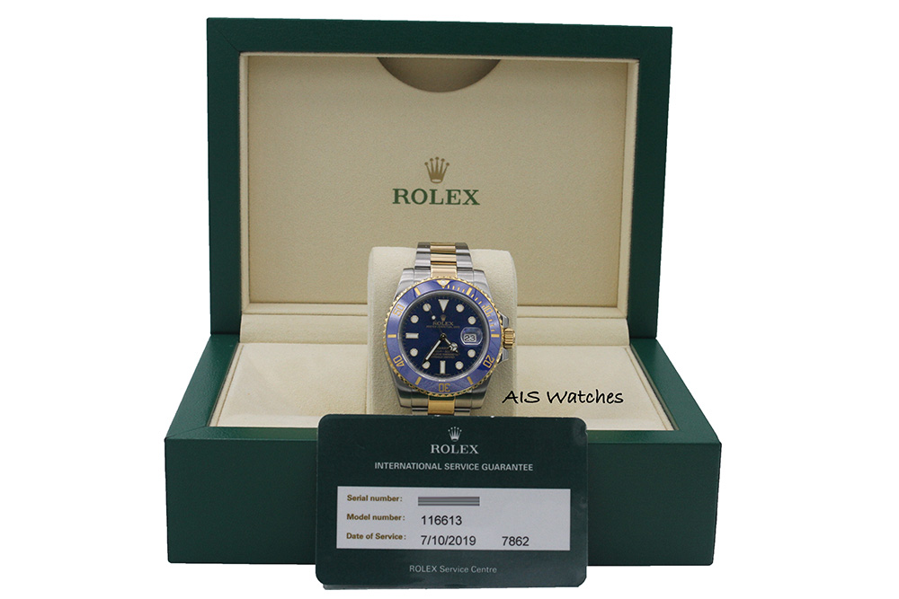 Up for sale is a Submariner Two Tone 116613 Sunburst Blue Dial with Ceramic Bezel and Random Serial RSC Card Only. Watch overall is in good condition and comes with total of 11 links.