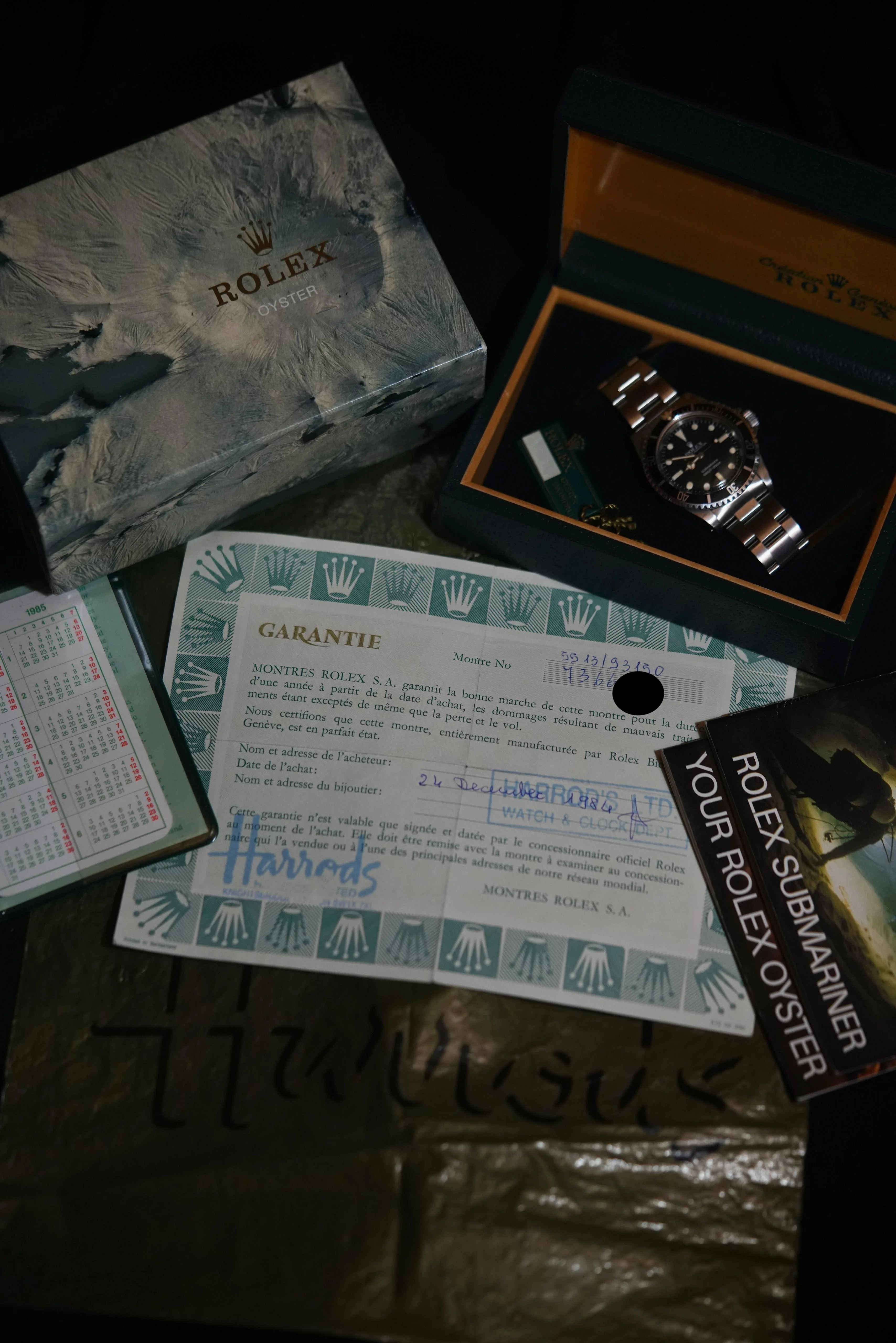 The watch comes with the full set: the original Rolex box, the original Rolex outer box with '5513' sticker, the Rolex warranty certificate, the Rolex warranty holder, the Rolex translation booklet, the Rolex calendar, the Rolex booklets ('Your Rolex Oyster' and 'Rolex Submariner'), the Rolex price tag, the original 'Harrods' plastic bag.