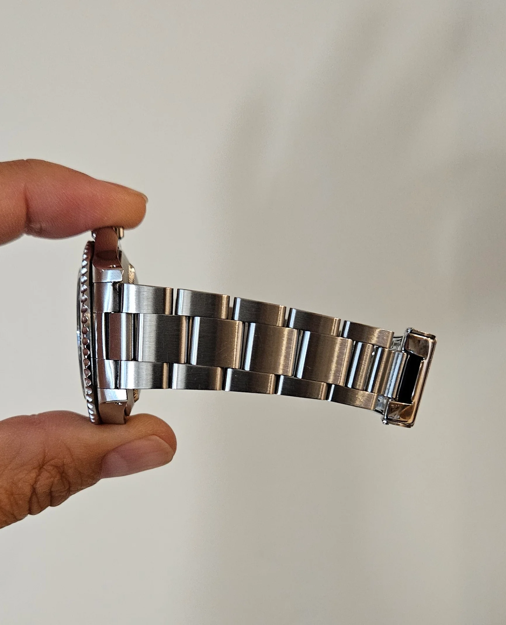 Aesthetic Condition: Crystal is clean w/ laser etched crown. Faint signs of wear on the bezel insert and case. No significant blemishes to note on the bracelet.