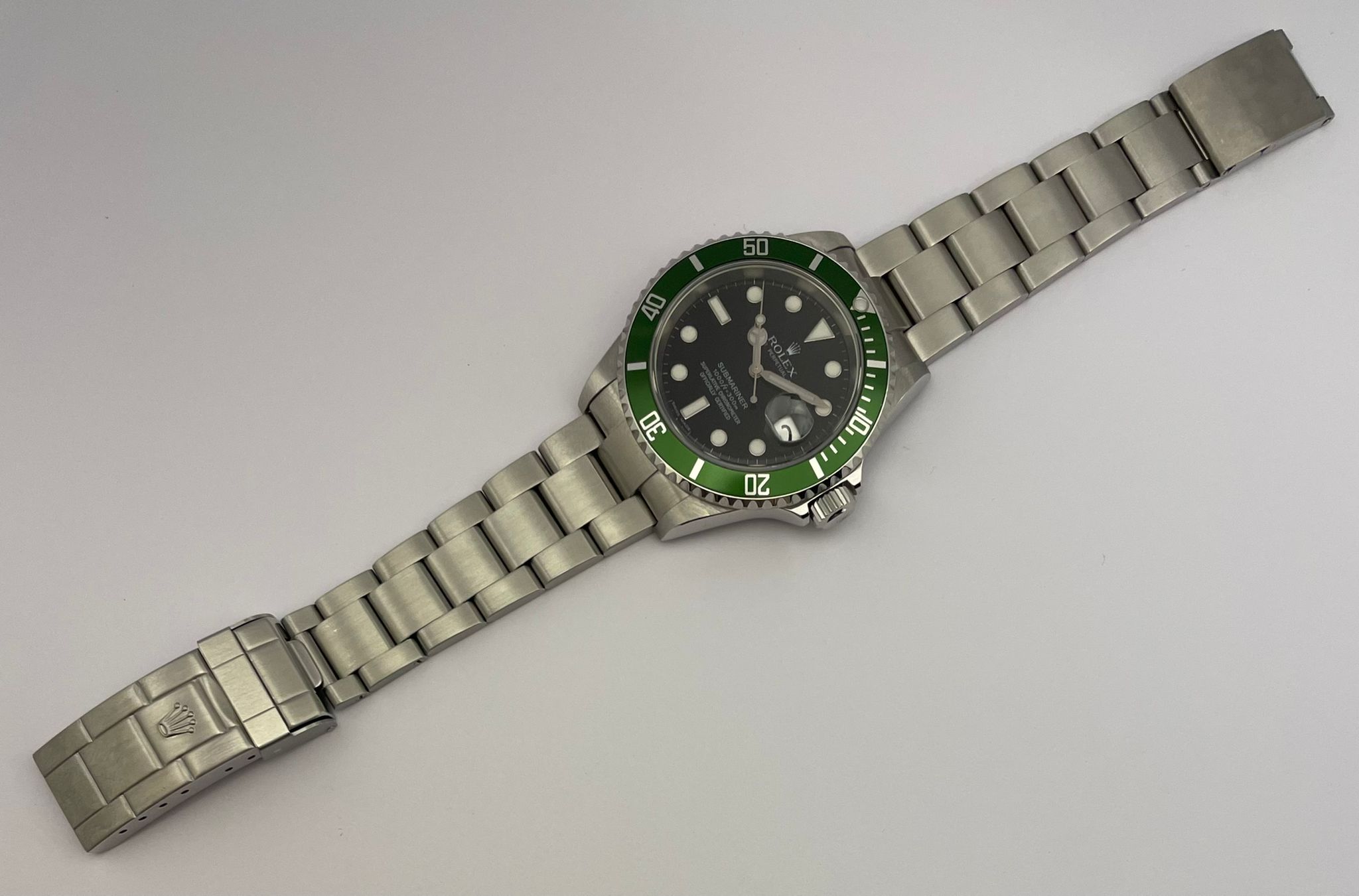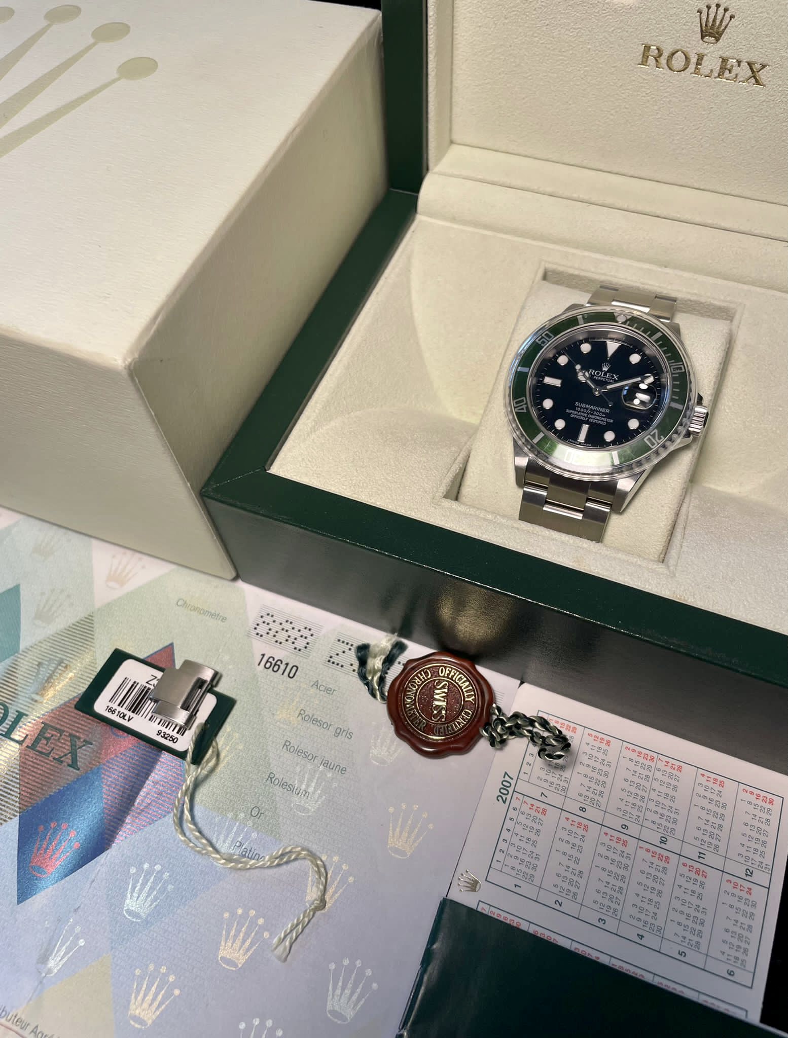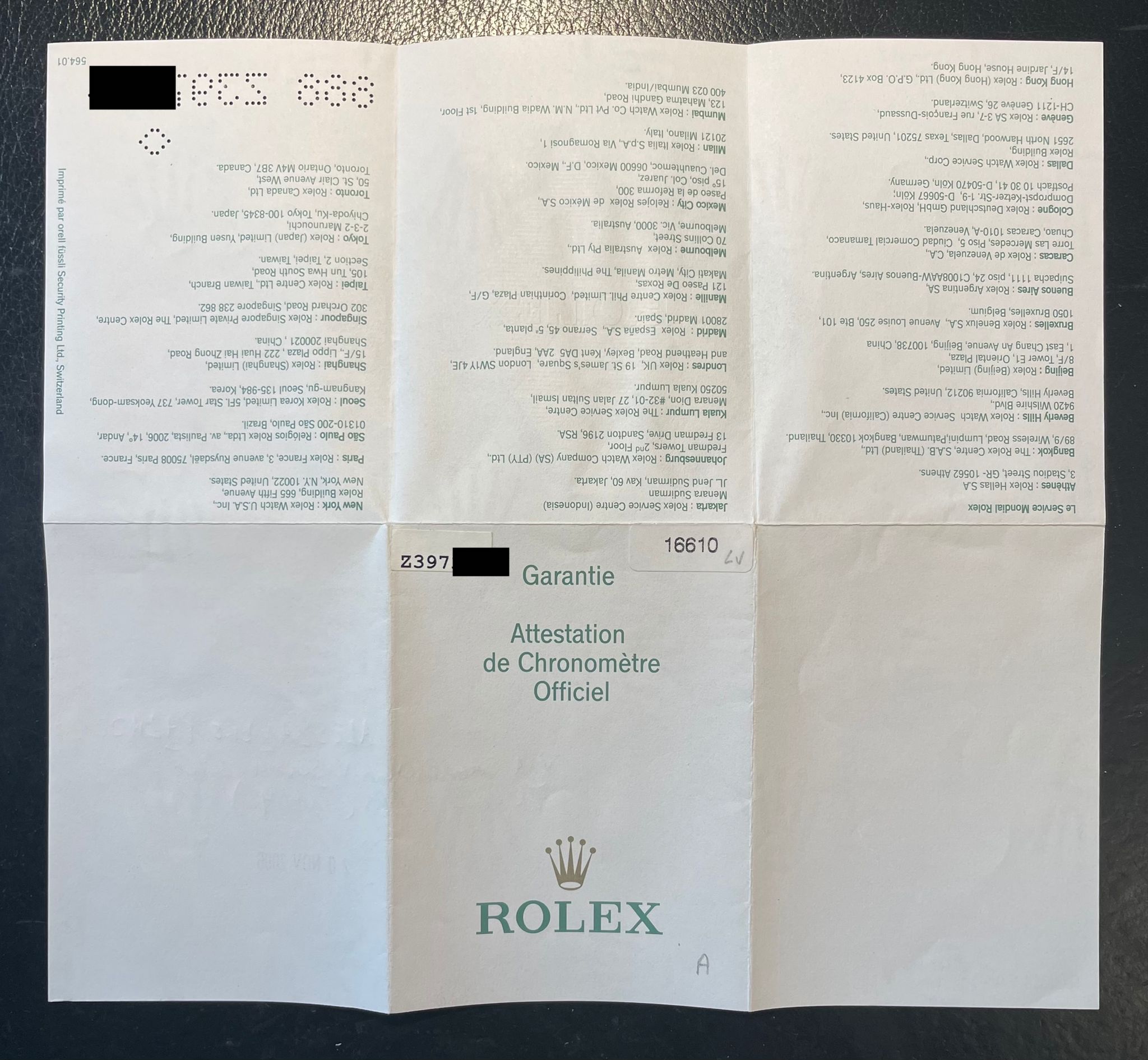 The watch comes with the complete full set: original Rolex box (inner/outer), the Rolex warranty certificate, the Rolex warranty holder, the Rolex translation booklet, the Rolex booklets ('Your Rolex Oyster' and 'Rolex Submariner'), Rolex calendar, Rolex price tag with serial number.