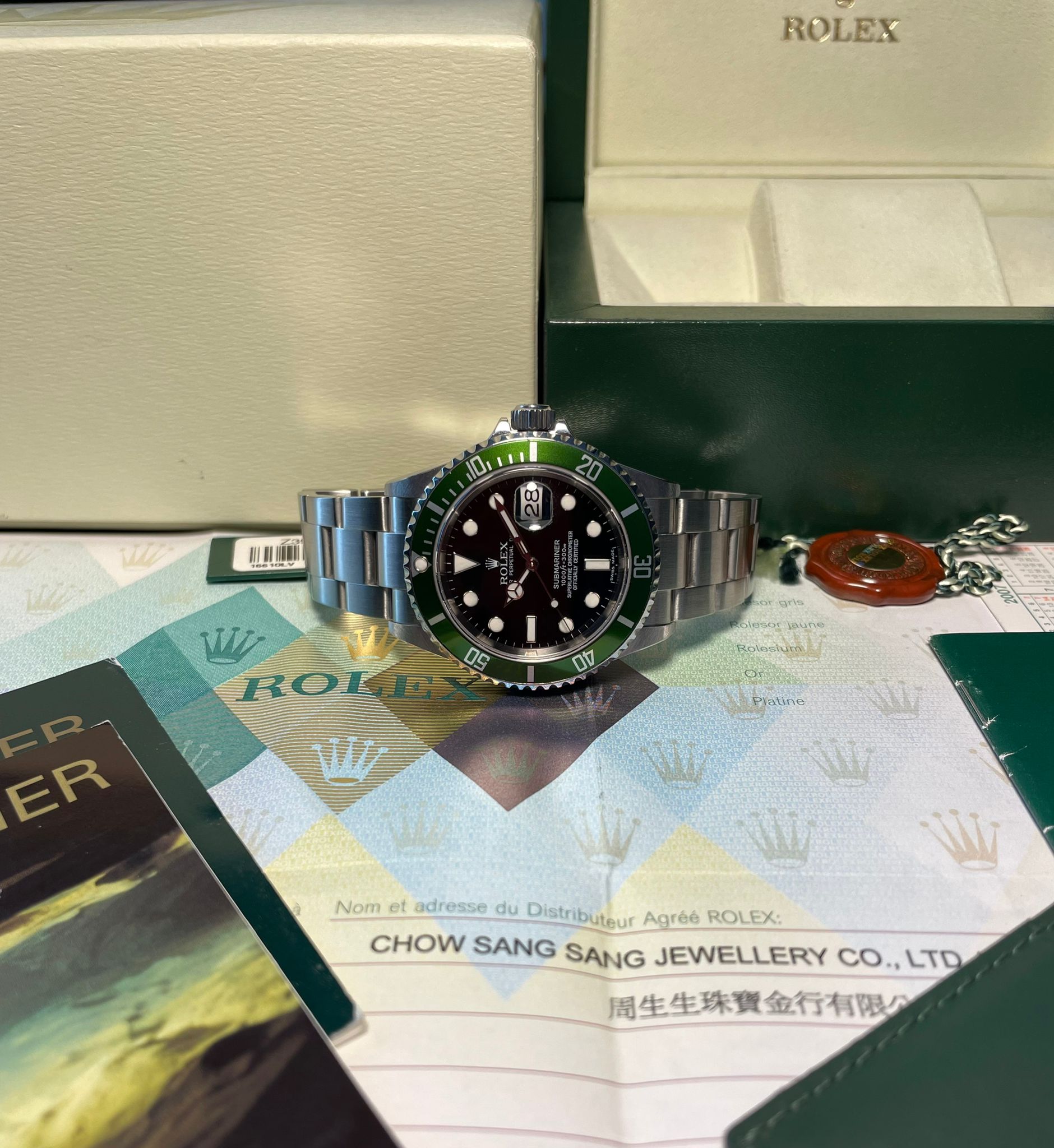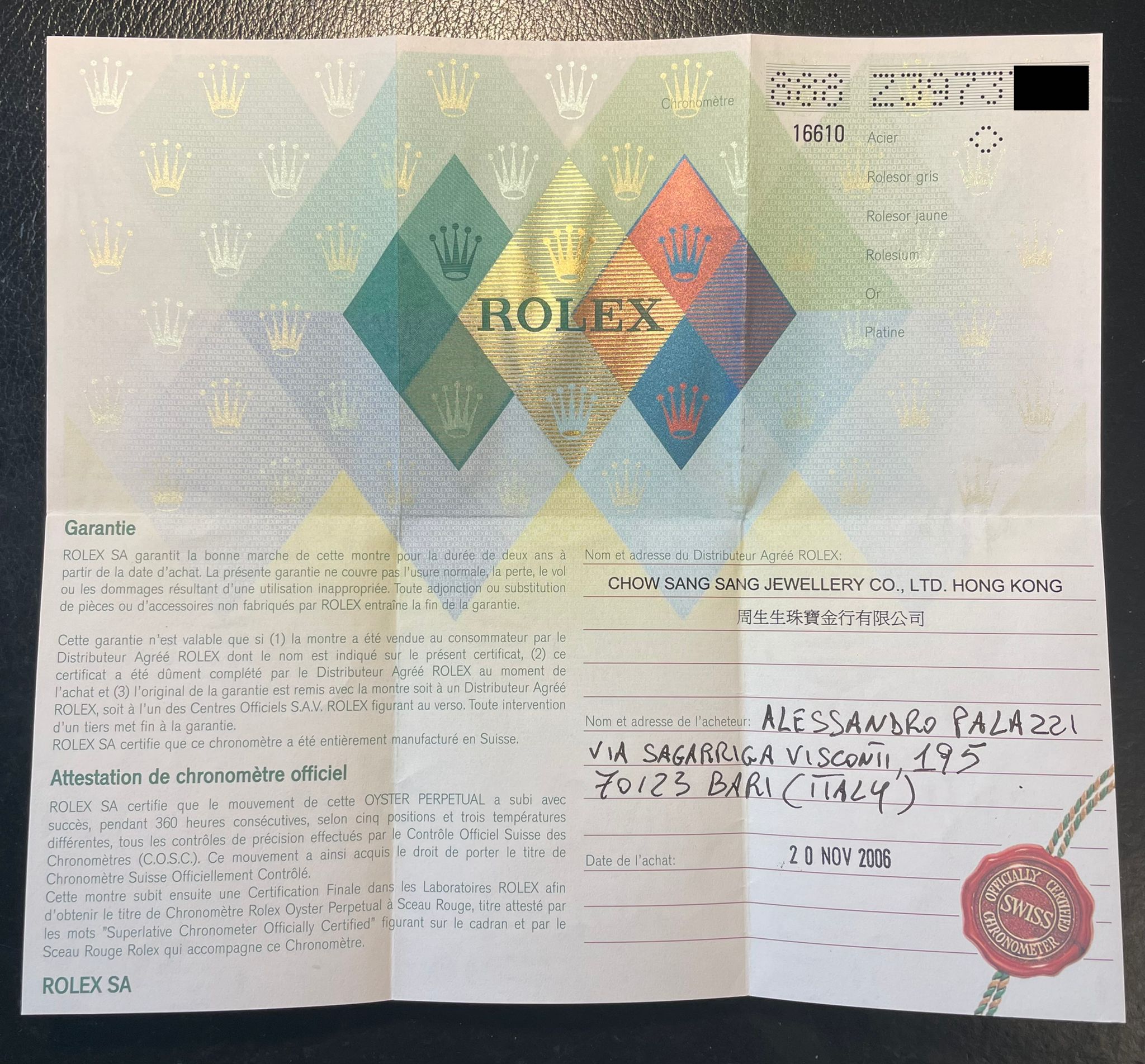 The watch was sold at the historical Rolex authorized dealer 'Chow Sang Sang Jewellery Co.' in Hong Kong in 2006 and it comes with the full set, including the original Rolex guarantee and the Rolex price tag with serial number.