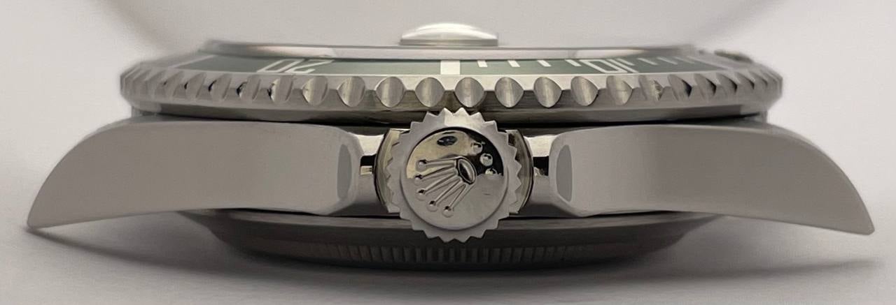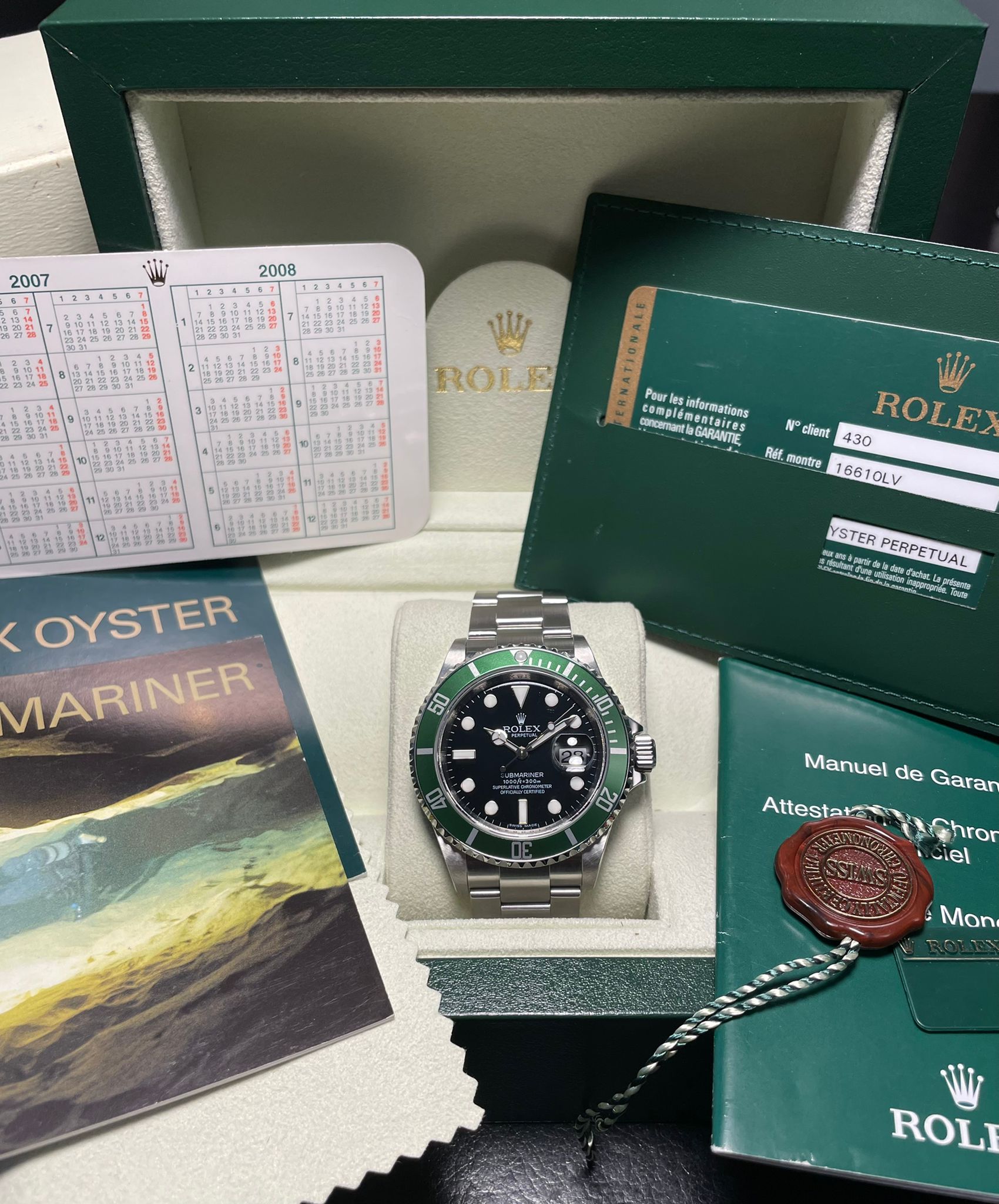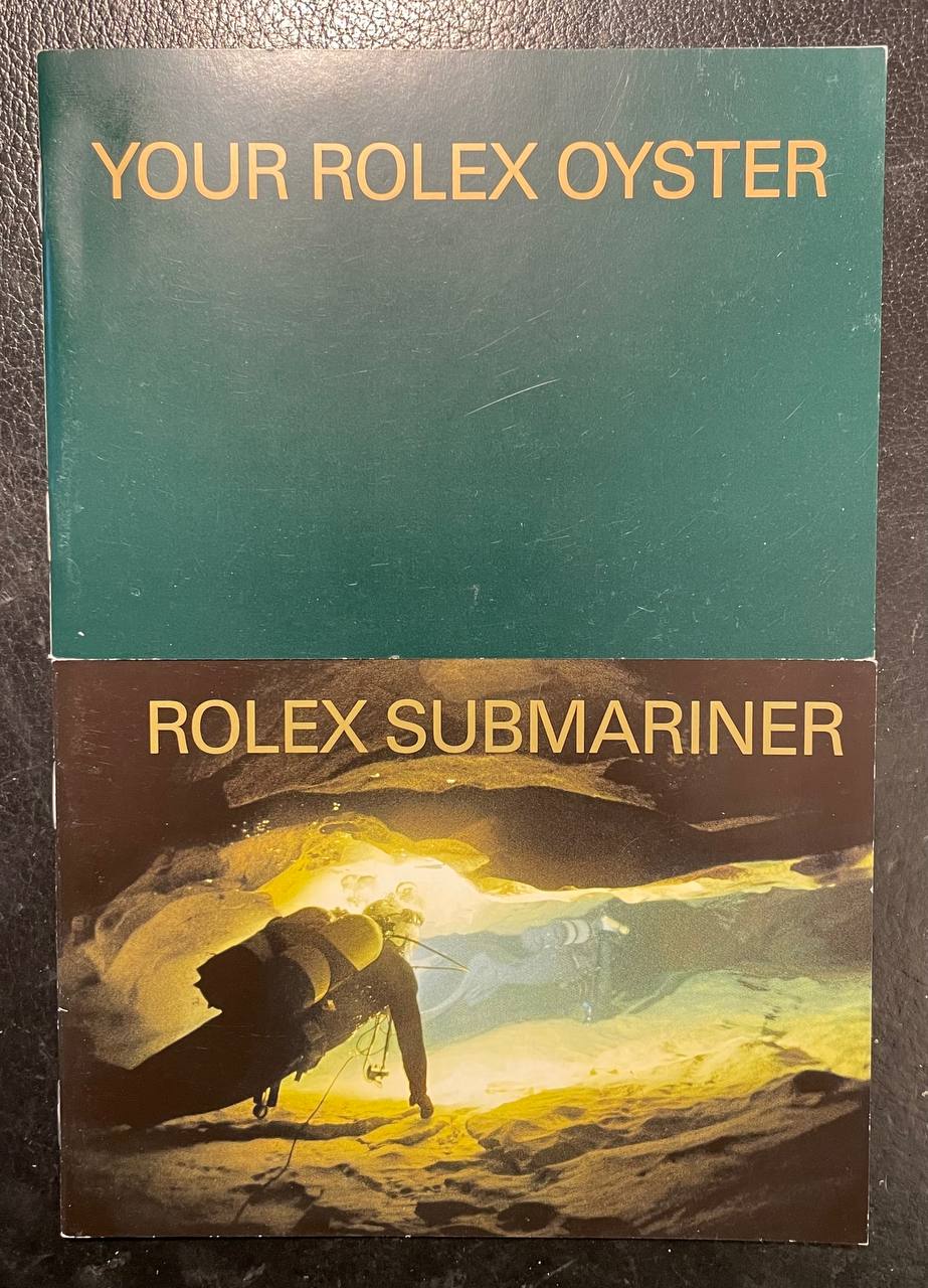 The watch comes with the complete full set: original Rolex box (inner/outer), the Rolex warranty certificate card, the Rolex warranty holder, the Rolex translation booklet, the Rolex booklets ('Your Rolex Oyster' and 'Rolex Submariner'), Rolex calendar, Rolex tags.