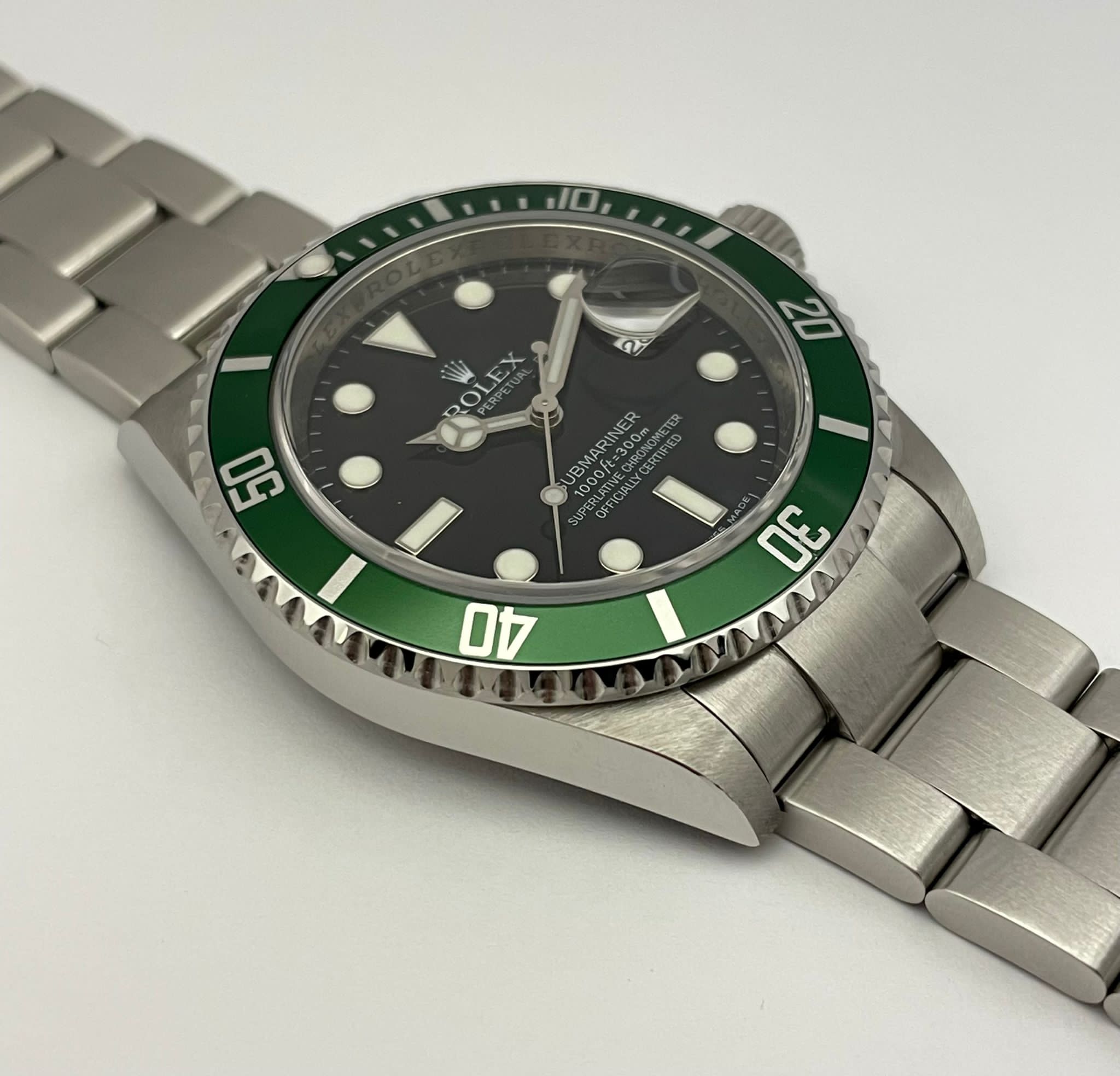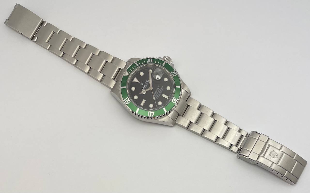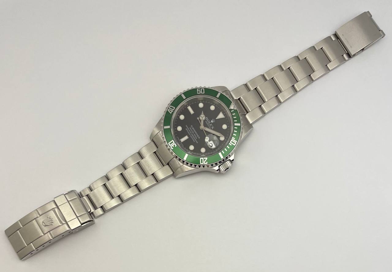 The watch comes with the complete full set: original Rolex box (inner/outer), the Rolex warranty certificate card, the Rolex warranty holder, the Rolex translation booklet, the Rolex booklets ('Your Rolex Oyster' and 'Rolex Submariner'), Rolex calendar, Rolex tags.