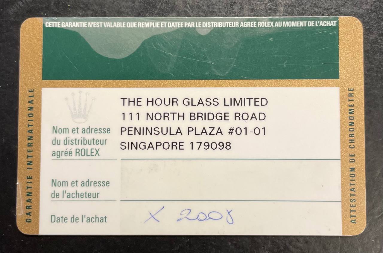 The watch was sold at the historical Rolex authorized dealer 'The Hour Glass' in Singapore in 2008 and it comes with the full set, including the original Rolex guarantee (the rare card type).