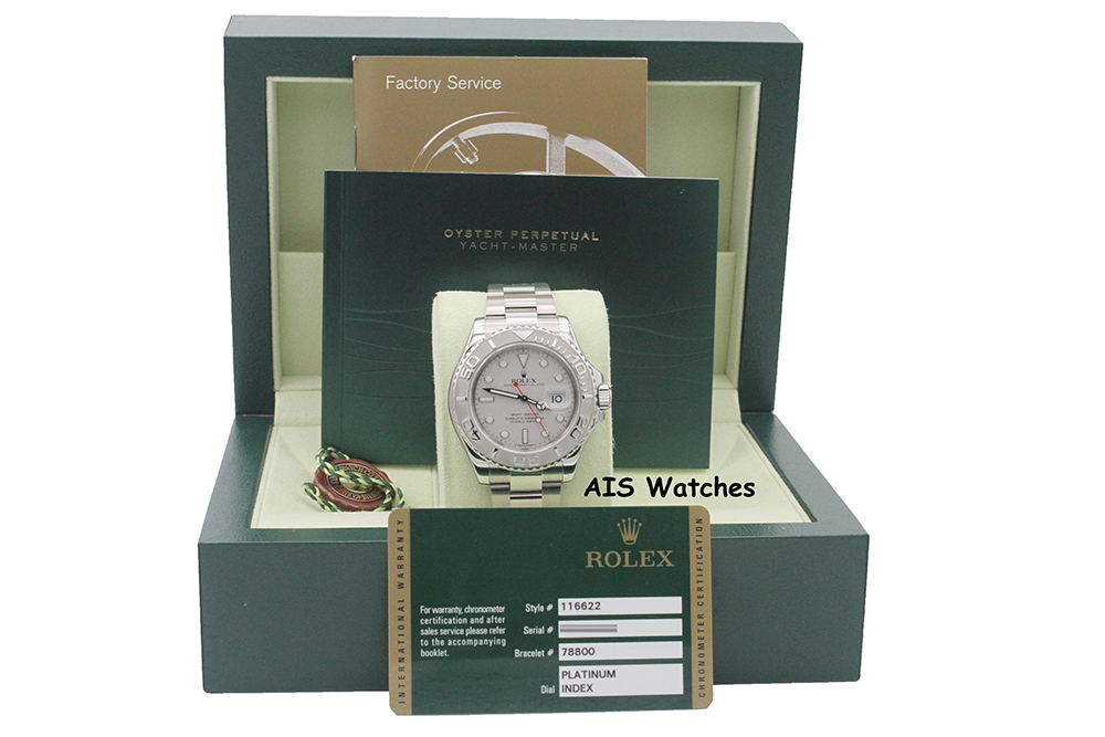 Up for sale is a Rolex Yachtmaster 116622 Platinum Dial Box & Papers. The timepiece is in excellent condition.