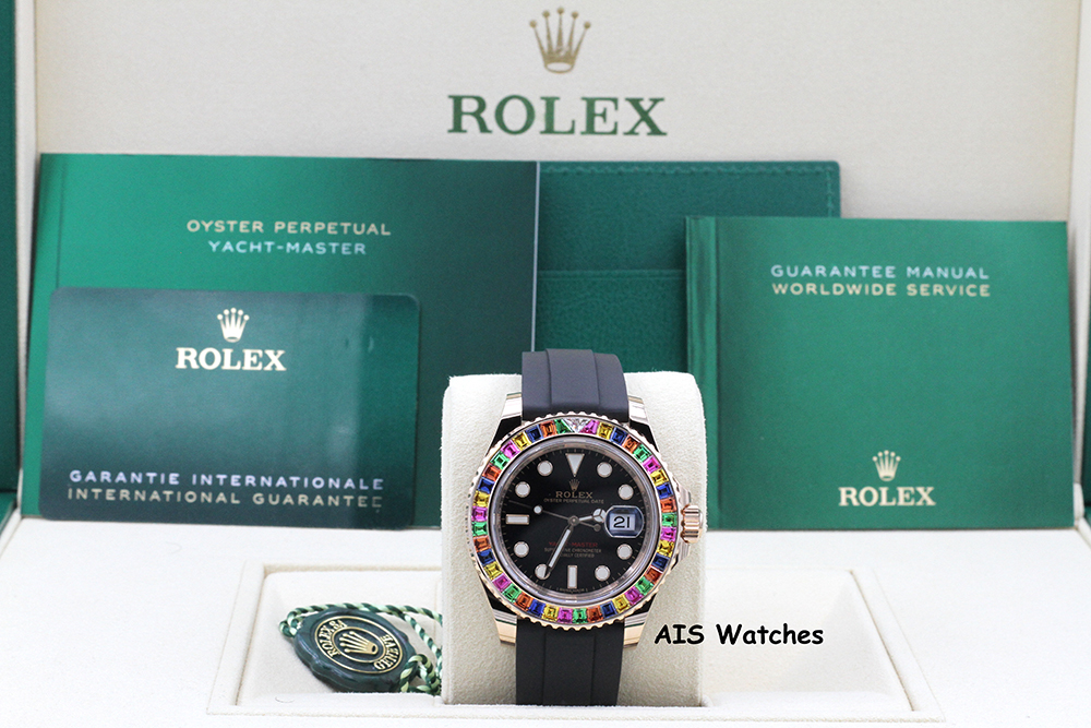 Up for sale is a Rolex Yachtmaster 116695SATS Gem Set Bezel Everose Gold OysterFlex Strap Random Serial Box & Papers. The timepiece is in excellent condition.