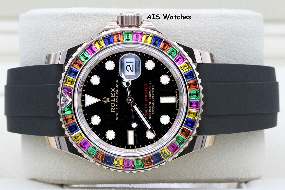 Up for sale is a Rolex Yachtmaster 116695SATS Gem Set Bezel Everose Gold OysterFlex Strap Random Serial Box & Papers. The timepiece is in excellent condition.