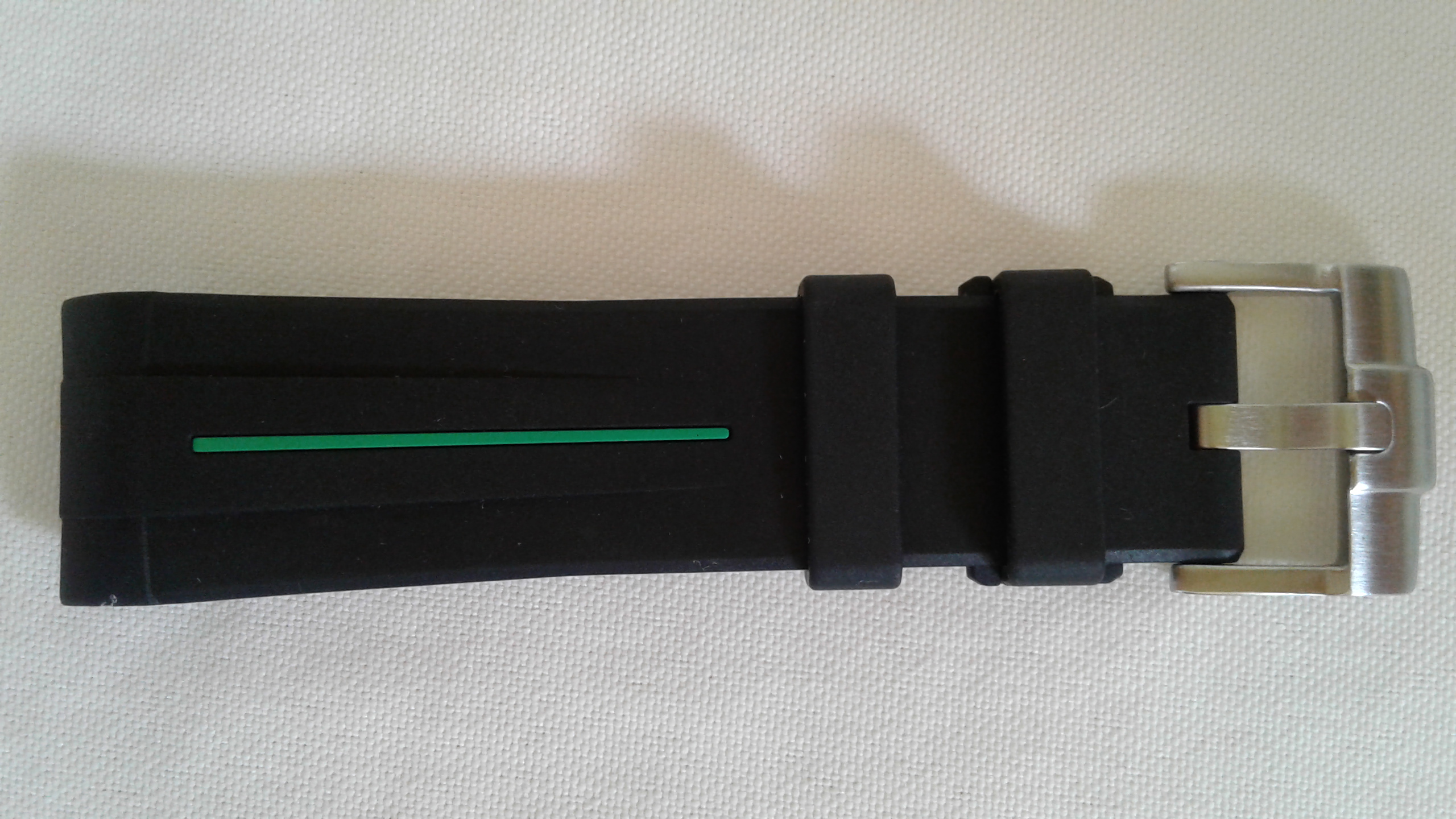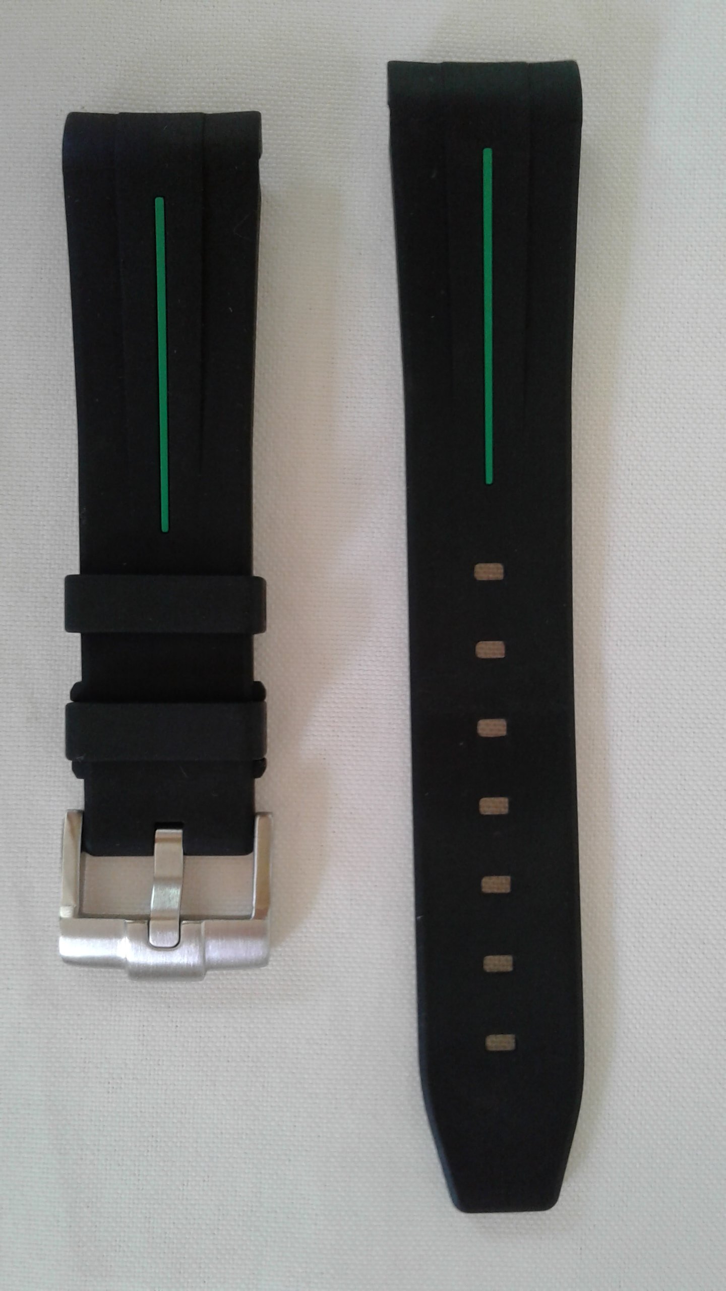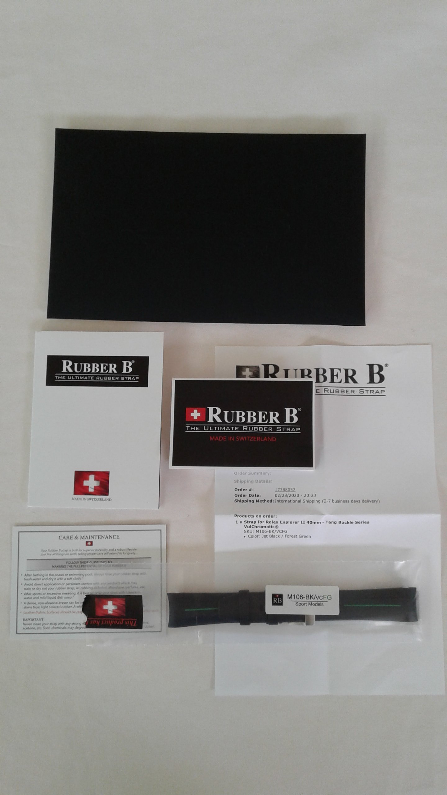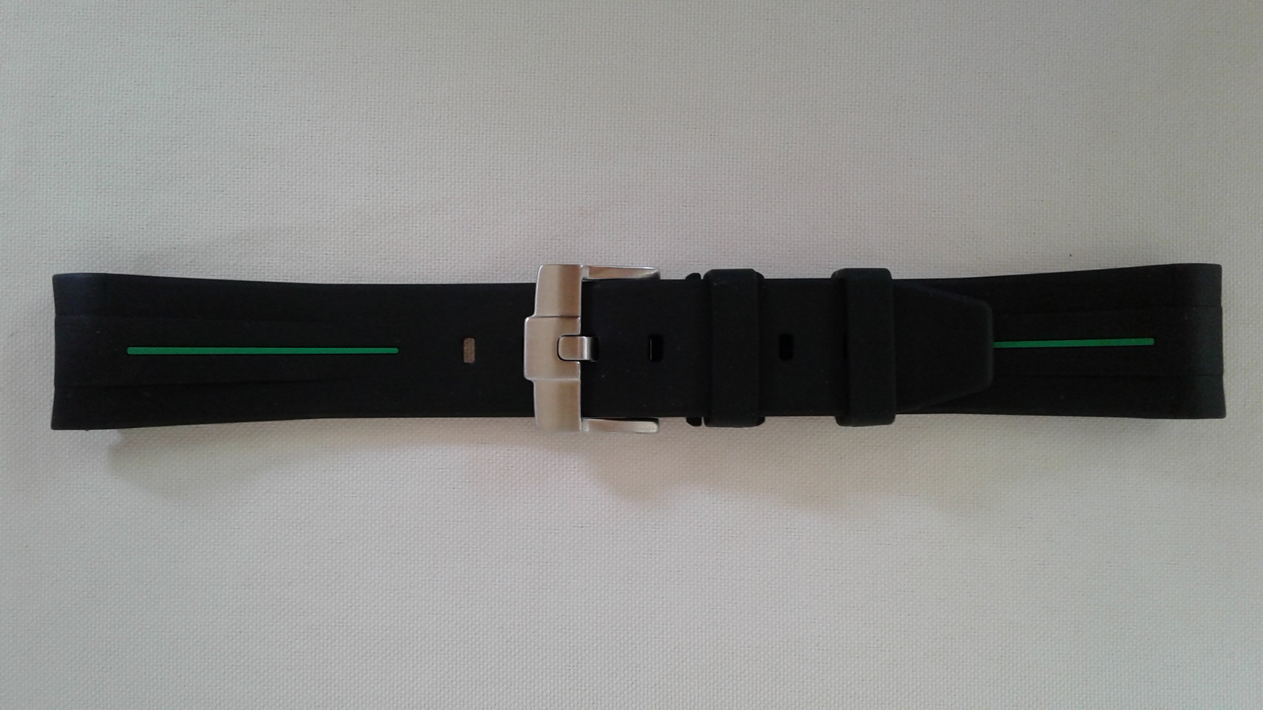 I have for sale a RubberB strap, the ultimate rubber strap in black rubber and green vulchromatic line with the SS tang/pin buckle. This model is made for the Rolex 16570 Explorer II and fits the 40mm case curve perfectly. It is in as new condition, no scuffmarks or other markings on the rubber or SS tang buckle. It comes with the black envelope, care instructions, invoice (28-2-2020) addressed to me and all else shown in the picture.