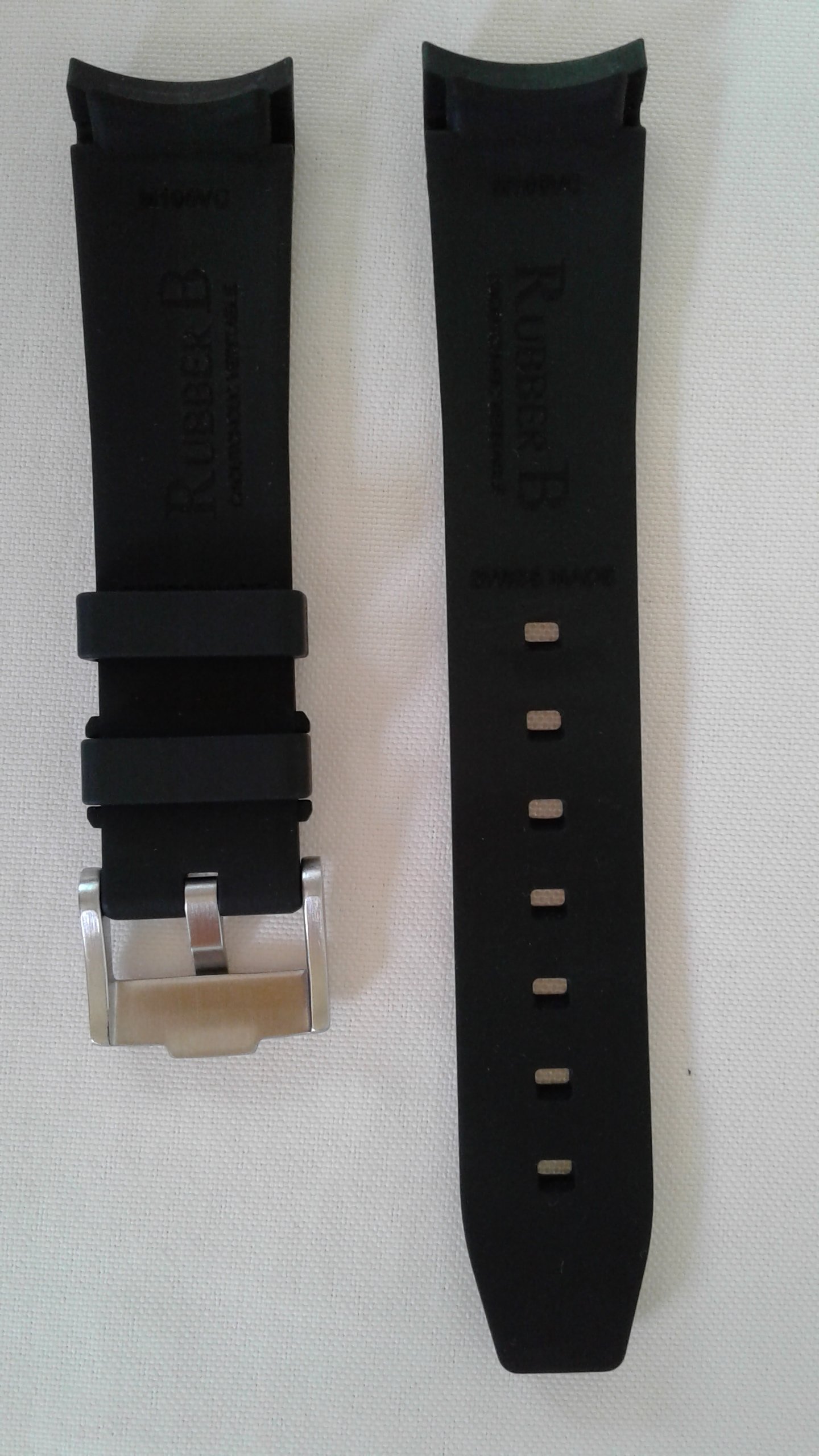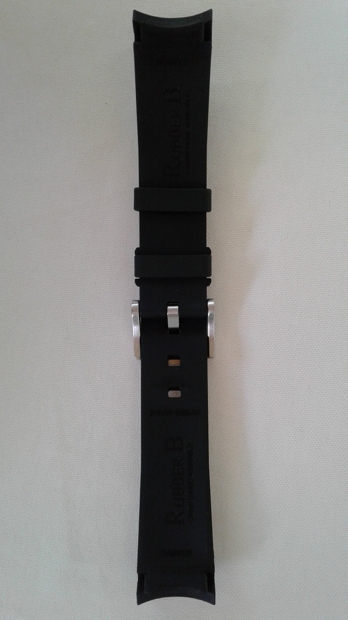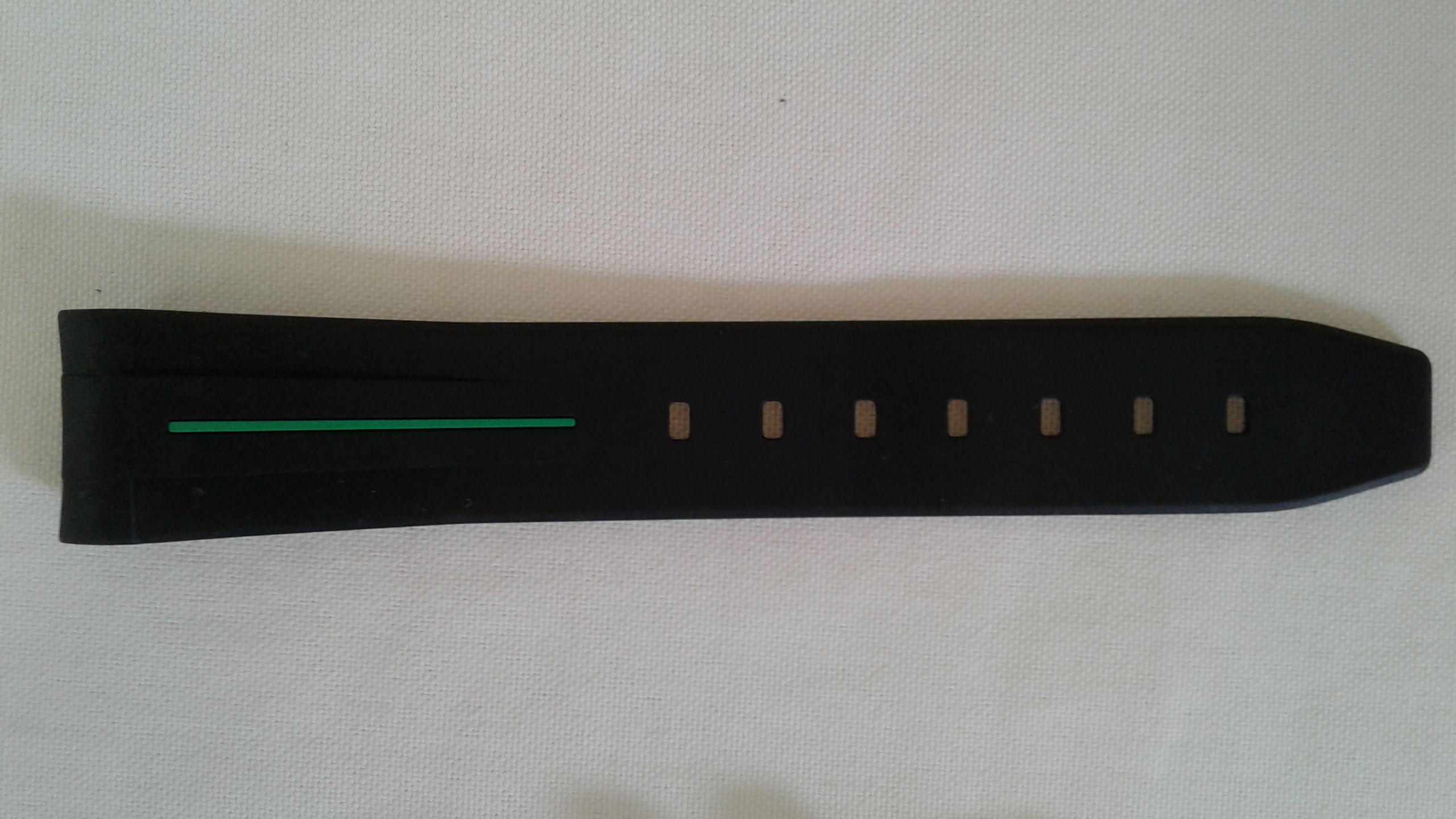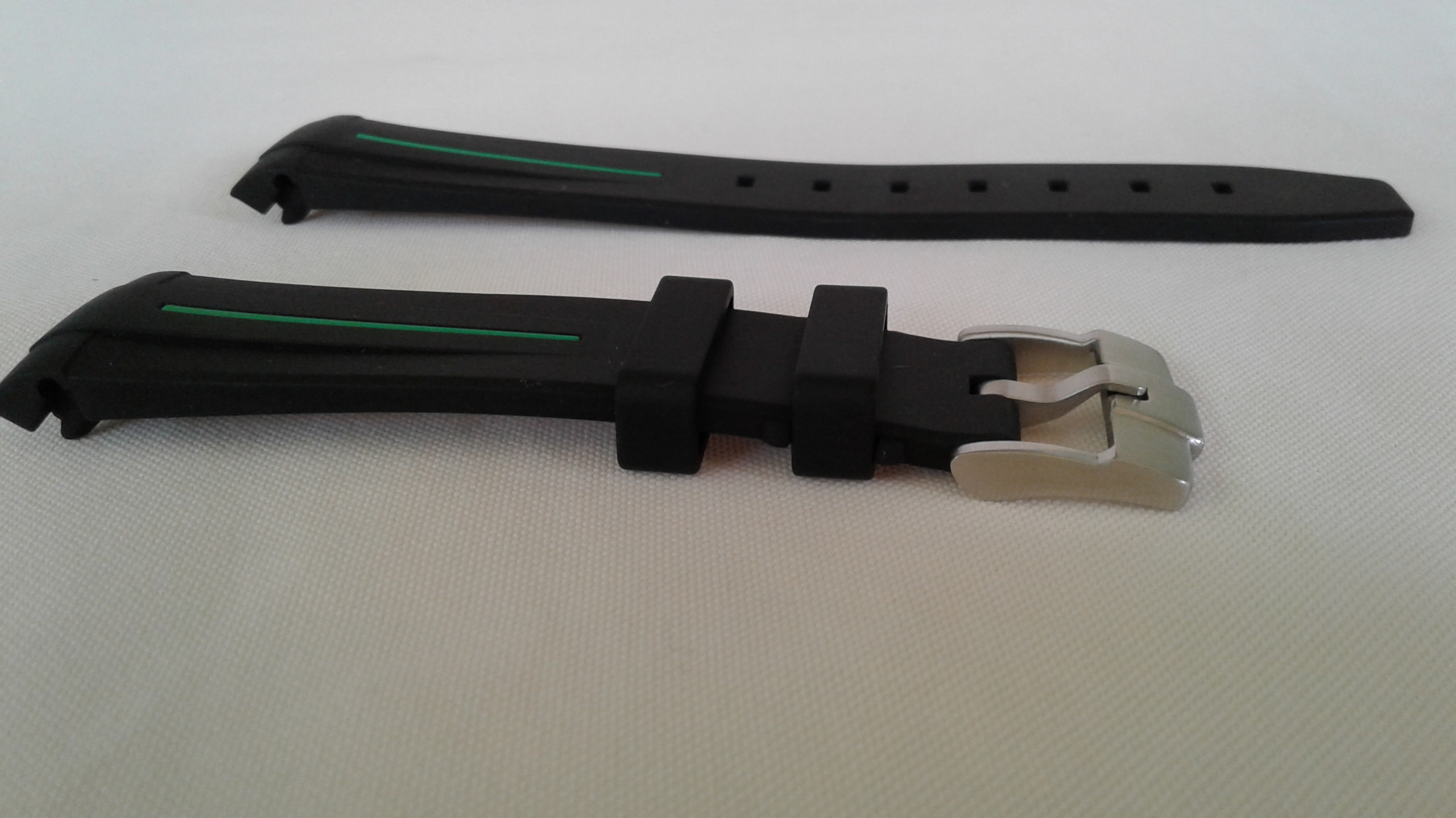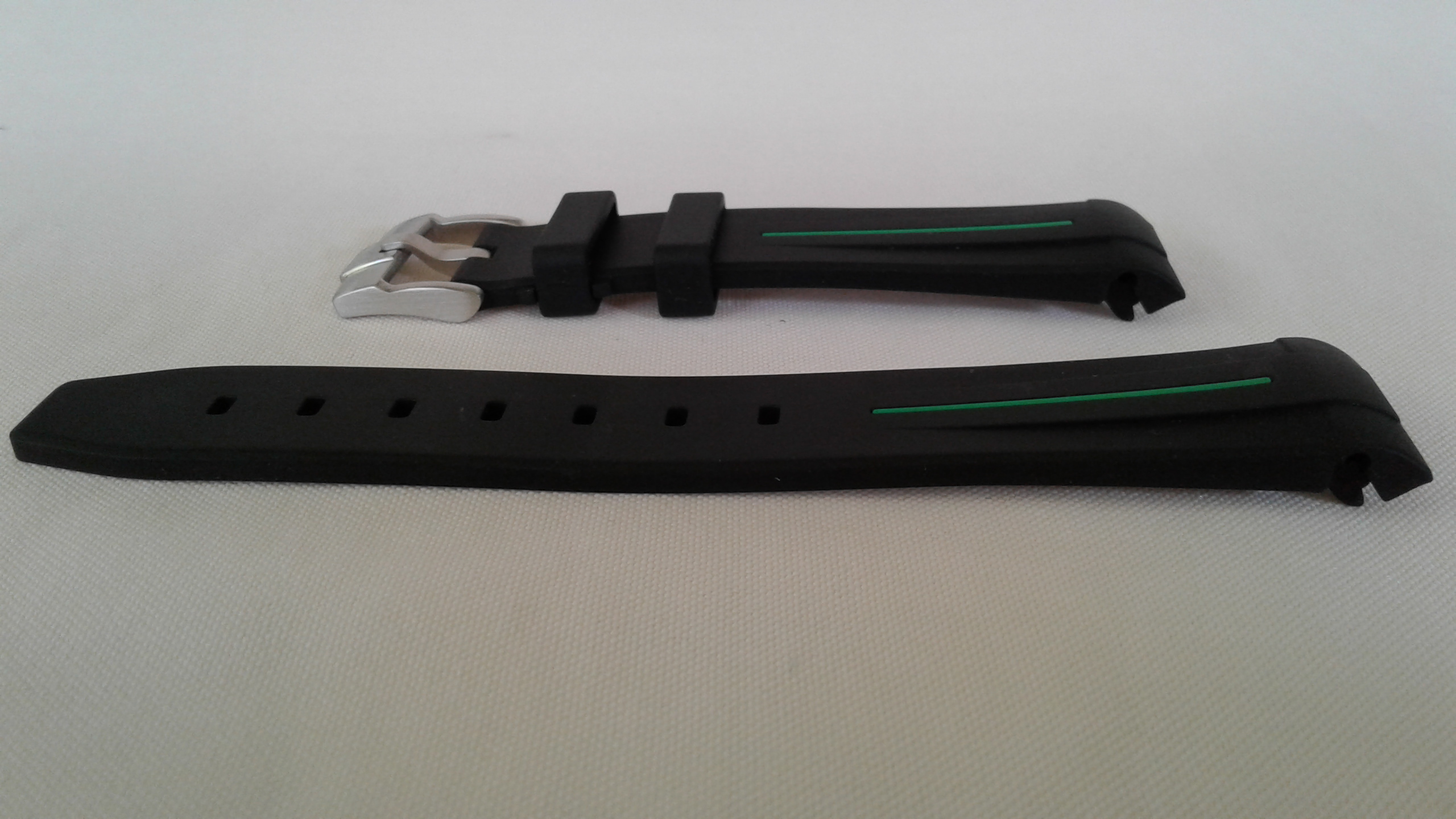 I have for sale a RubberB strap, the ultimate rubber strap in black rubber and green vulchromatic line with the SS tang/pin buckle. This model is made for the Rolex 16570 Explorer II and fits the 40mm case curve perfectly. It is in as new condition, no scuffmarks or other markings on the rubber or SS tang buckle. It comes with the black envelope, care instructions, invoice (28-2-2020) addressed to me and all else shown in the picture.