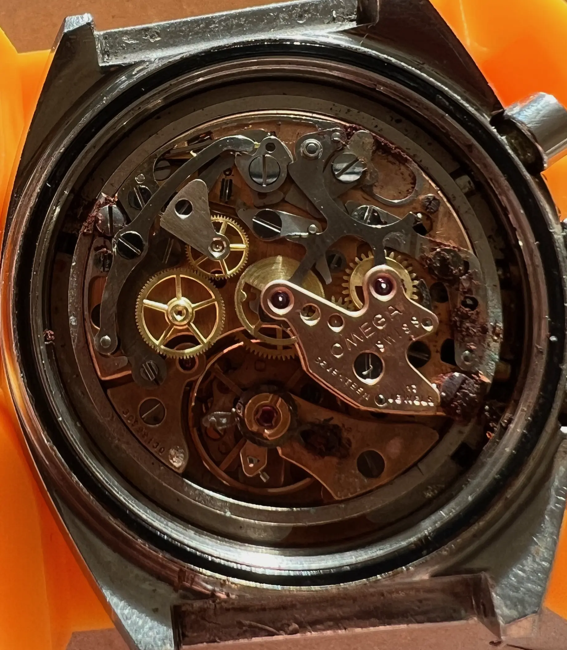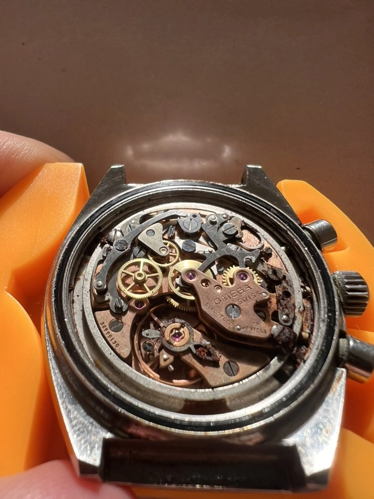 I recently picked up a Speedmaster MKII from Japan. The movement looks in really rough shape (not currently running - ran for about 10m with chrono function working, and then stopped, stuck fully wound). I took some pictures of the corrosion. I'm amazed it ran at all.