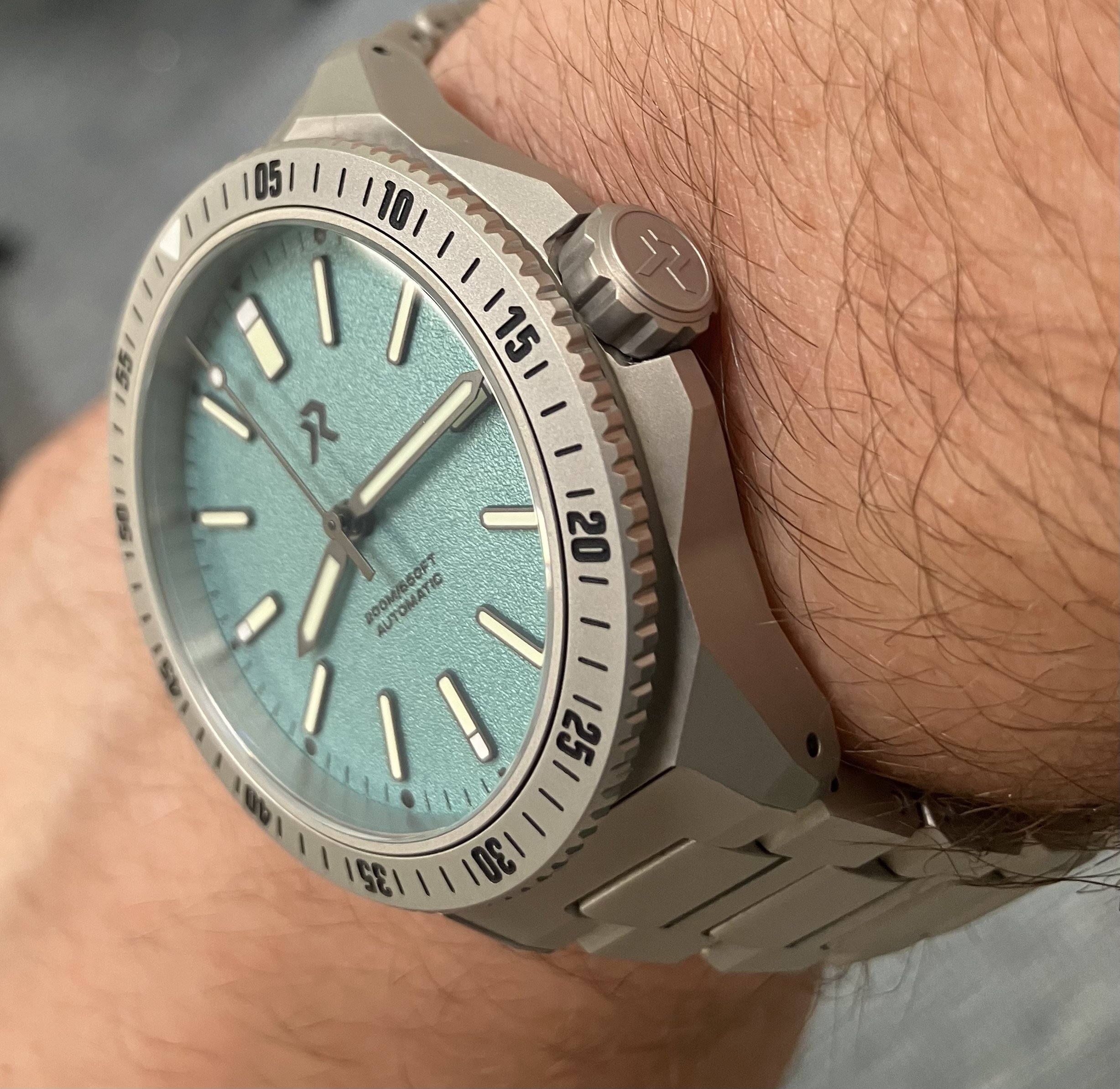 It's a tool-ish, industrial-looking watch: not a polished surface to be found, and the coated titanium is very matte, as is the -textured "azure" blue dial. (I wanted something fun and summery.) The bezel is also titanium, and the action is what you'd expect at this price-point: tactile, "clicky," and a bit resistant, but also precise with no discernible play, and easy to grip. The branded screw-down crown has little wobble to it (which has been a problem for me with other micro-brand watches), and winding is easy and smooth. The Seiko-based movement keeps superb time: a rough estimate, but I'd say about minus 3 seconds a day. (Better than some of the Omegas I've owned! The NH38A isn't rated for that, but my watch seems to have been well regulated.)