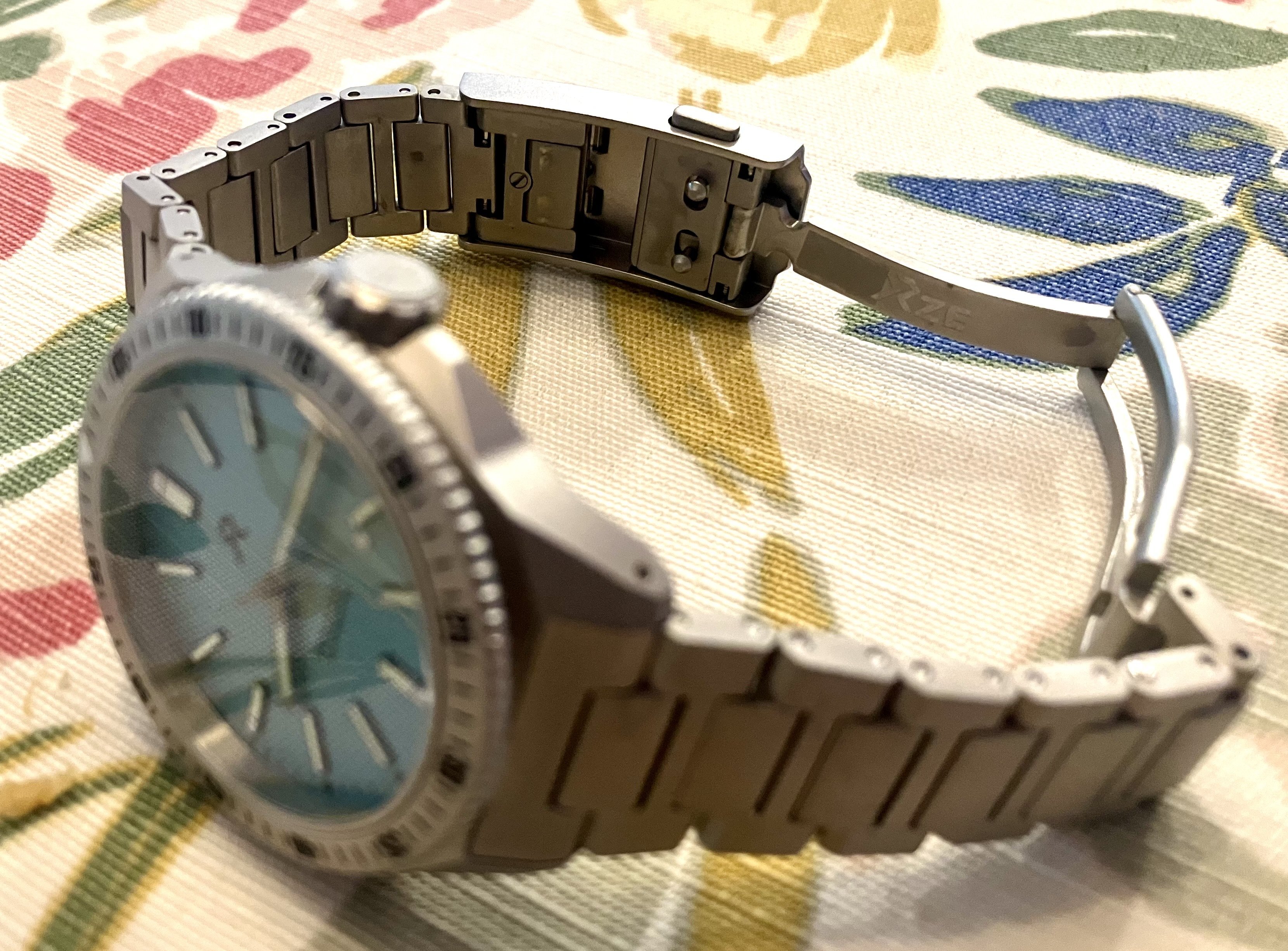 - Solid Titanium bracelet with on-the-fly quick adjust clasp and quick release springbars)