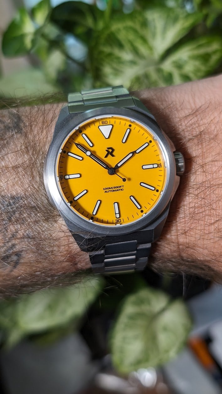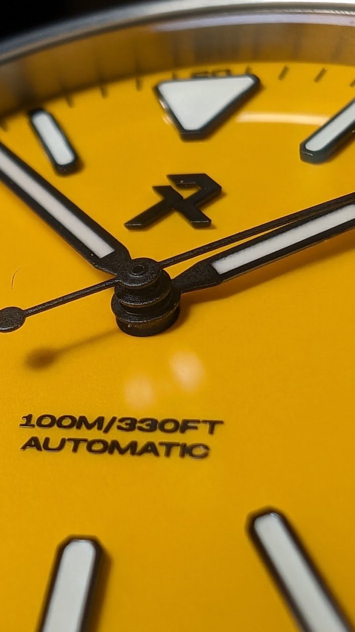 The dial is simplicity: no date, just a three-hander, with white lumed hands and applied indices that glow brightly in green and blue (which you can see to full effect on RZEs site, linked above): I'd say it's downright impressive how legible the watch is in the dark, and the lume glows all night. The dial has a subtle, pebbly texture, but nothing that calls attention to itself, and there is minimal dial text, which is what I prefer. The solid titanium caseback is also nice and plain: just some basic branding and spec info around the circumference, but, like a Rolex, mostly a blank canvas for engraving.