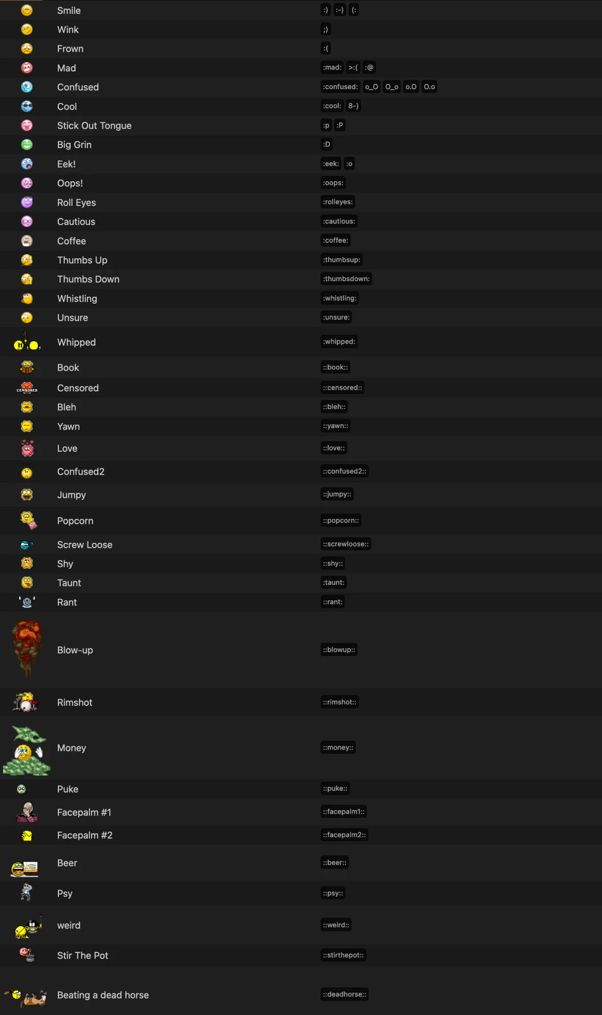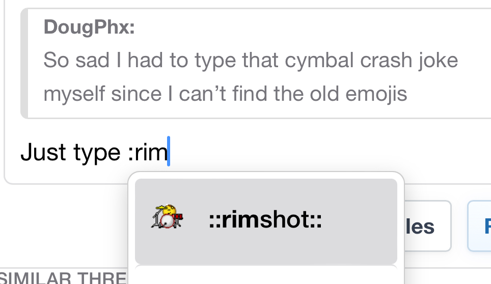 They aren’t available if you’re using the forum on your phone, but if you’re using a desktop they are still there. If you’re on mobile, type what you see in my screenshot and the emoji will show up.