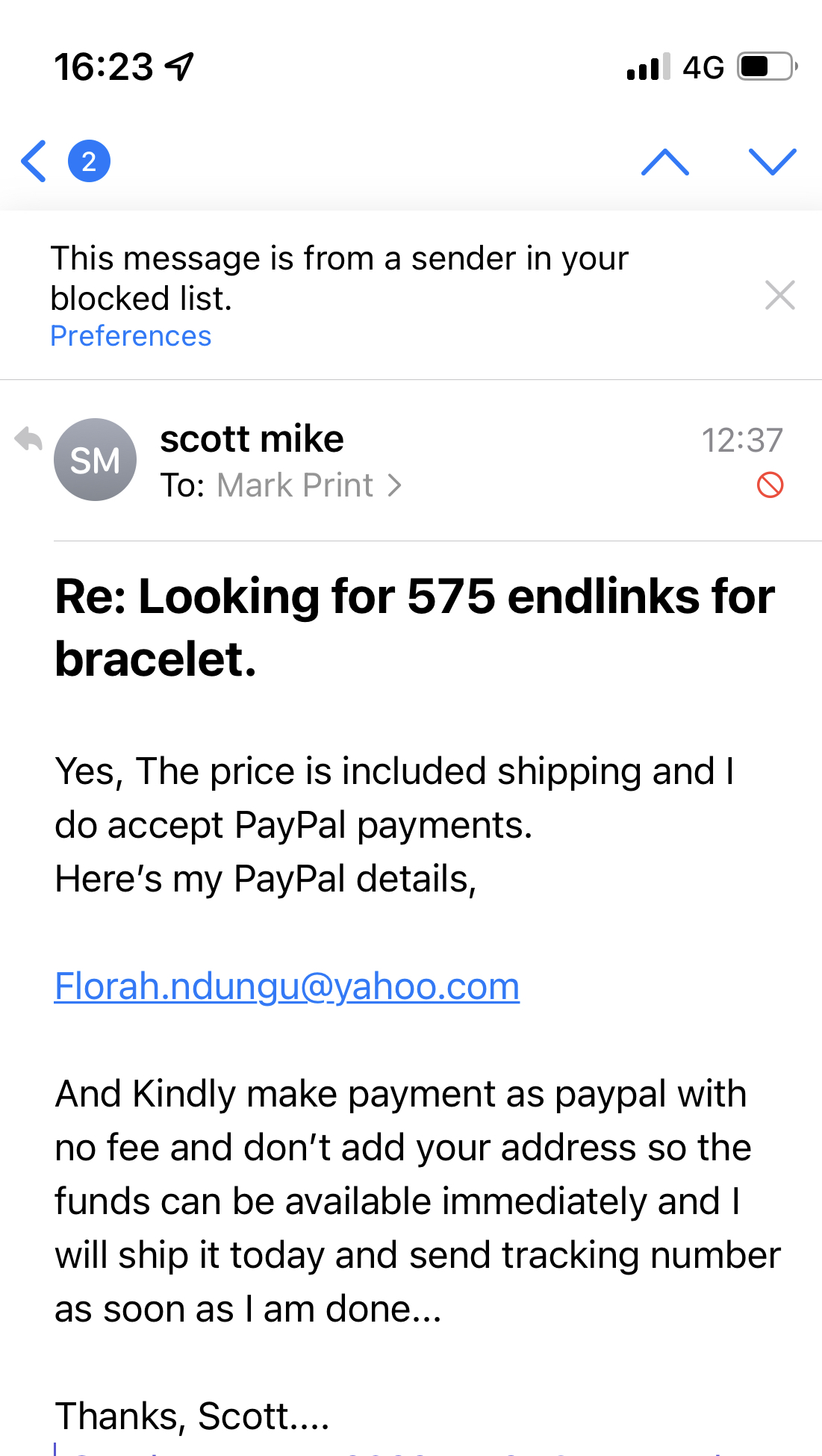They quickly replied saying to pay with no fee, nor address so they could access money quickly and the Paypal name seemed against odds with who I thought I was dealing with.