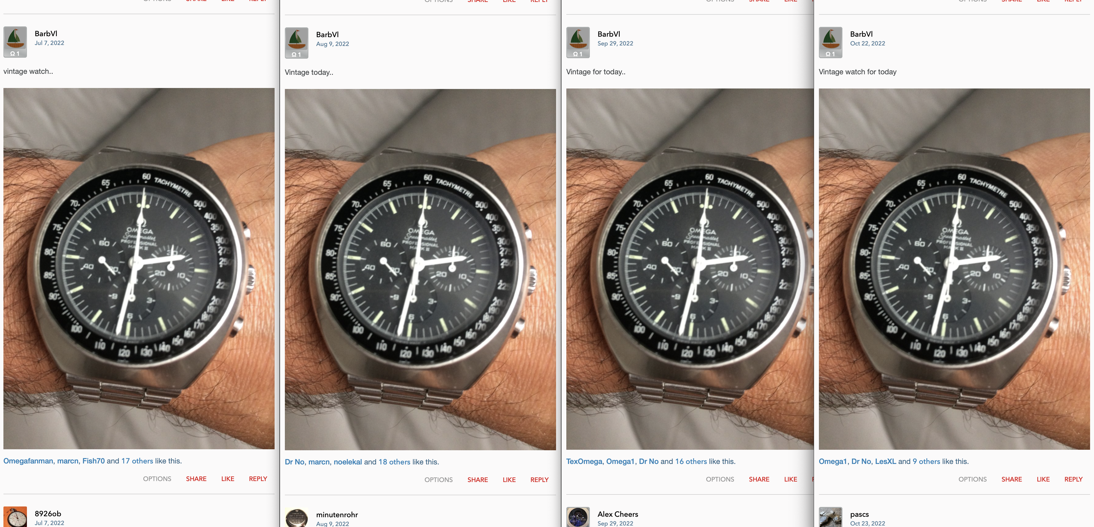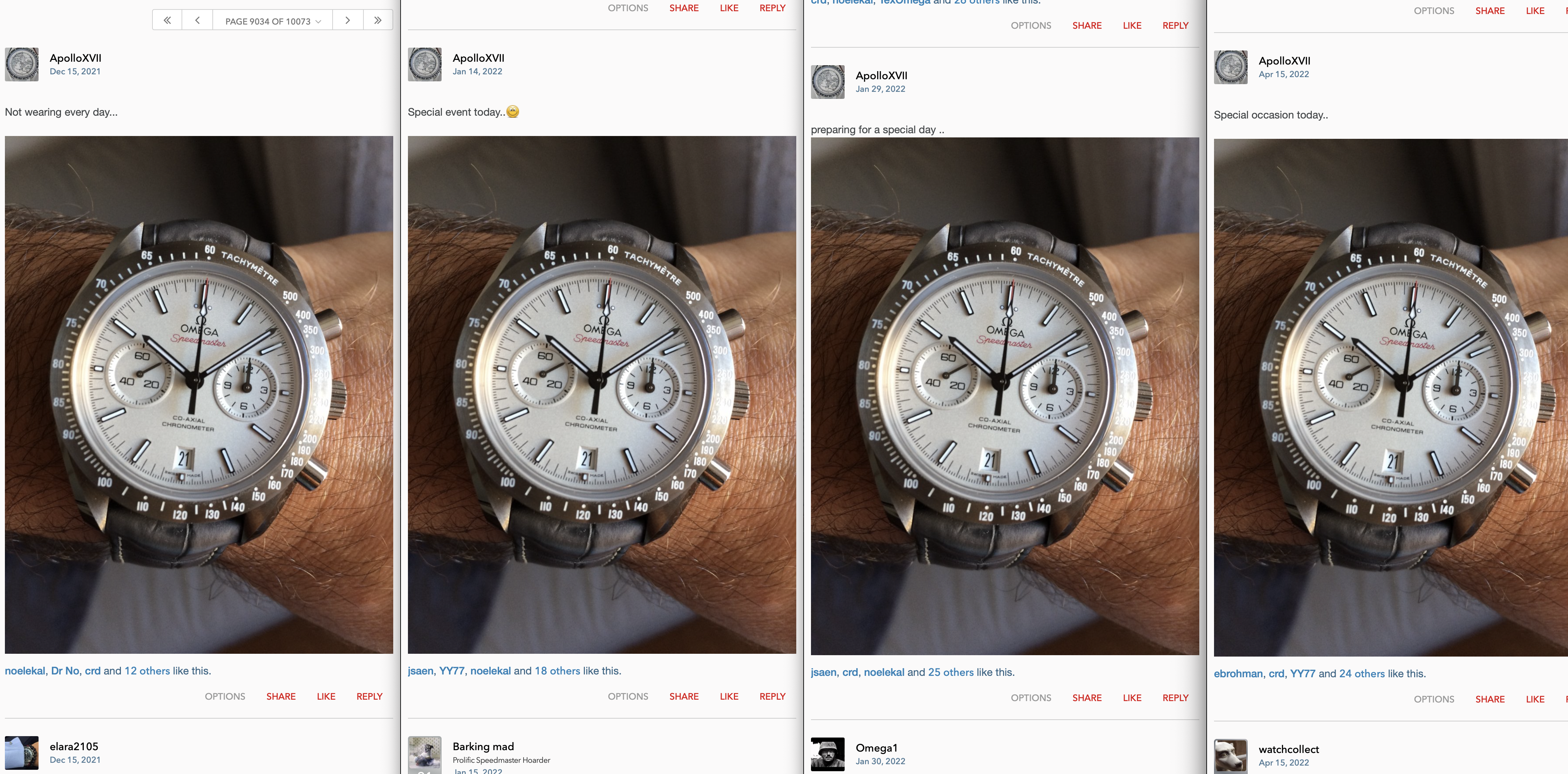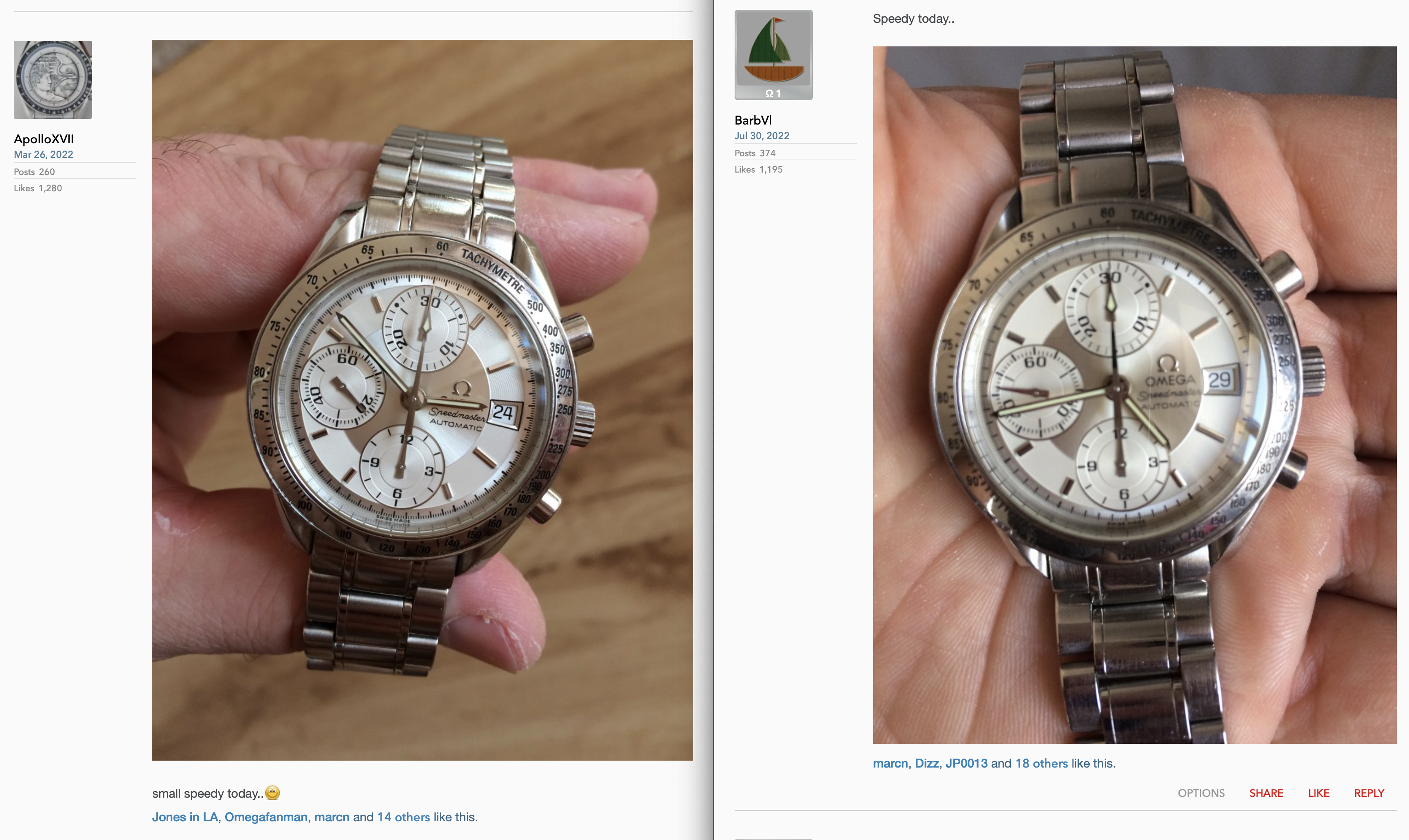 Both ApolloXVII and @BarbVl lazily recycled the same handful of watches far beyond four times each, but listing all would make this far too long. The similarities extend beyond the fact that both ApolloXVII and @BarbVl share the same arm. Again, not going to list them all.