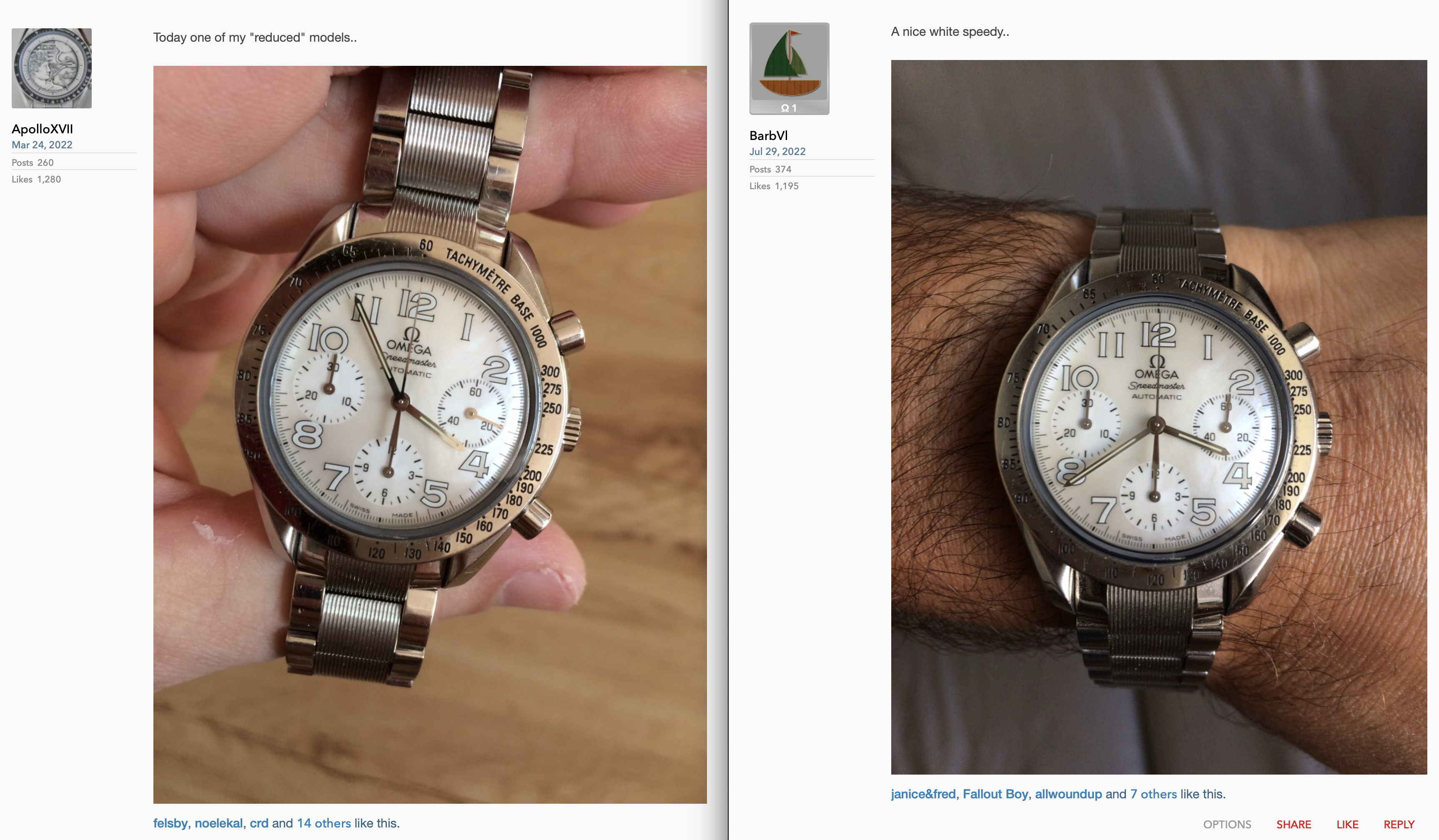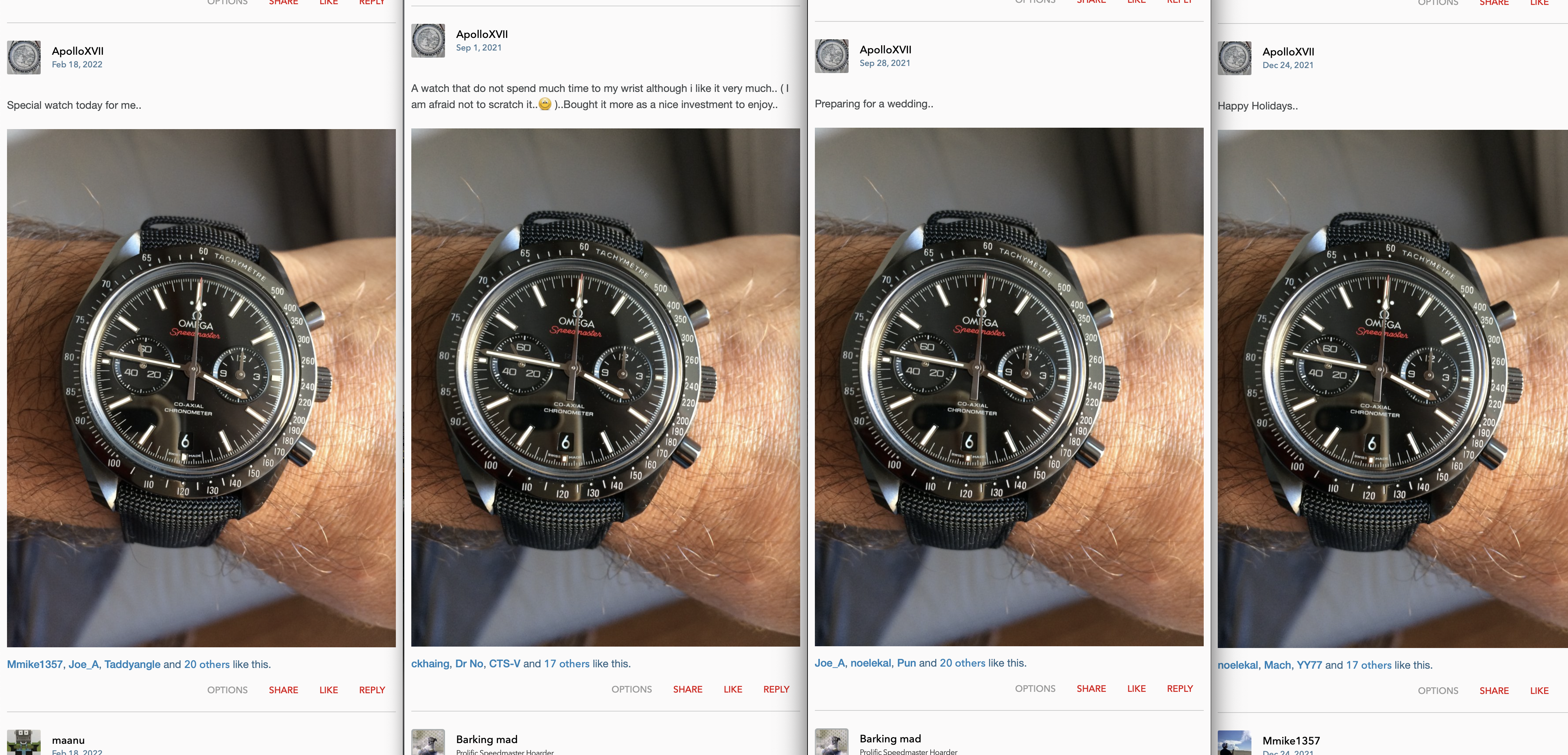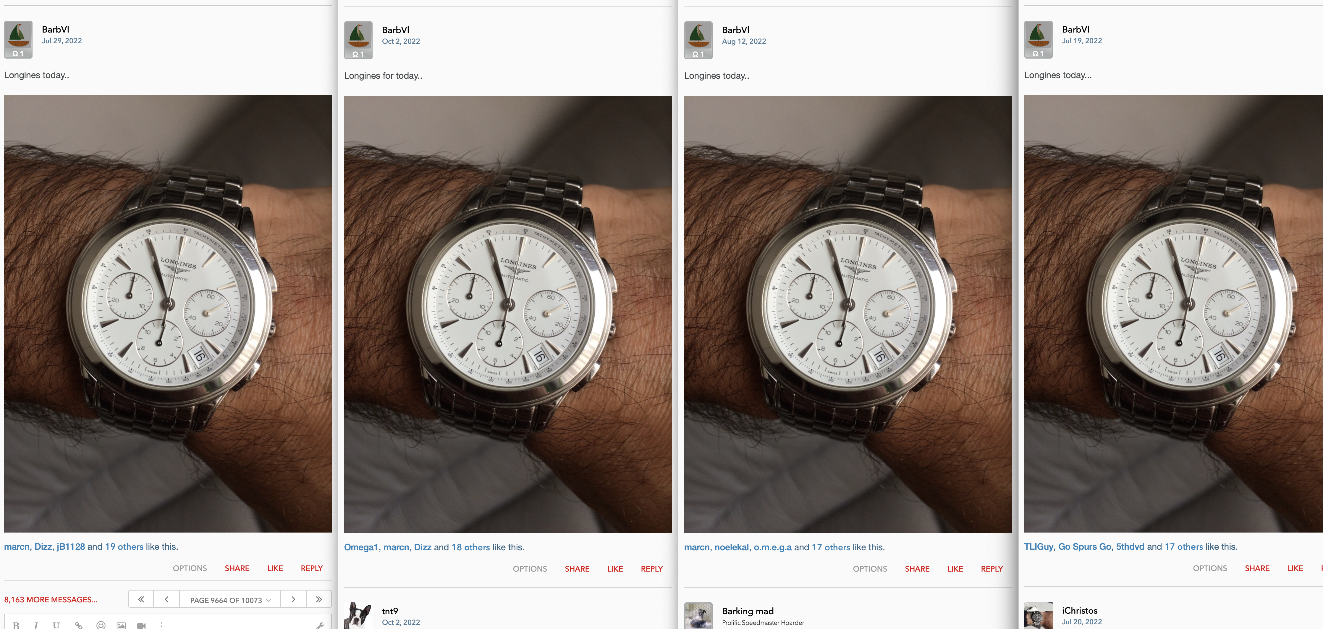 Both ApolloXVII and @BarbVl lazily recycled the same handful of watches far beyond four times each, but listing all would make this far too long. The similarities extend beyond the fact that both ApolloXVII and @BarbVl share the same arm. Again, not going to list them all.