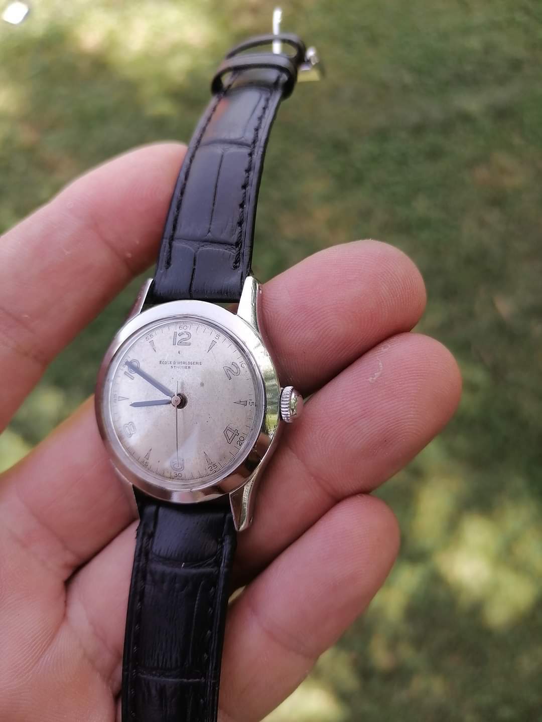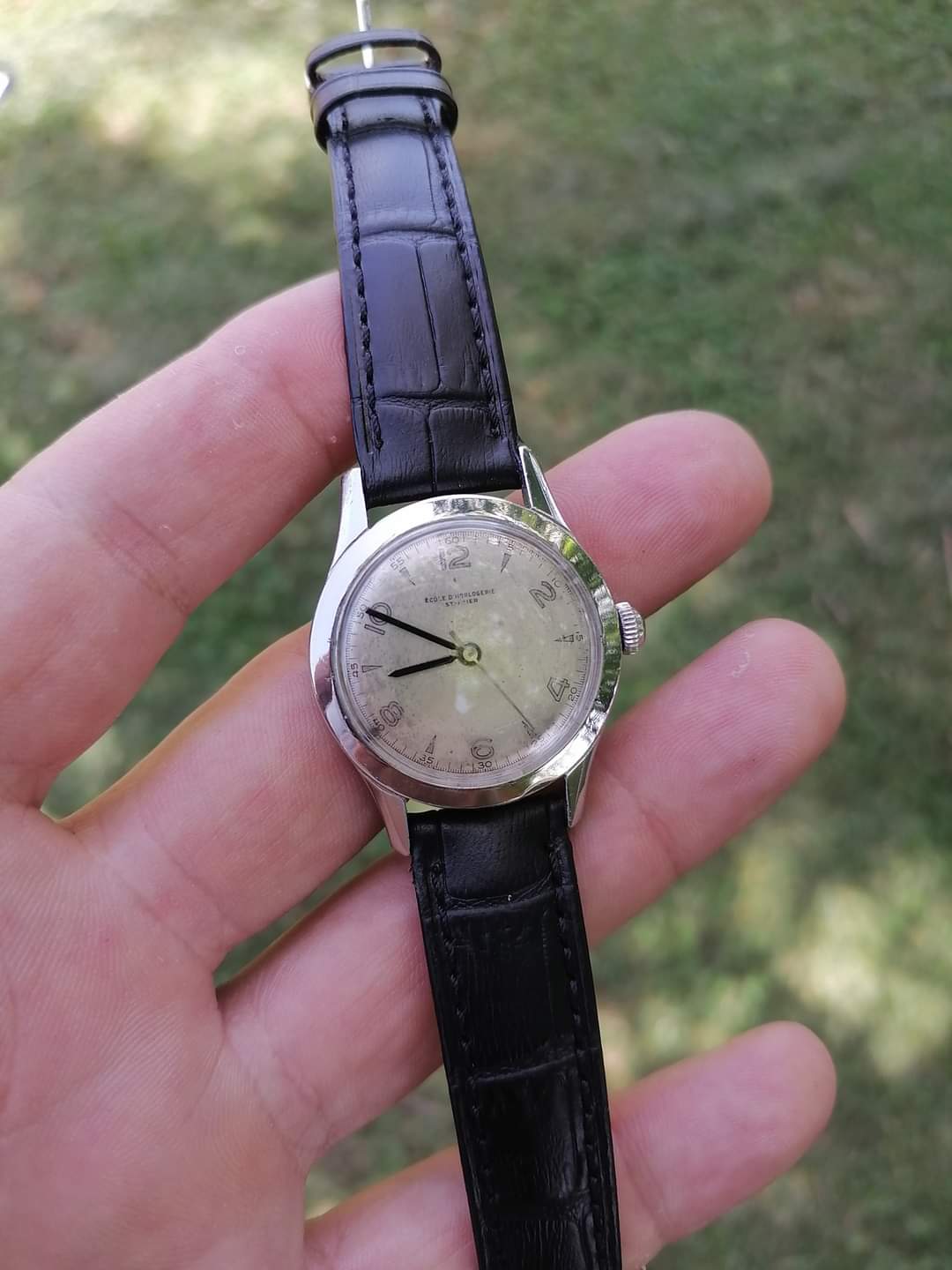 Dial says "Ecole d'Horologerie St. Imier". Not in great condition but I can live with that.
