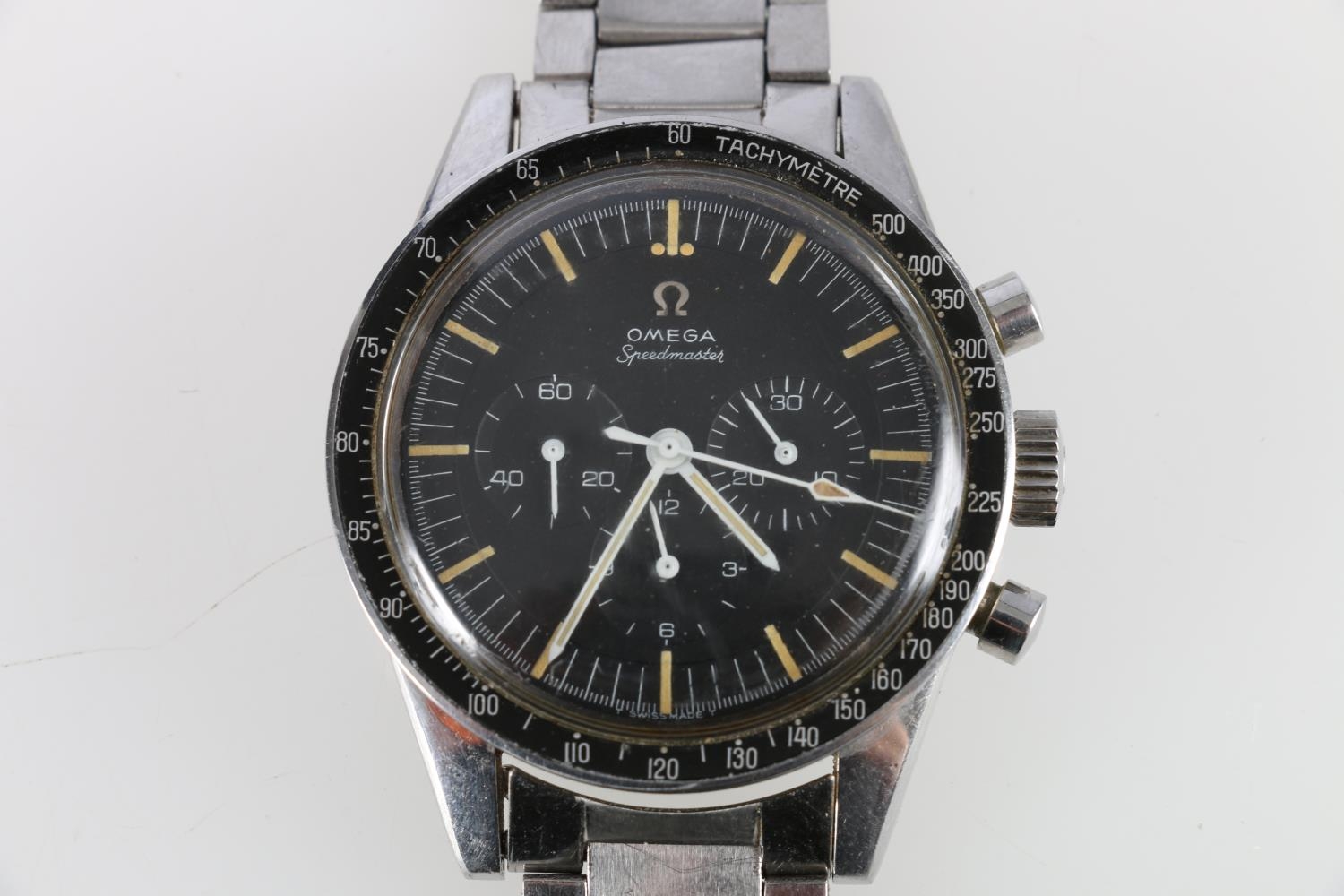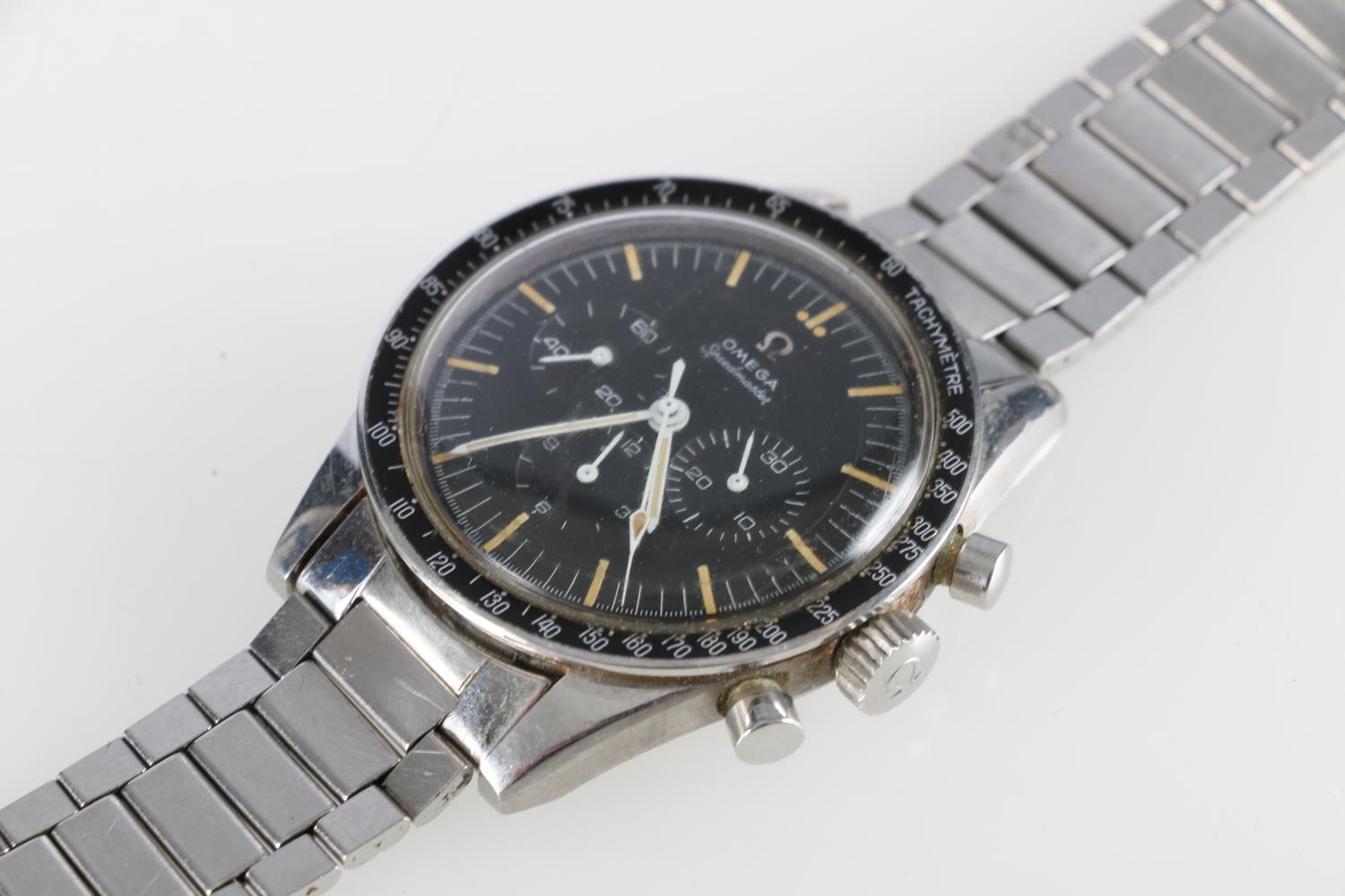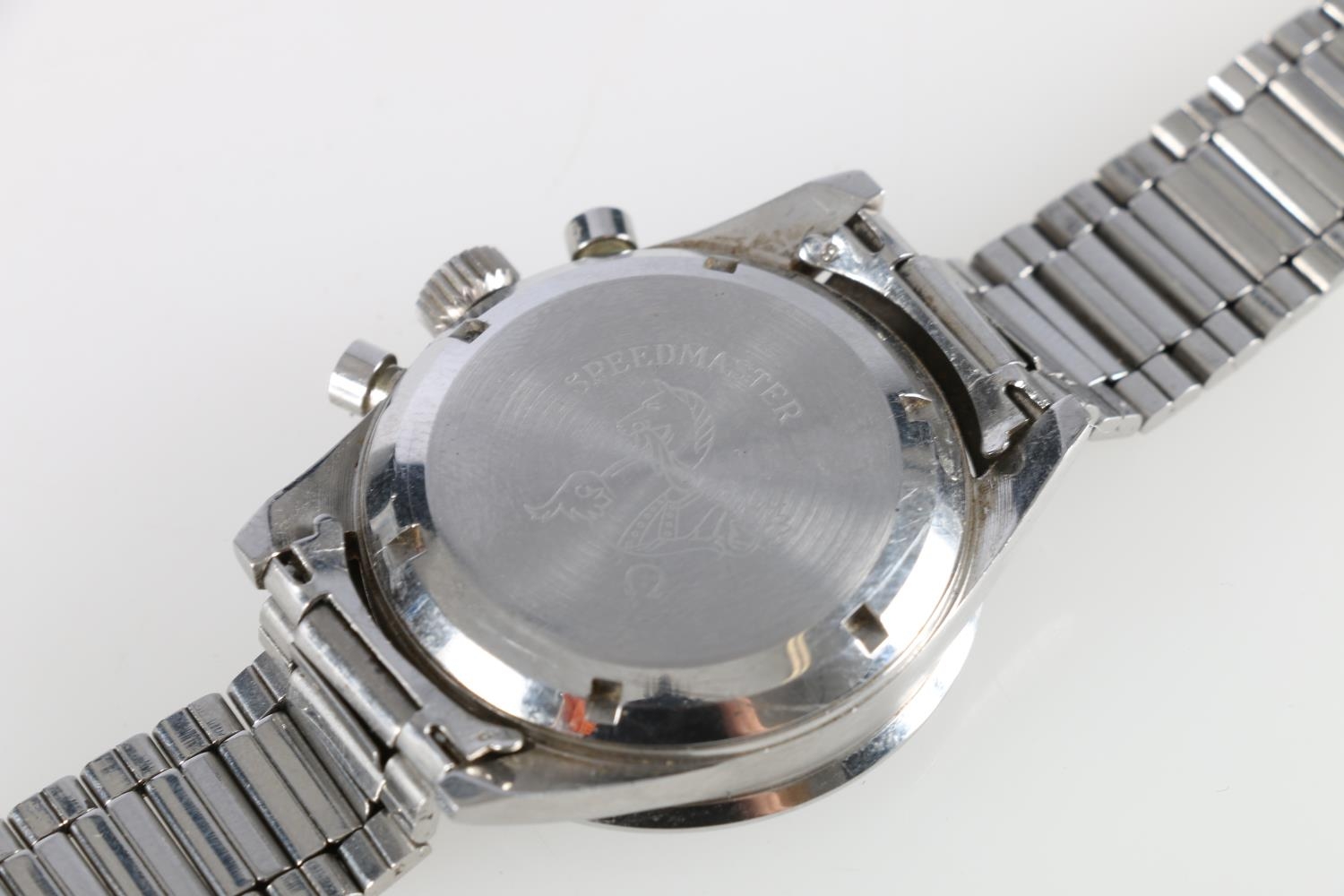 Gents Omega Speedmaster Moon type stainless steel cased wristwatch, the black dial with three subsidiary dials, on stainless steel bracelet