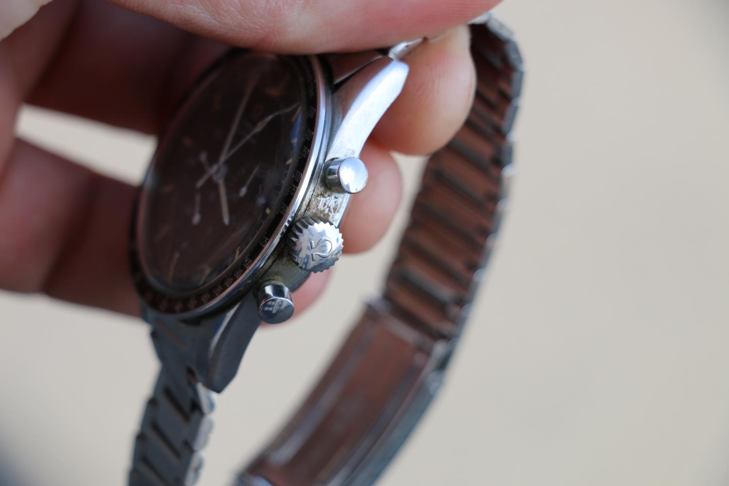 Watch glass scuffed in places. Bezel worn slightly to outer edge. Watch goes but chronograph appears stuck. Dirty between crown and buttons. First 2 watch links from watch appear out of shape or dented. See images.