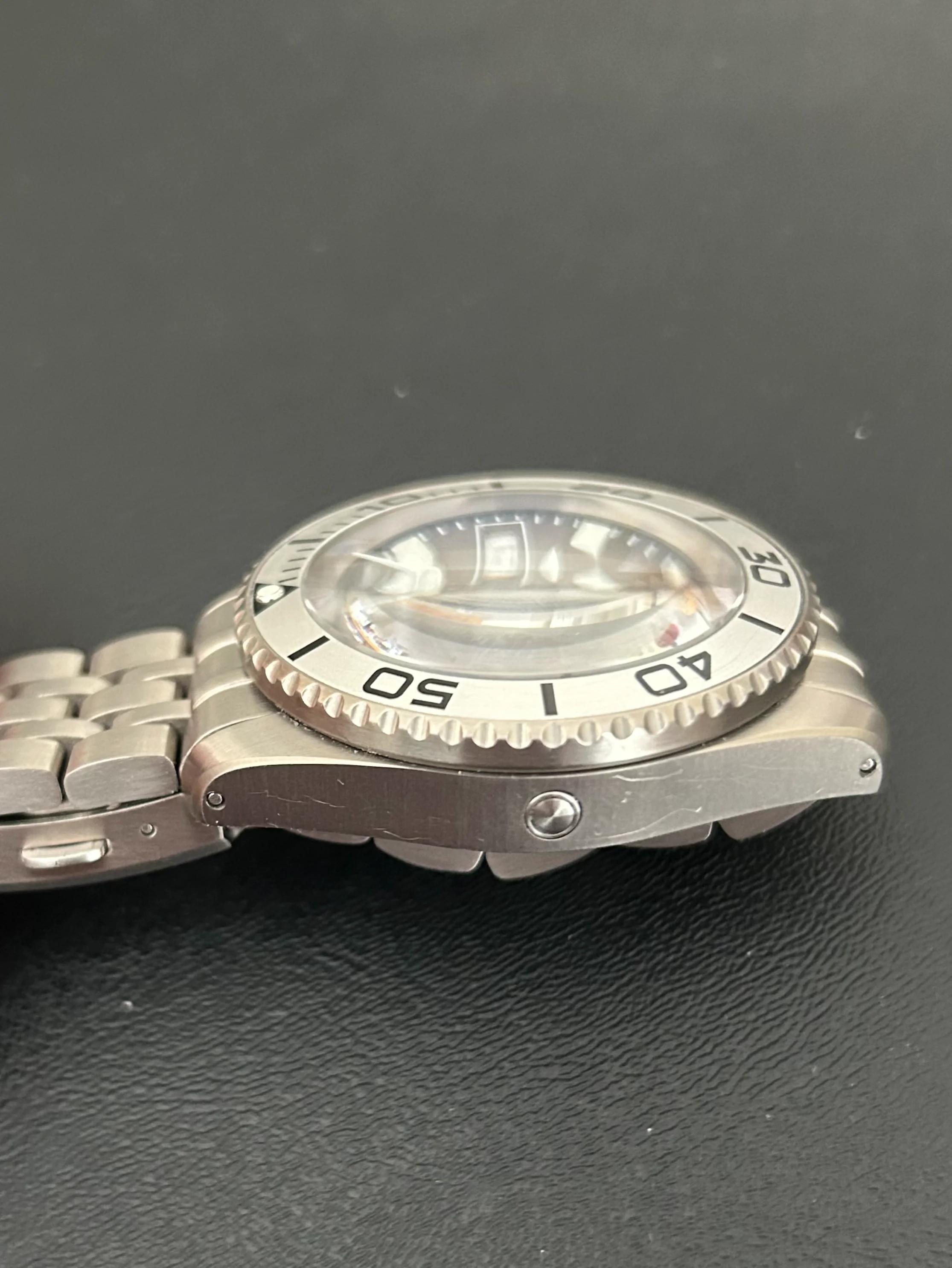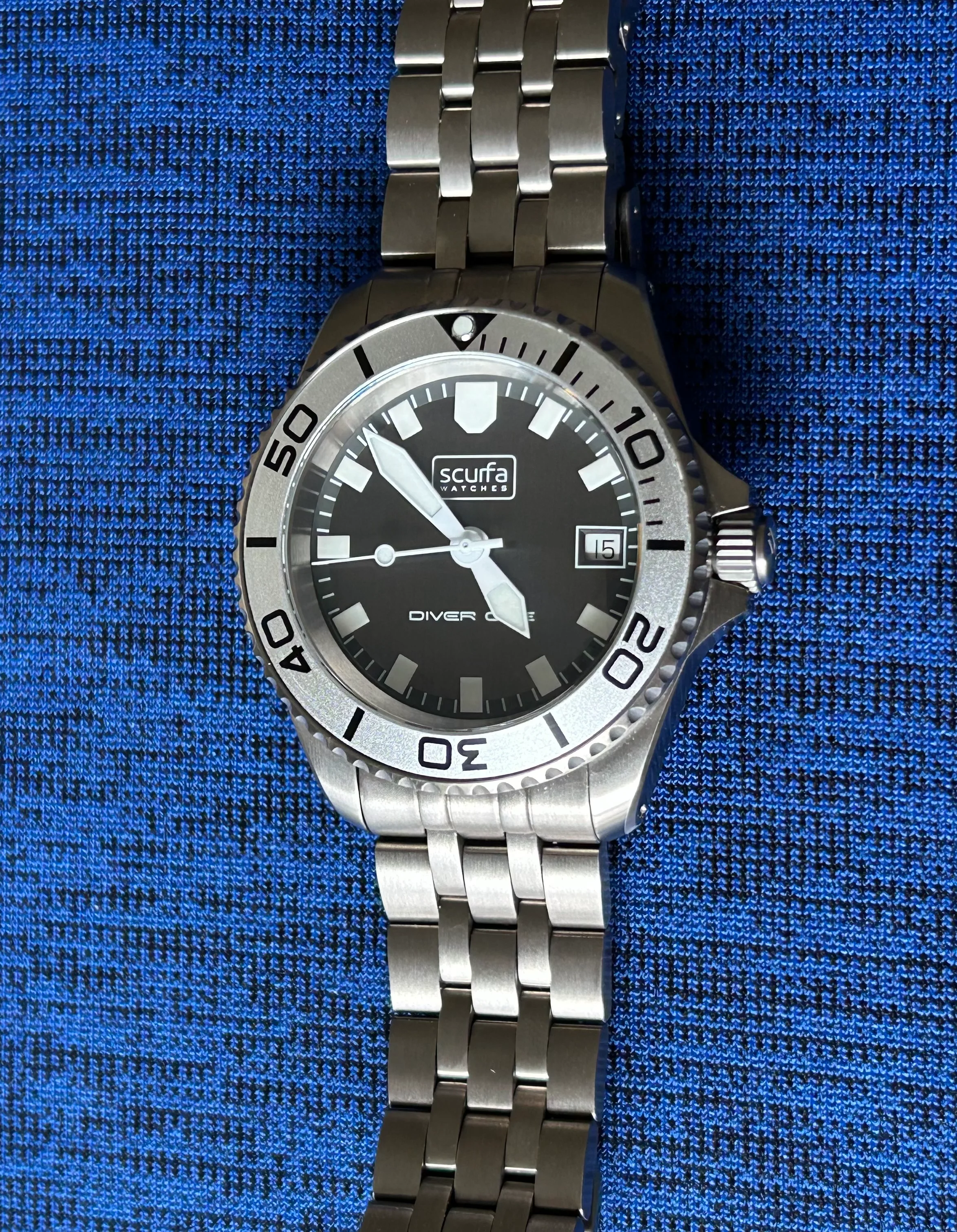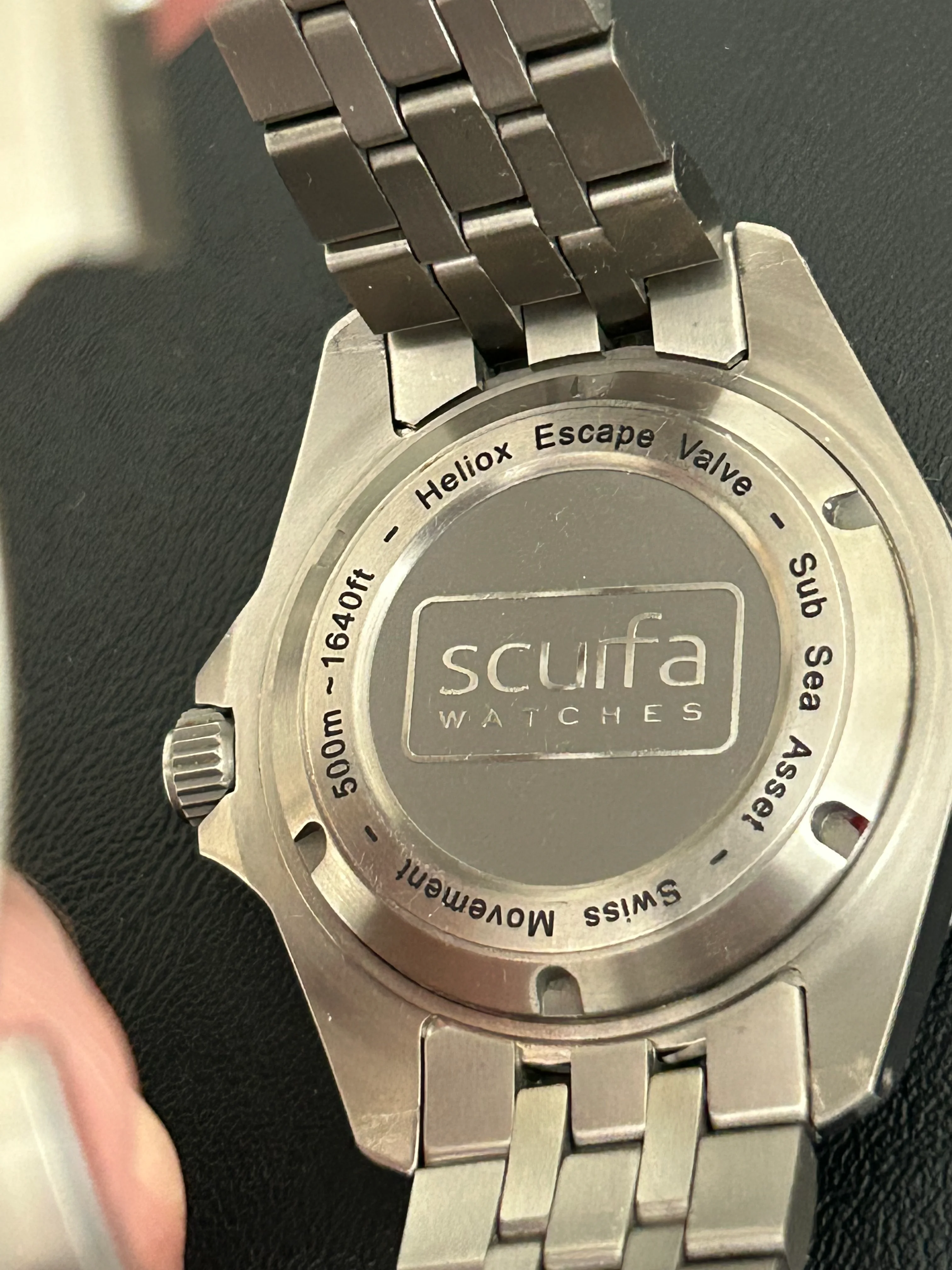 The first owner had swapped the original black bezel insert for an aluminum insert from another Scurfa model, but otherwise it’s all original.