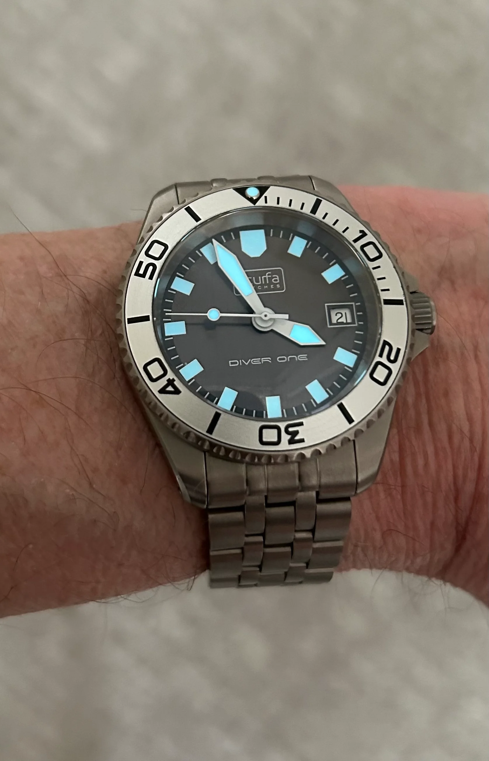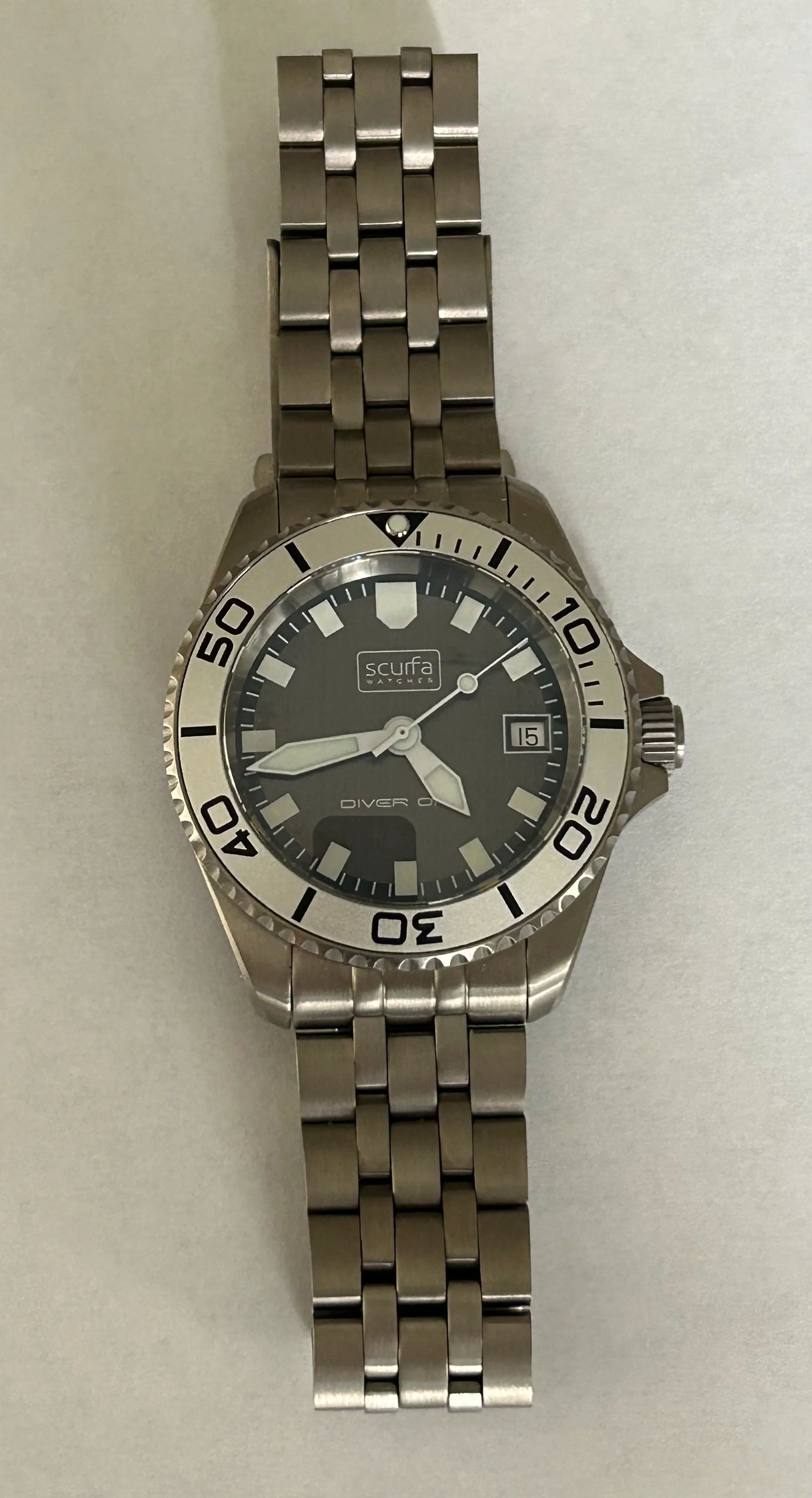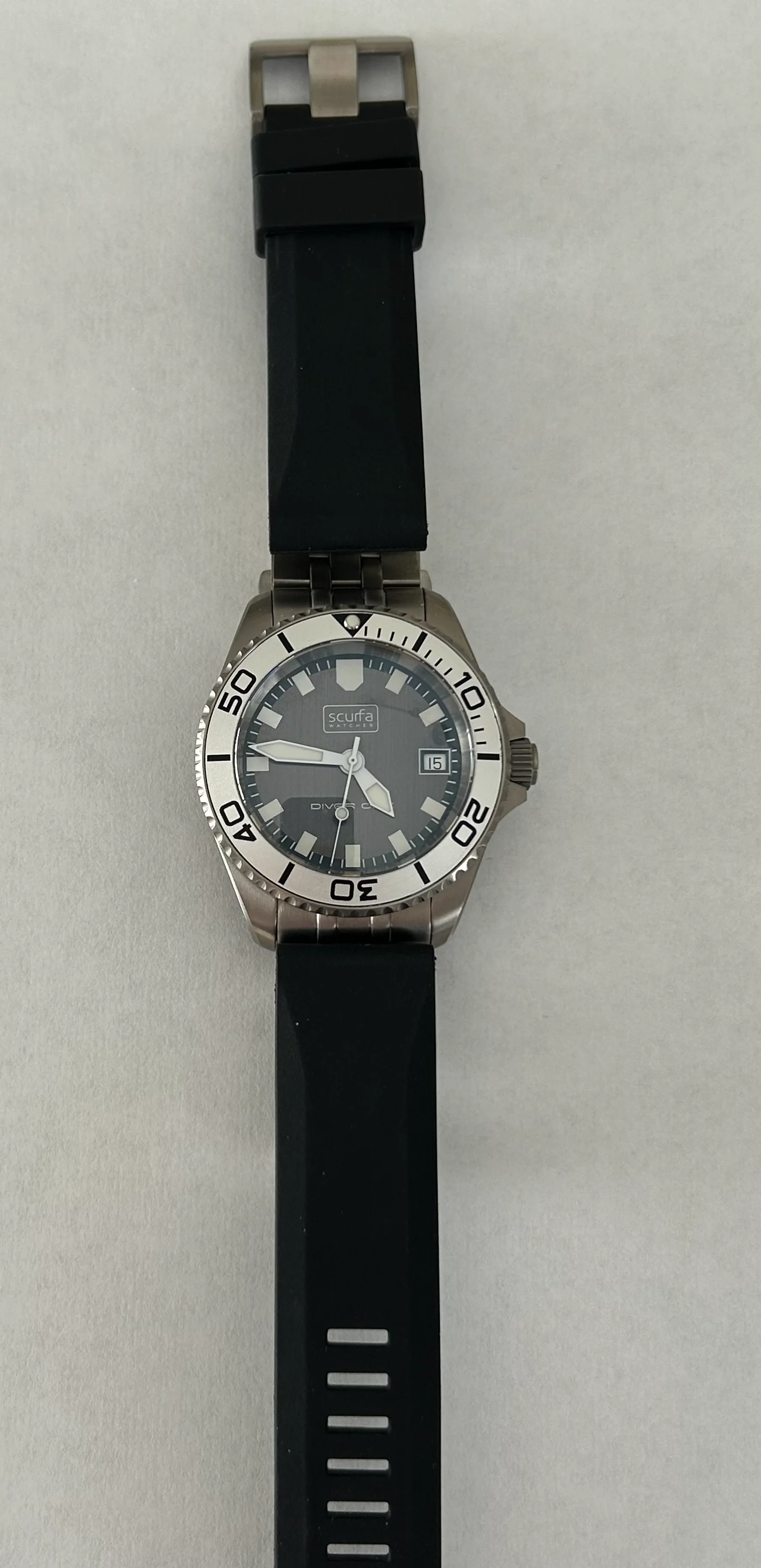 Comes with original black rubber Scurfa strap with titanium buckle. Includes a grey Borealis strap, and a recently purchased Scurfa titanium bracelet, almost unworn. Sized for 183mm wrist, plus 3 additional 8mm links.