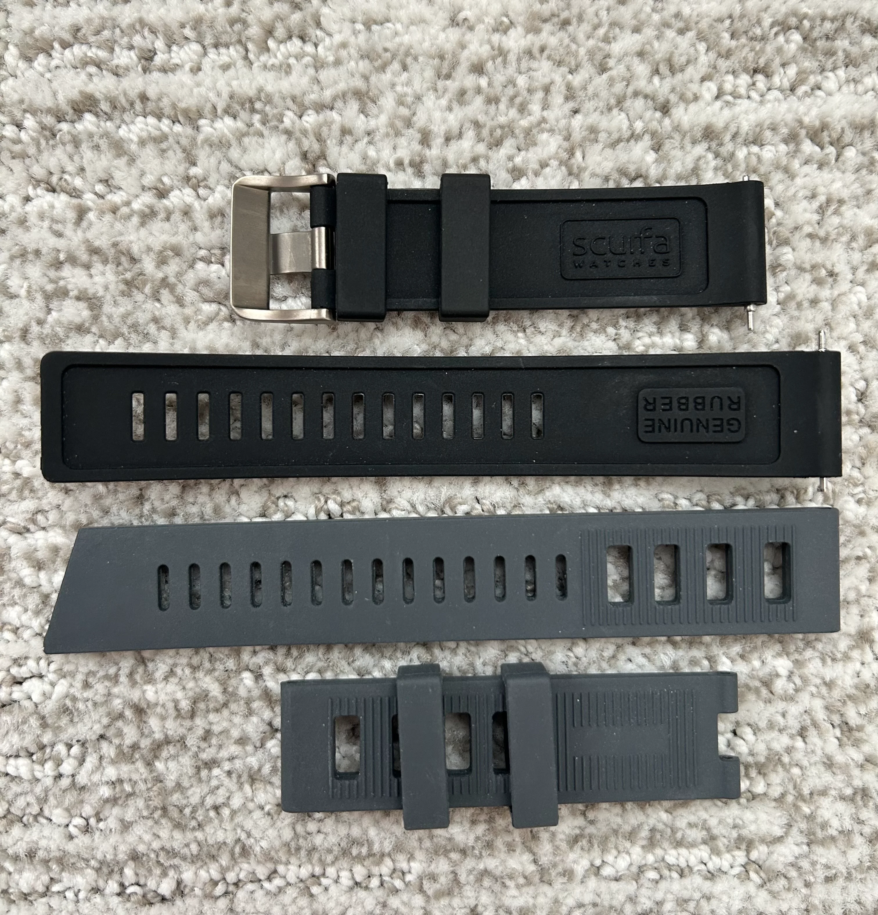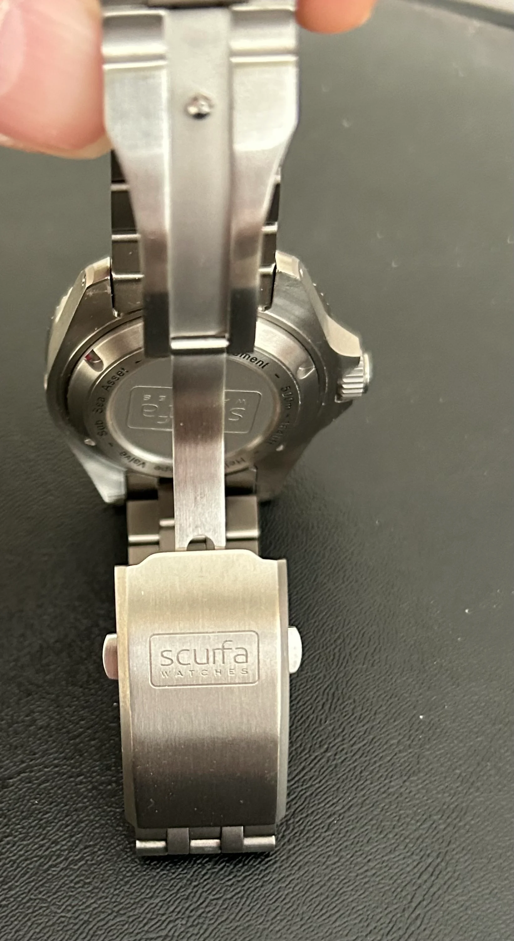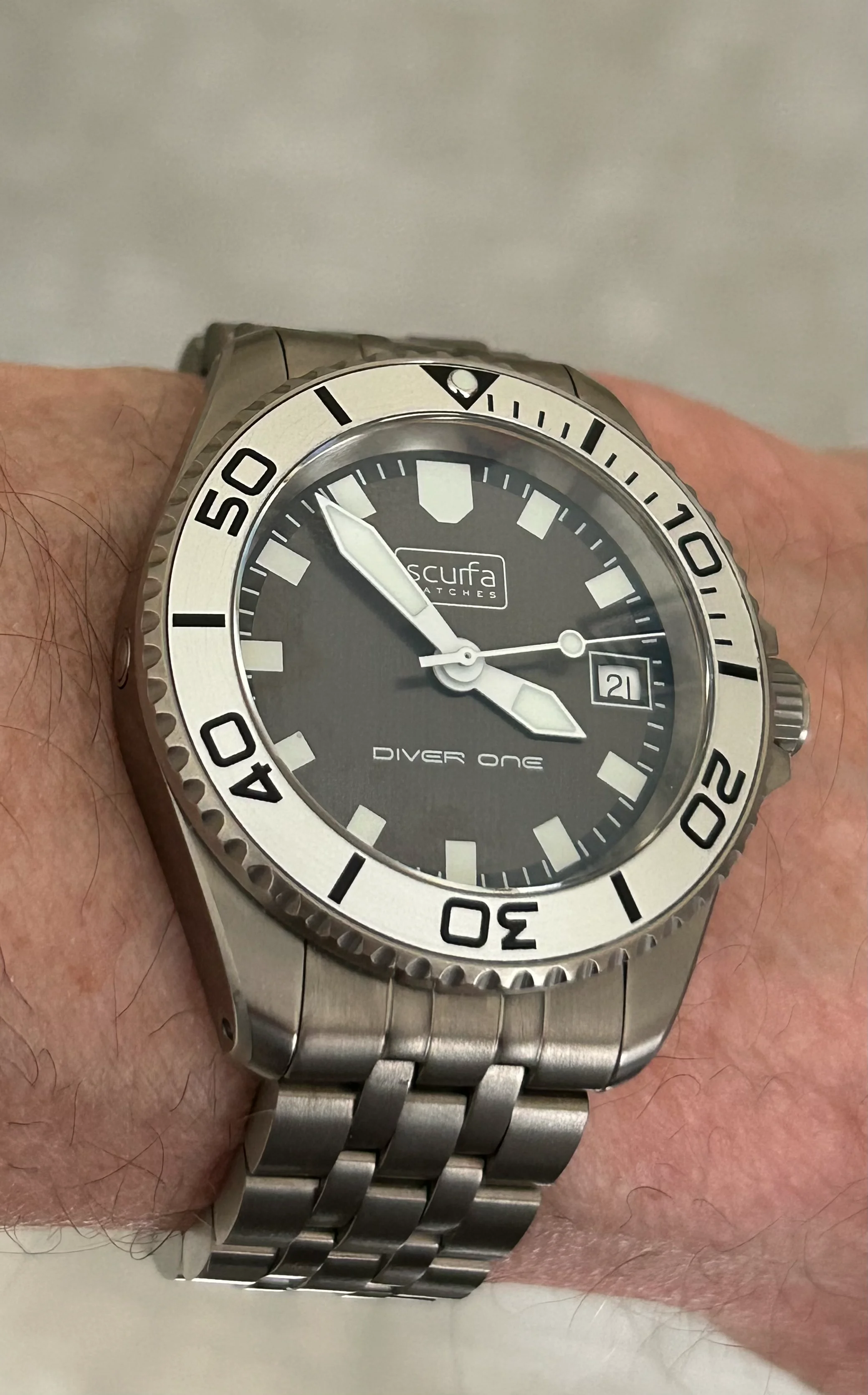 Comes with original black rubber Scurfa strap with titanium buckle. Includes a grey Borealis strap, and a recently purchased Scurfa titanium bracelet, almost unworn. Sized for 183mm wrist, plus 3 additional 8mm links.