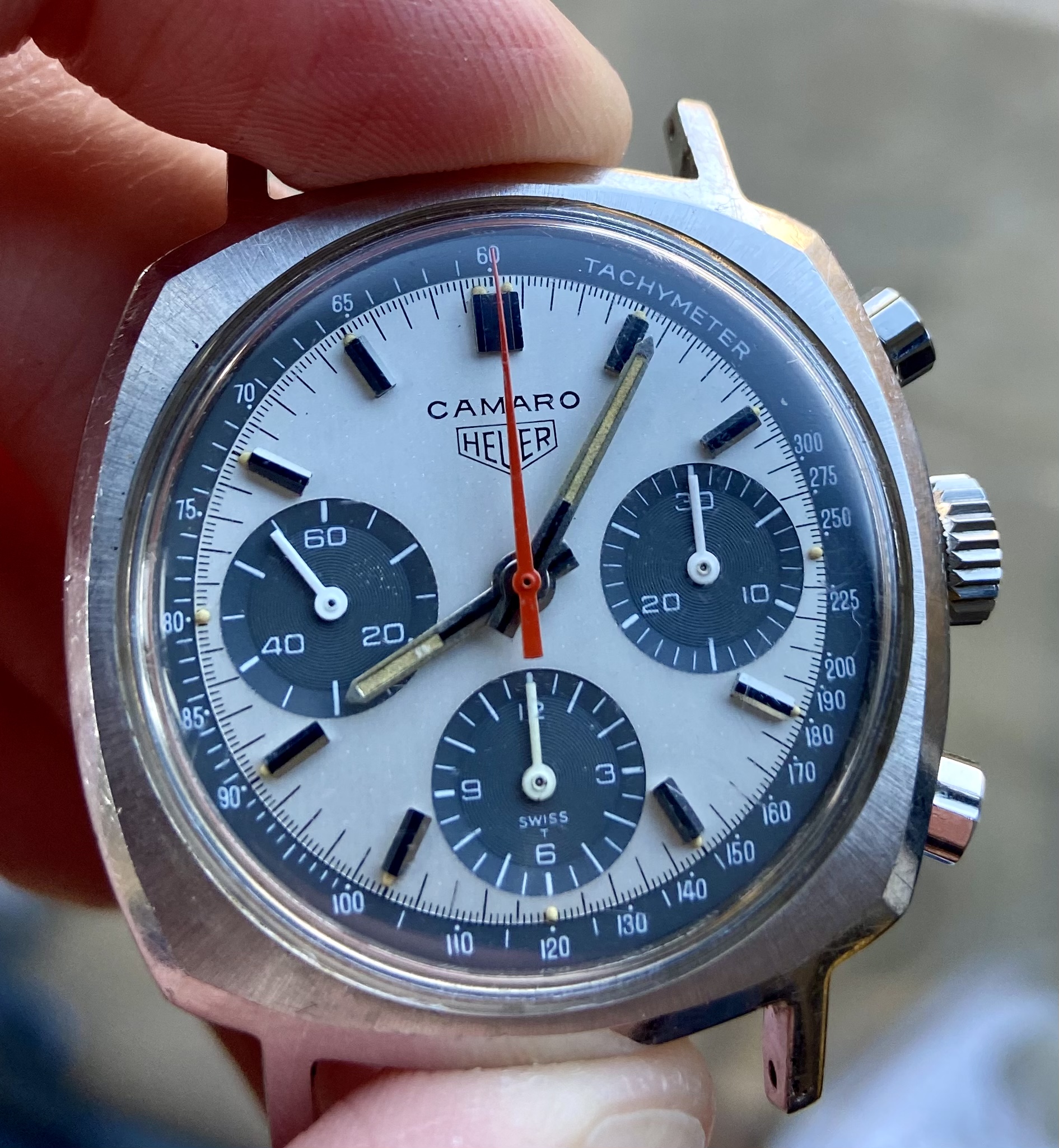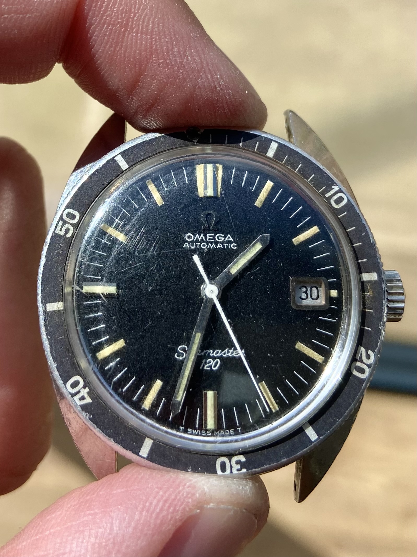 This is clearly an example that’s seen some use (or been bashed about at the back of a drawer) but with the exception of the service crown, everything seems correct. The case is marked but sharp, the movement is in good nick but crying out for a service, the bezel has lost its pip and barely moves but it’s aged to a lovely dark grey and critically, under that scratches Omega stamped crystal the dial appears to be flawless with beautiful lume.