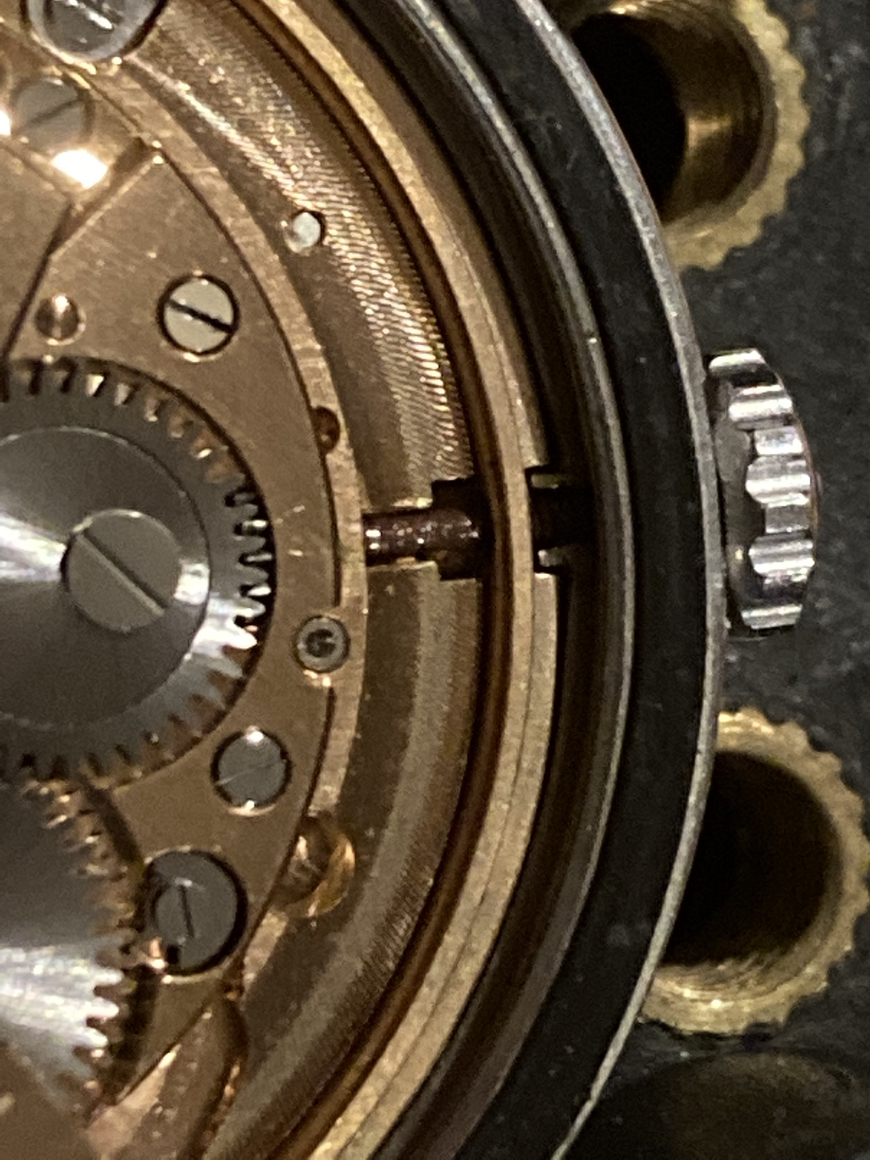 The state of the stem, which I overlooked even though it was readily apparent in the auction photos, seems suboptimal. I made a halfhearted attempt to remove it, but it didn’t budge. Very probably relatedly, the center of the crystal fogged up a bit on a hot day, to the point that water droplets were visible inside the crystal. I’m sure this is a “get thee to a watchmaker” situation, but I’d be grateful for any insight anyone has.