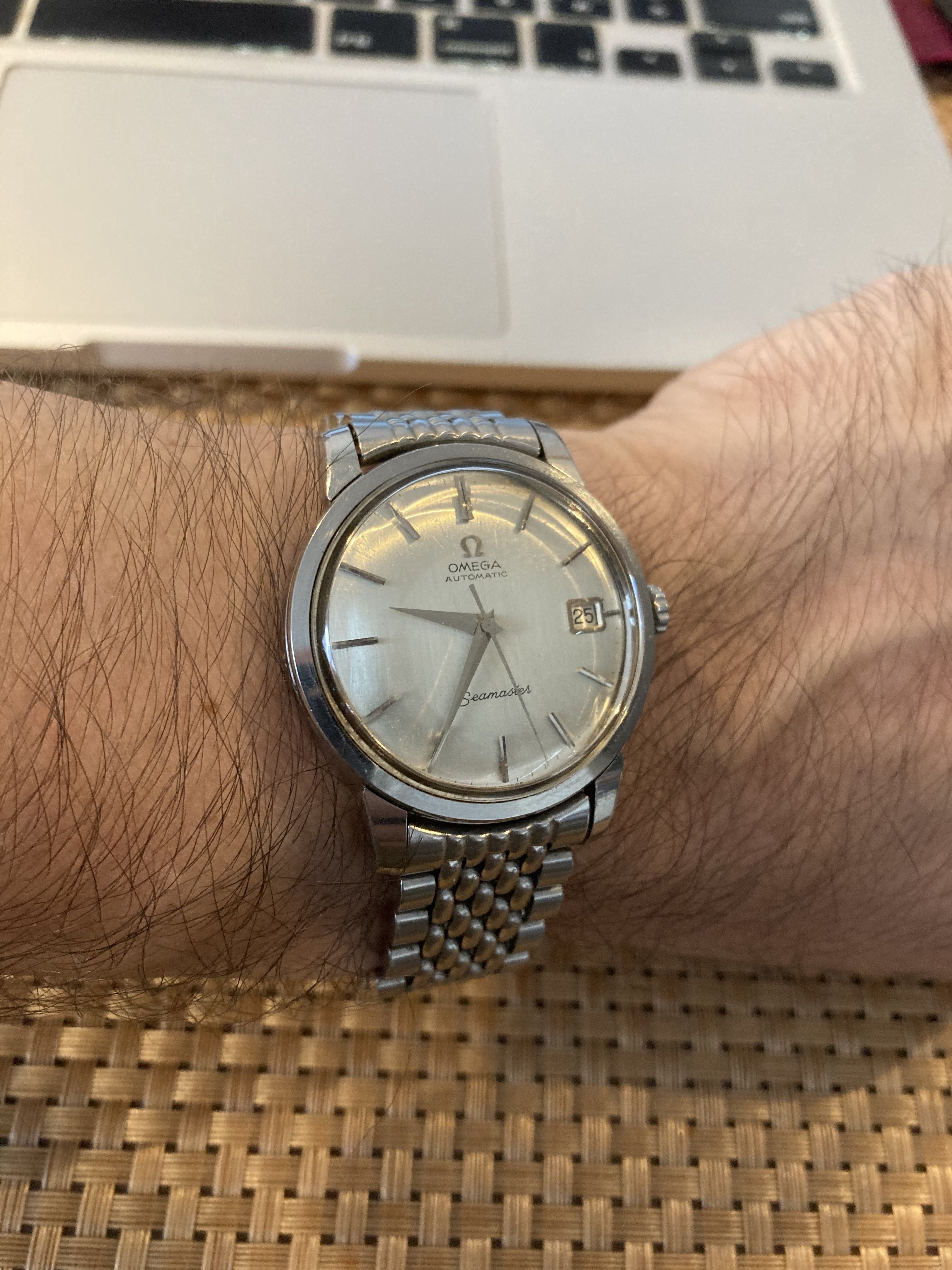 After putting it on a BOR bracelet and swanning around with it for a couple of days, I rescind my earlier opinion about its apparent size. The extra 2.5 mm over the 166.010-type Seamaster models I’m used to, plus the plumper styling, feels like the difference between a Chevy Corvette and Ford Gran Torino.