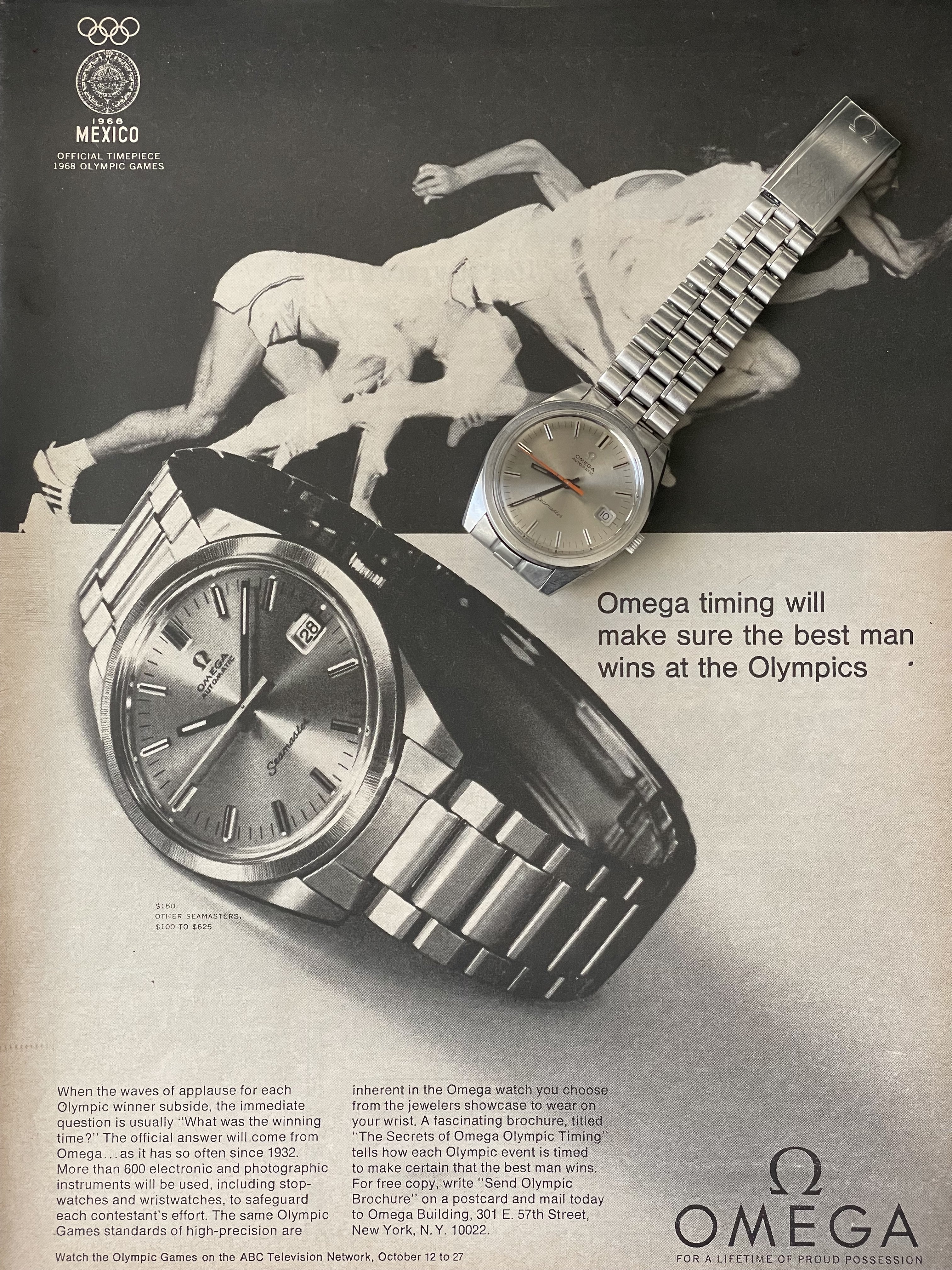 And as a bonus for you history buffs that stopped by, I found this advert from the '68 Mexico Olympics showing what I think is the same reference with the same dial and hands(seen on the right). But I'll let you all be the judge of it.
