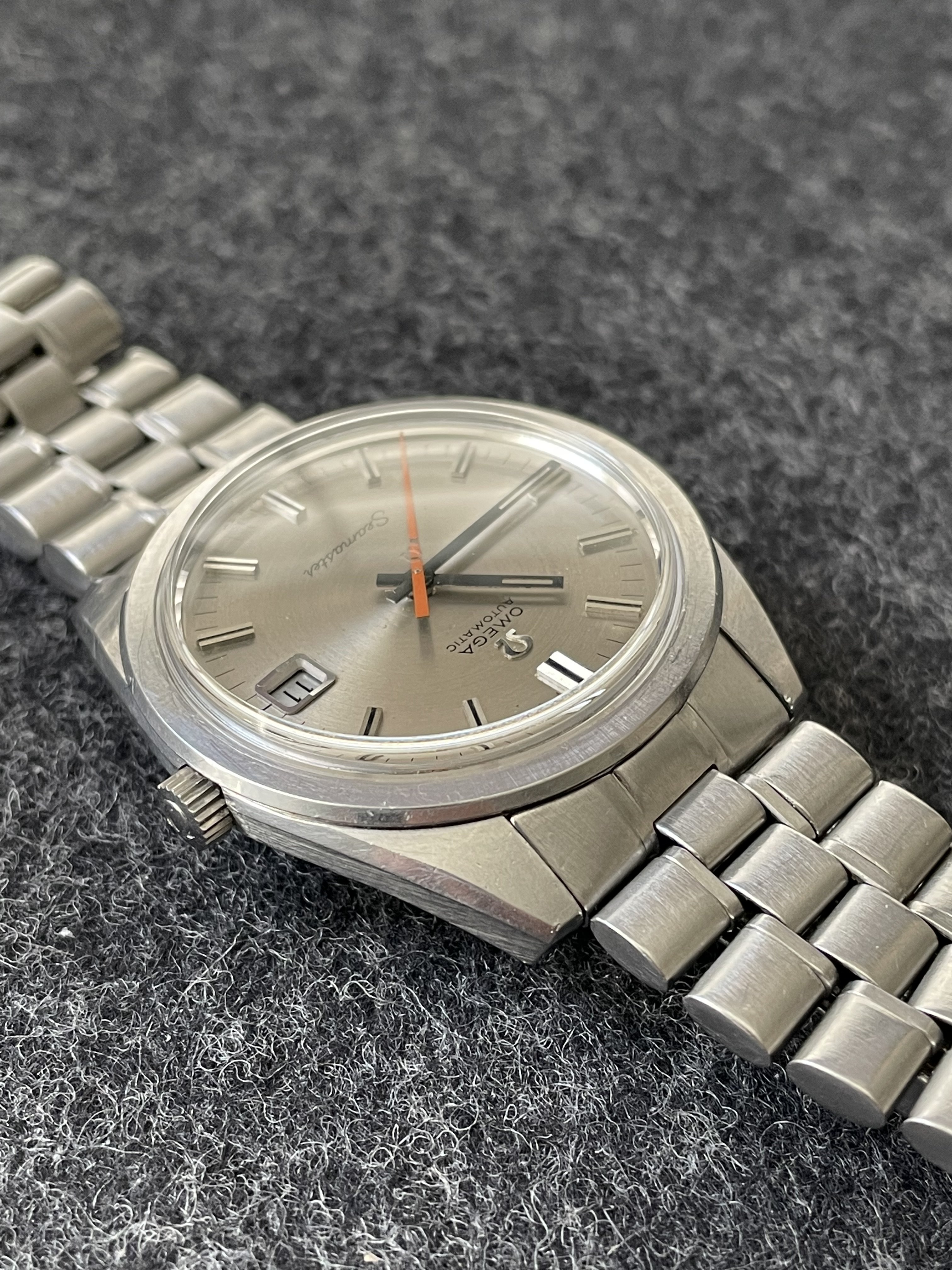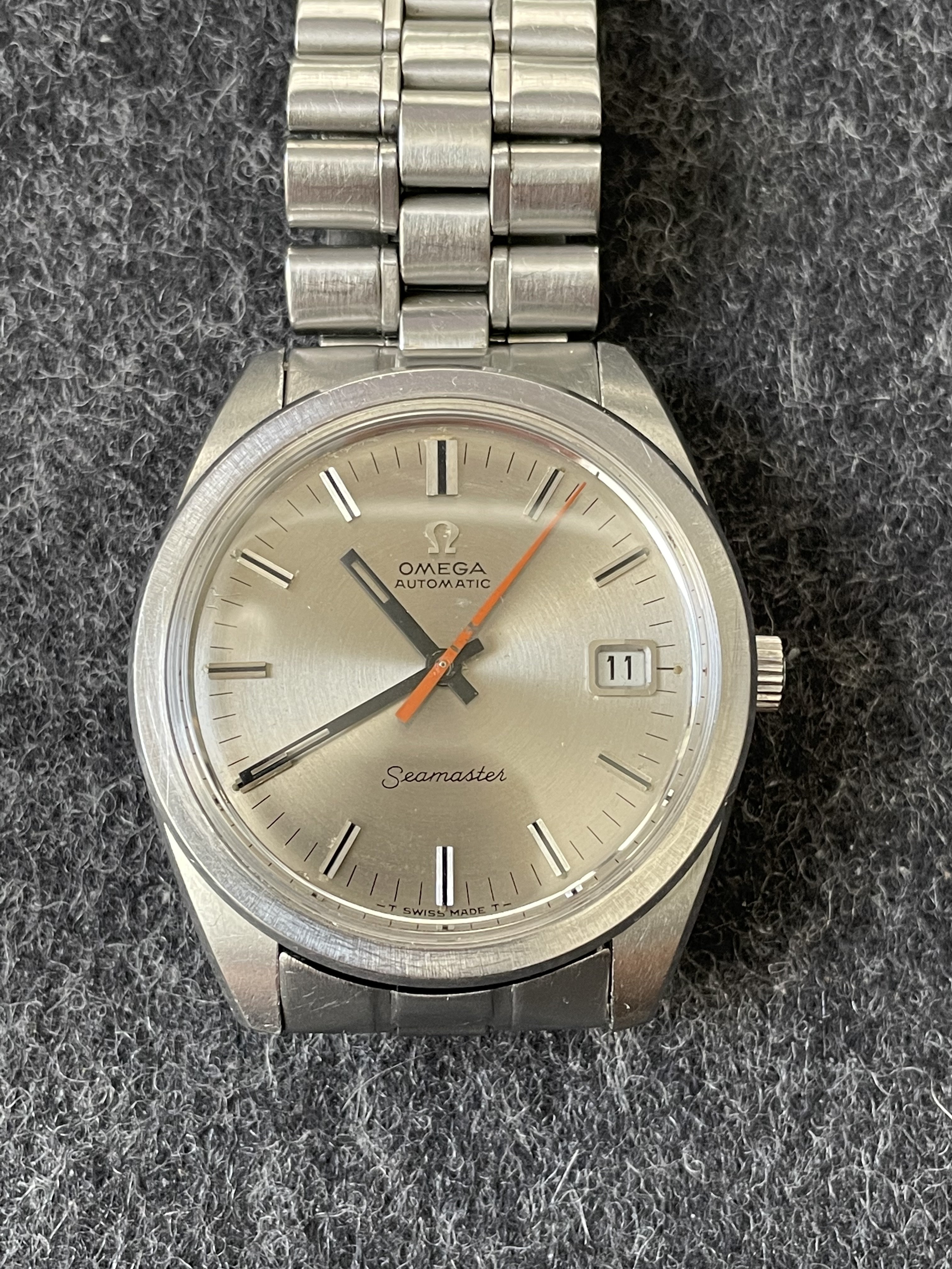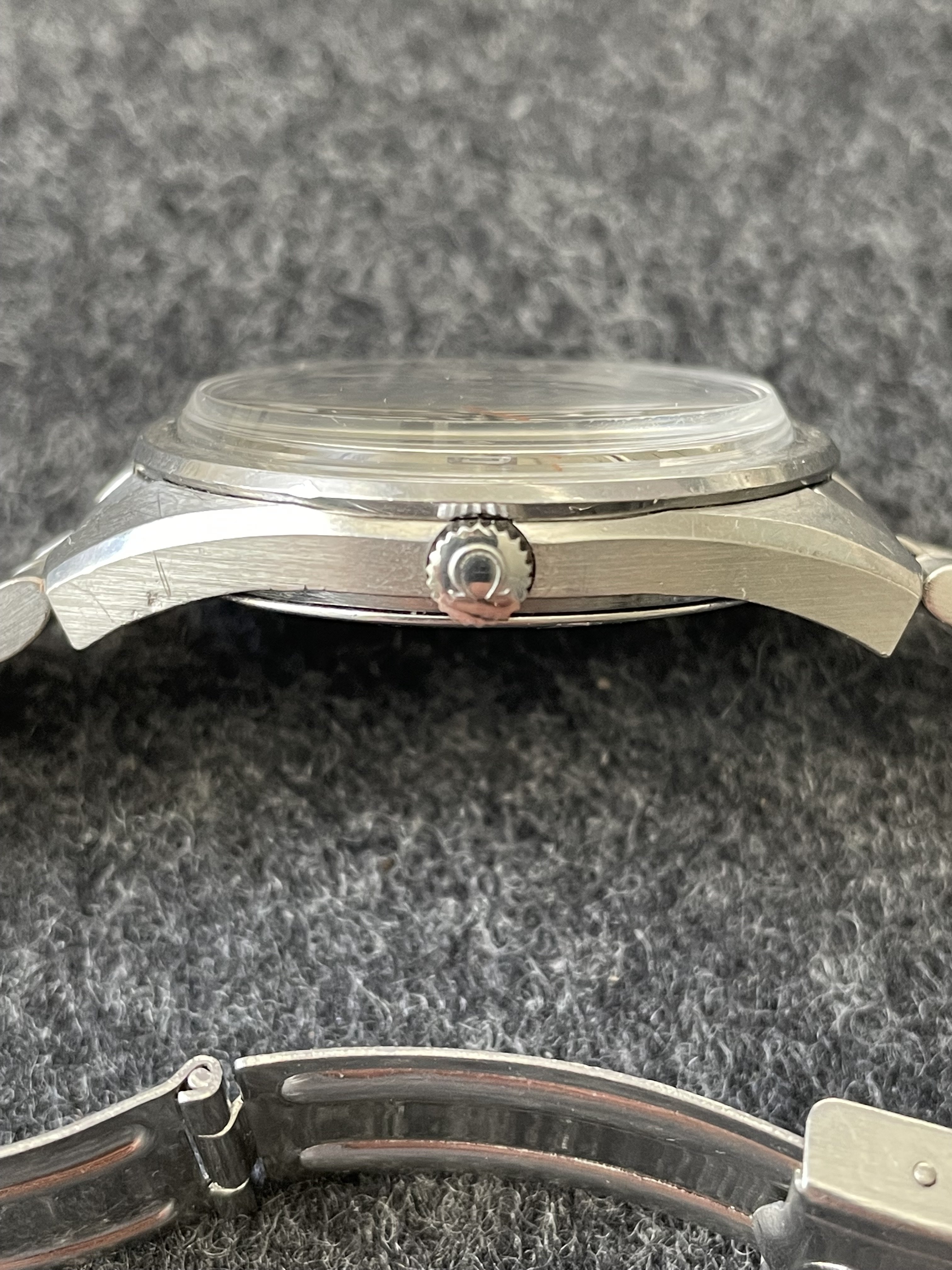 I'm specifically interested in learning about what you see in the photo below; Concentric circle dial, orange second, date window, black hands with rectilinear ends (I've seen a few with pencil / sword end hands), and T-SWISS-T with the tritium lume dots at the hour index marks.