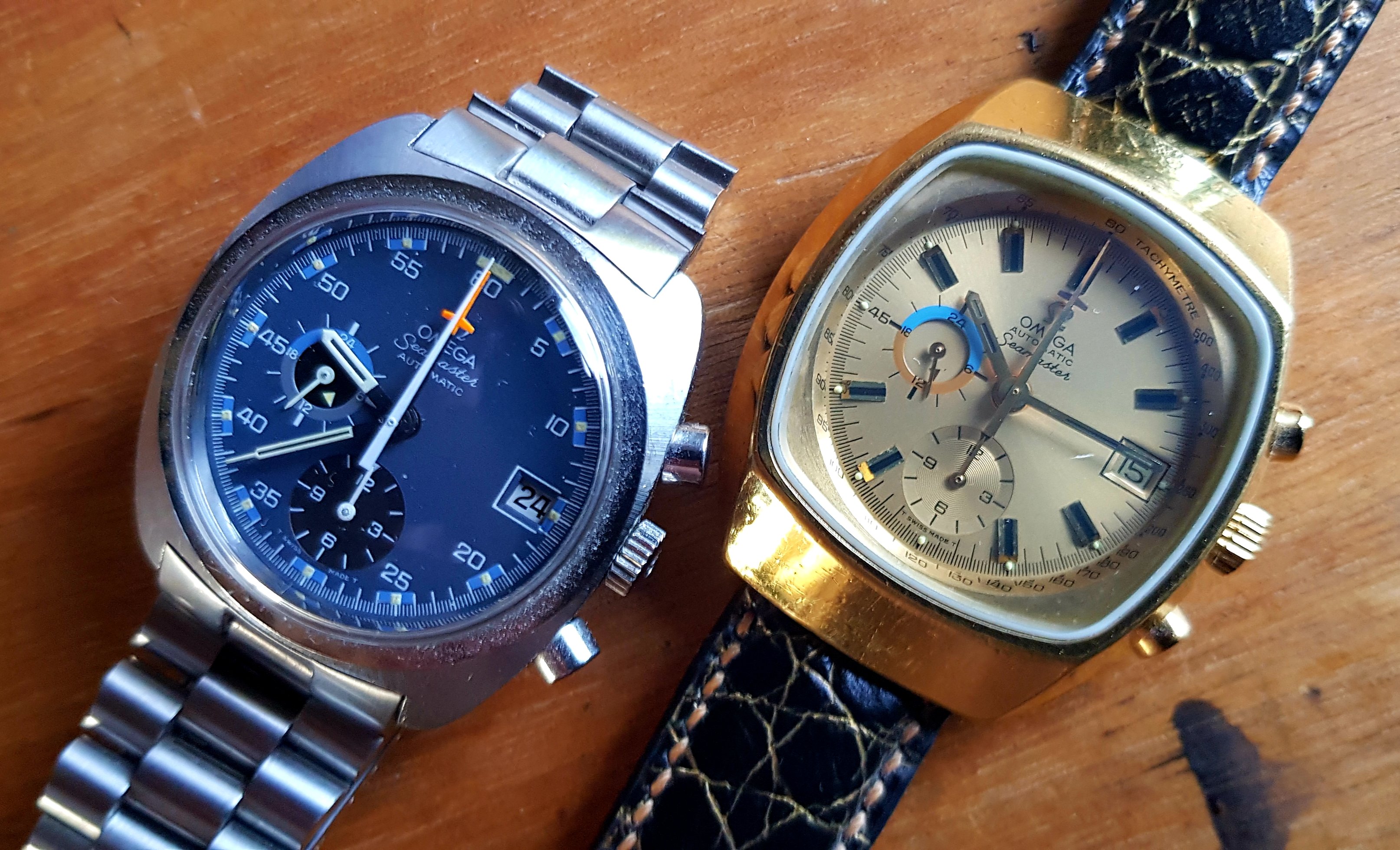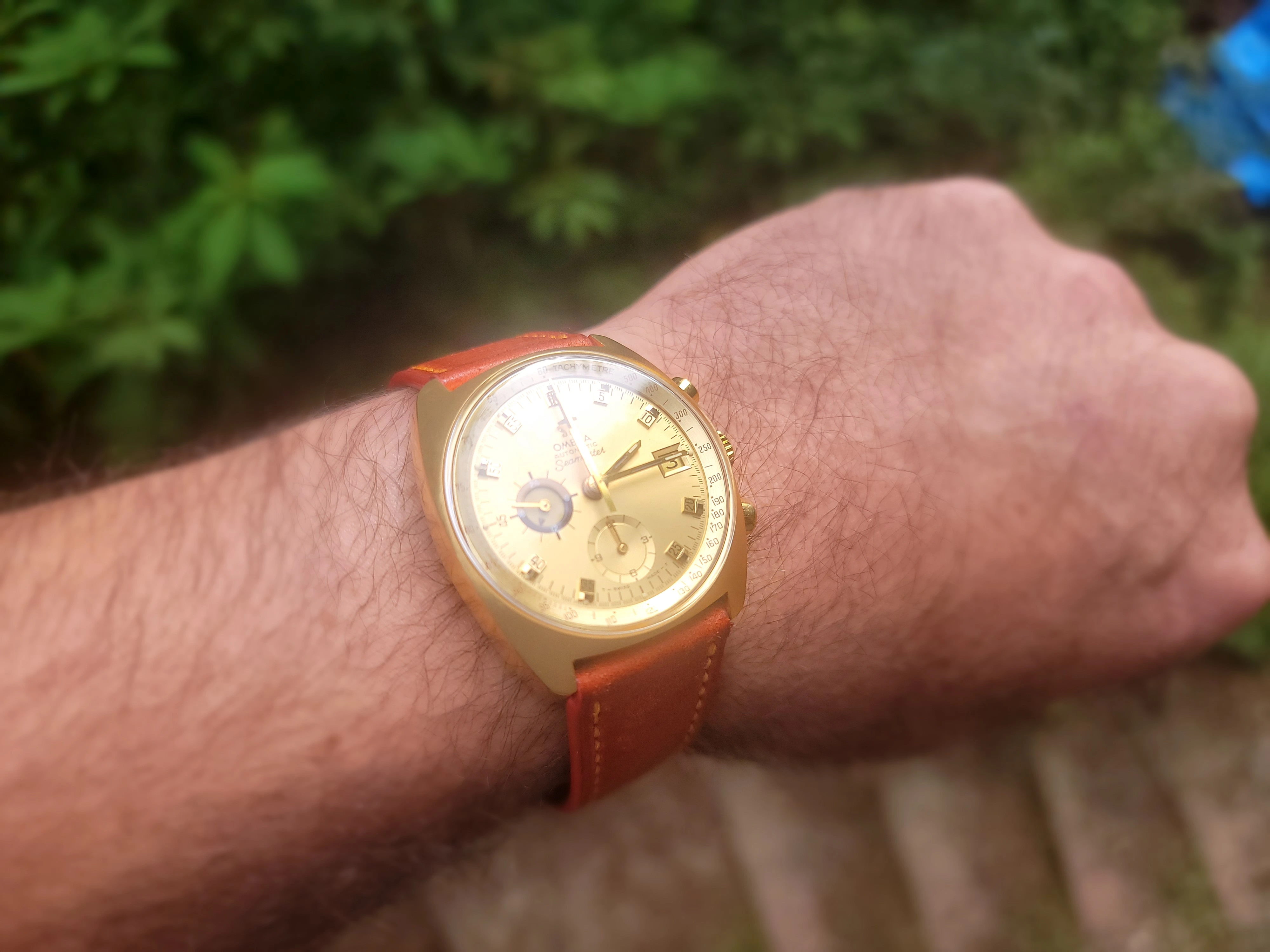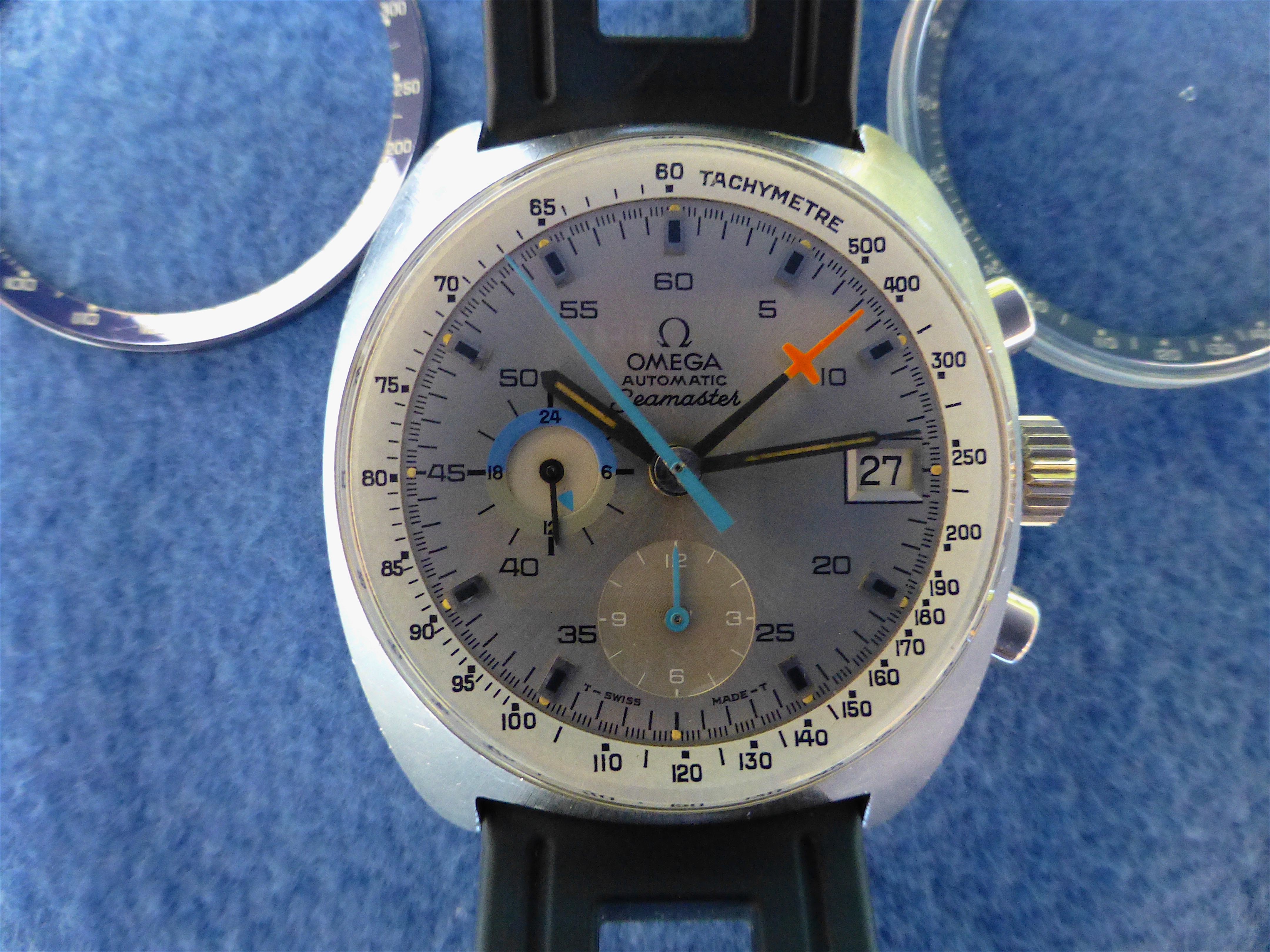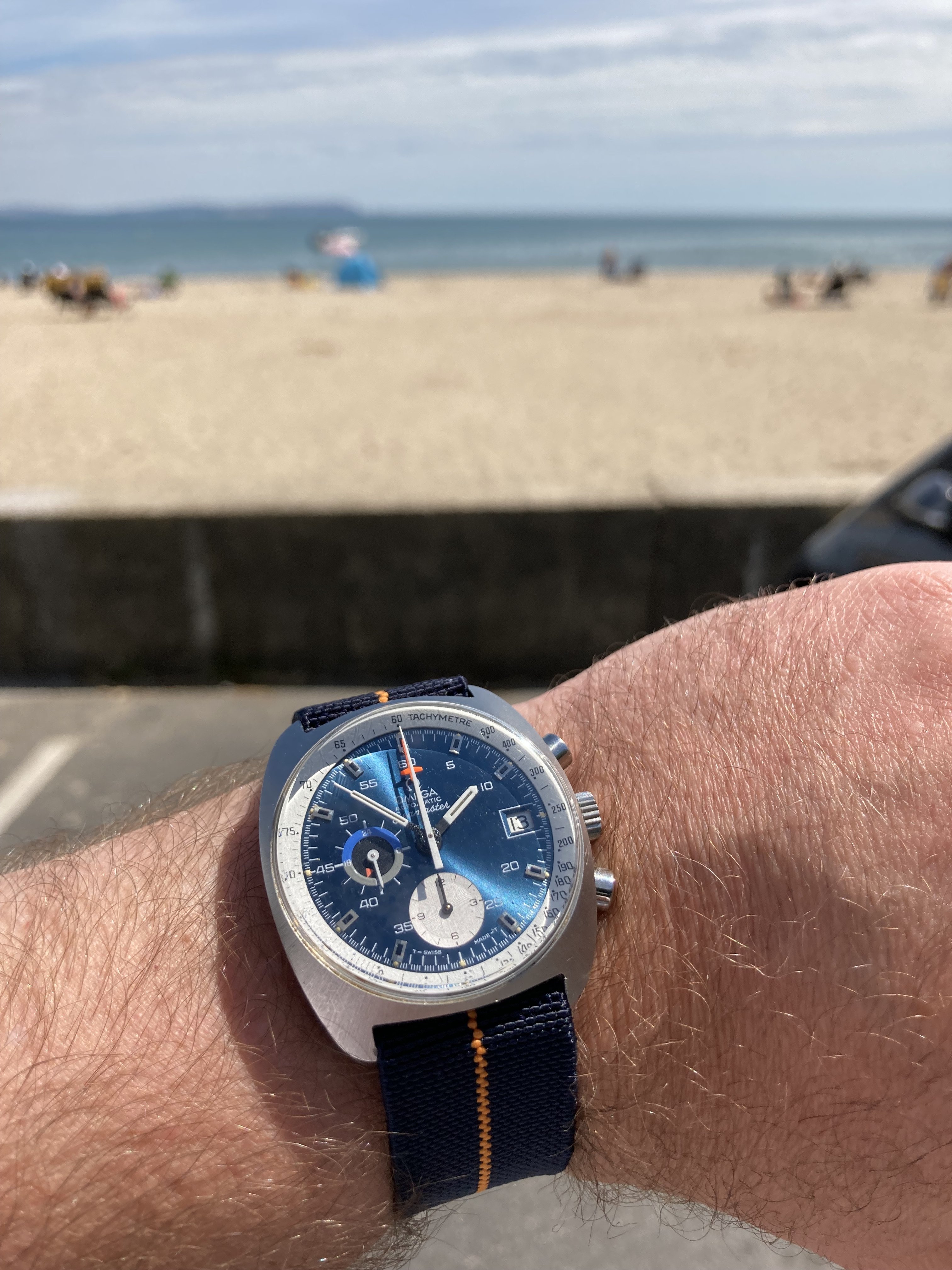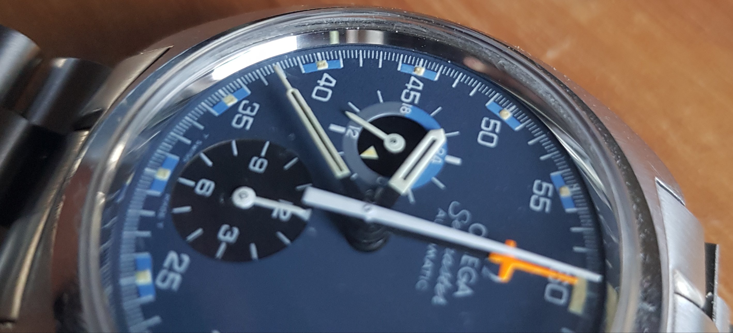 Mine is obviously "wrong" in the sense that it has a service dial and hands, including some sort of Speedy chrono seconds hand and a ridiculous red chrono hour hand (bottom subdial). I'm gonna be putting back the original glossy blue dial soon (in spite of some damage) but I still need to source a lovely metallic blue tachy ring like yours. Dibs of you ever change it for the white one 😉