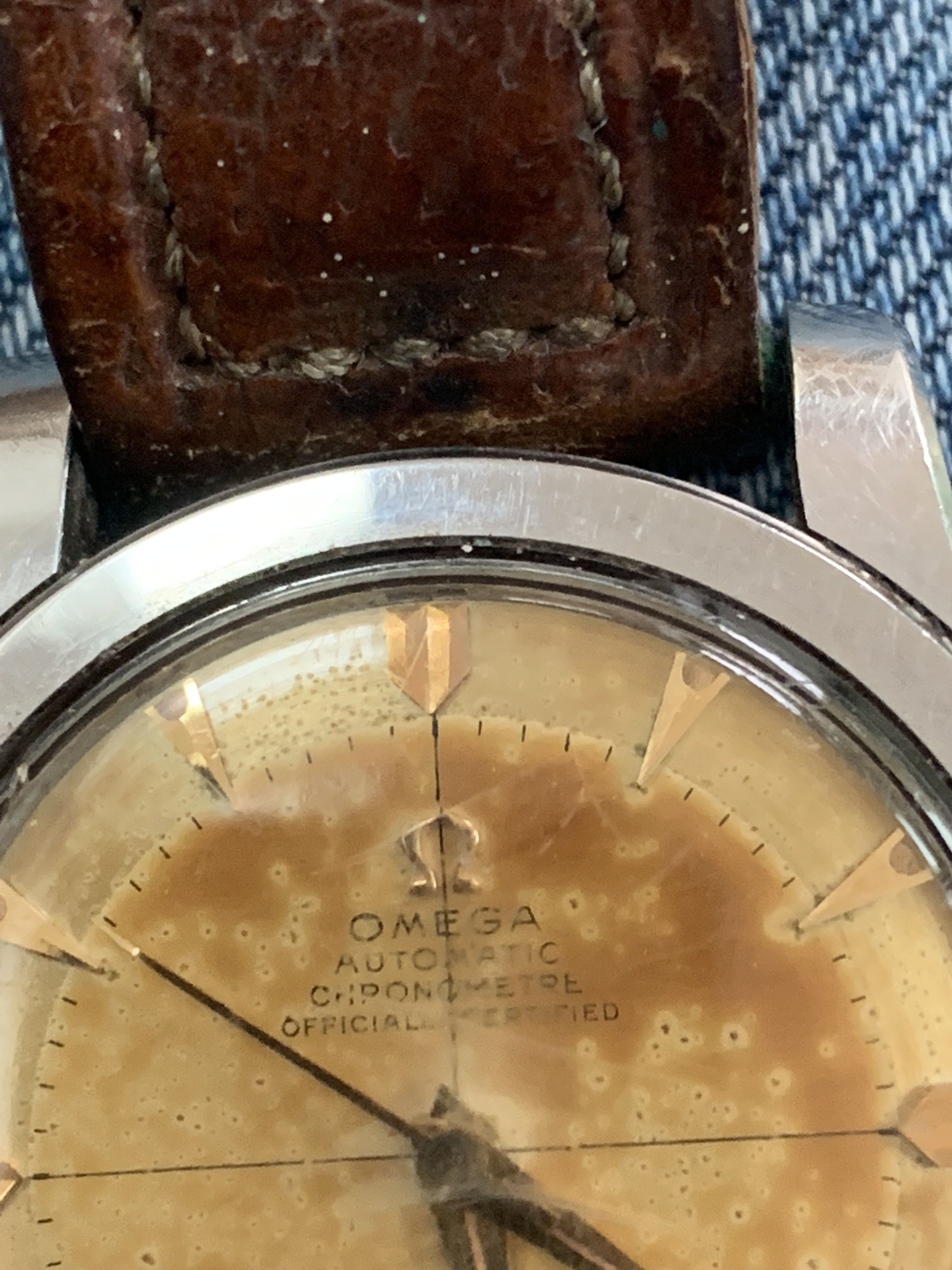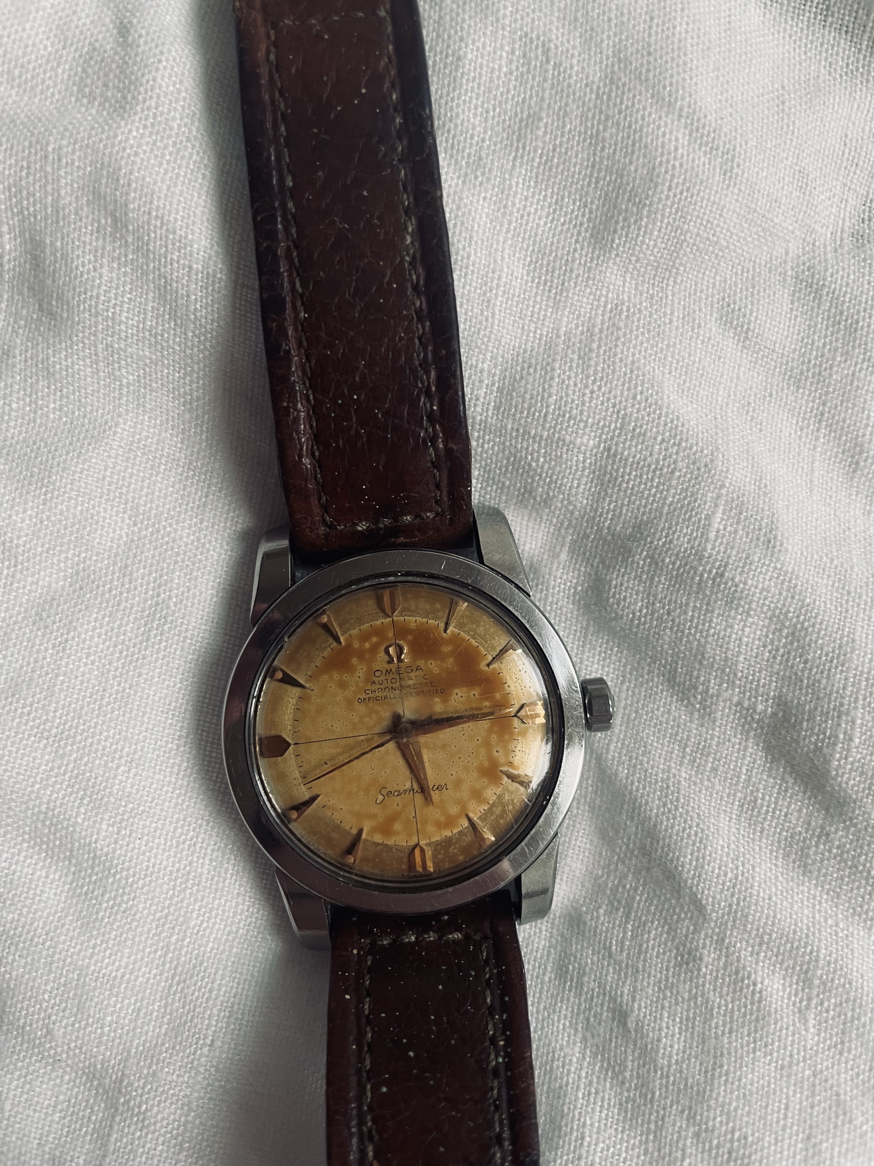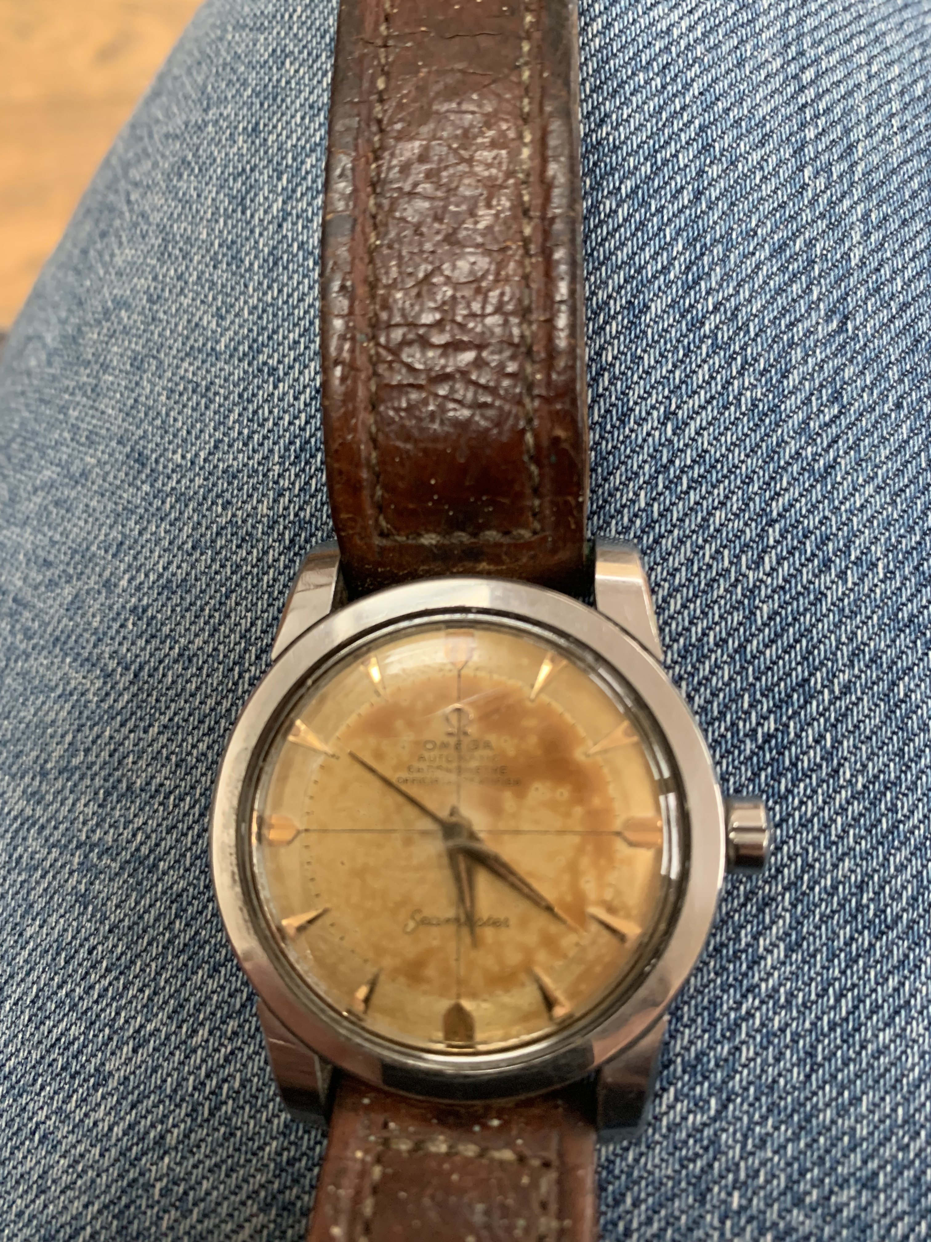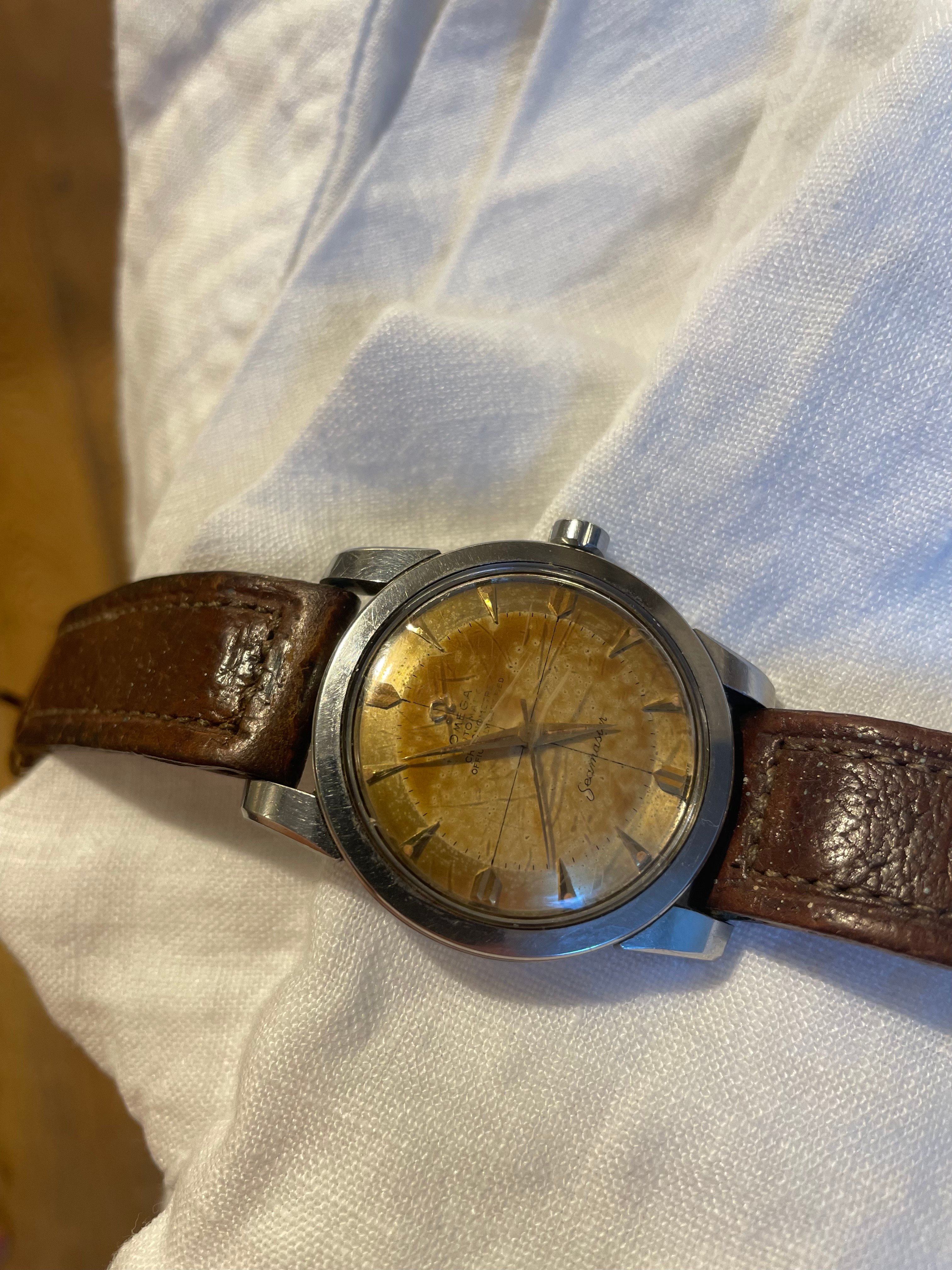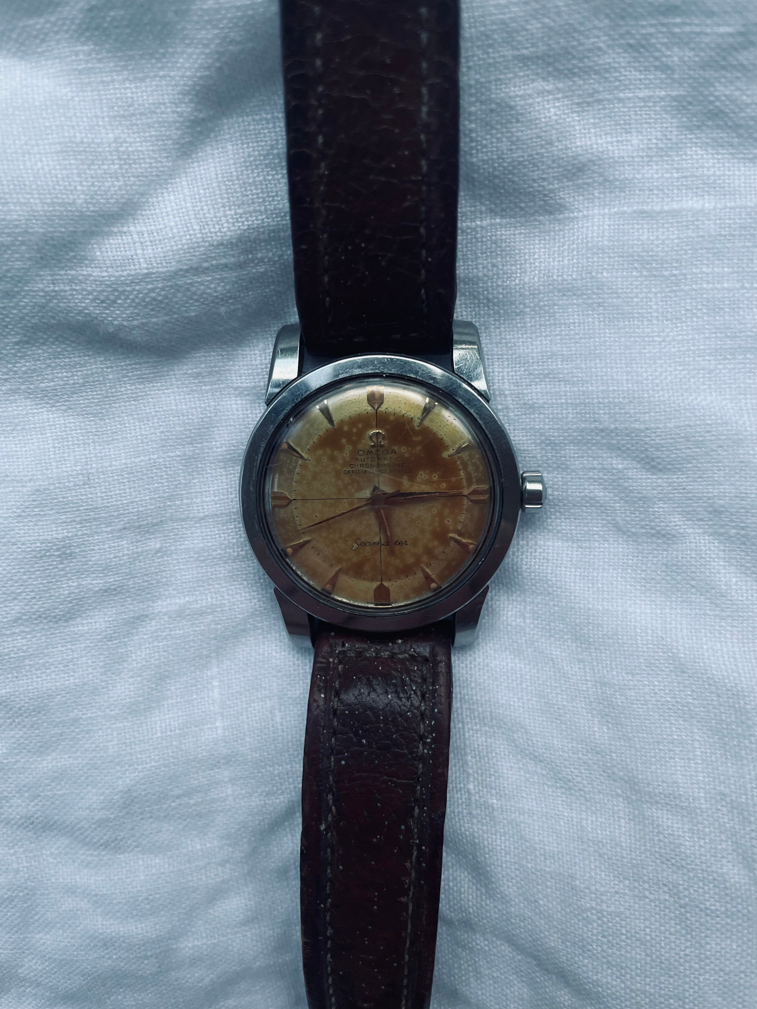 Seamasters with "chronometre" and "officially certified" text are uncommon, and even if the dial is tainted, they represent considerable value, much more than "ordinary" Seamasters. Your watch can probably be repaired, but please do have in mind that if the dial gets repainted, it will be unattractive to collectors and will not bring the same amount, should you wish to sell it - which I hope you will not!
