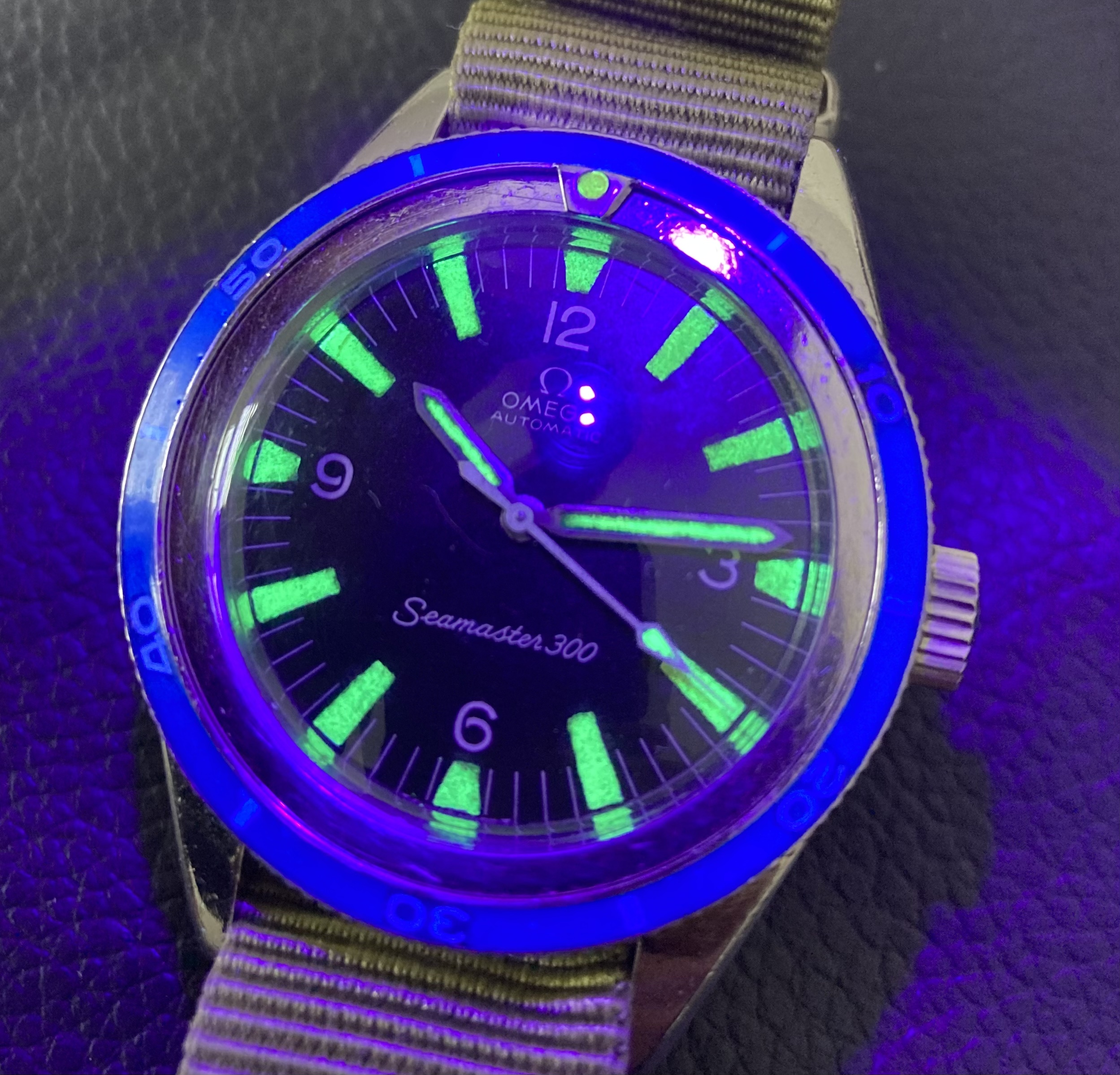 The bezel is original but has been refinished by Rene and aged to match the watch.The pip has been relumed with a tritium compound and glows/fades exactly like the markers/hands and consistently with a watch of this age. Personally I quite the like contrast but you could get it relumed to match the markers and hands. The lume on the dial and hands is all original.