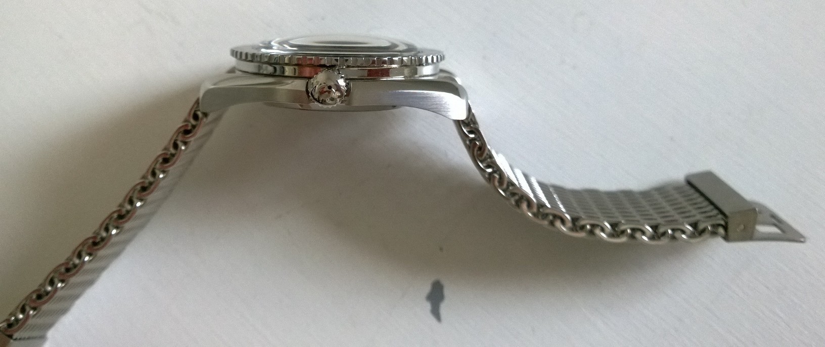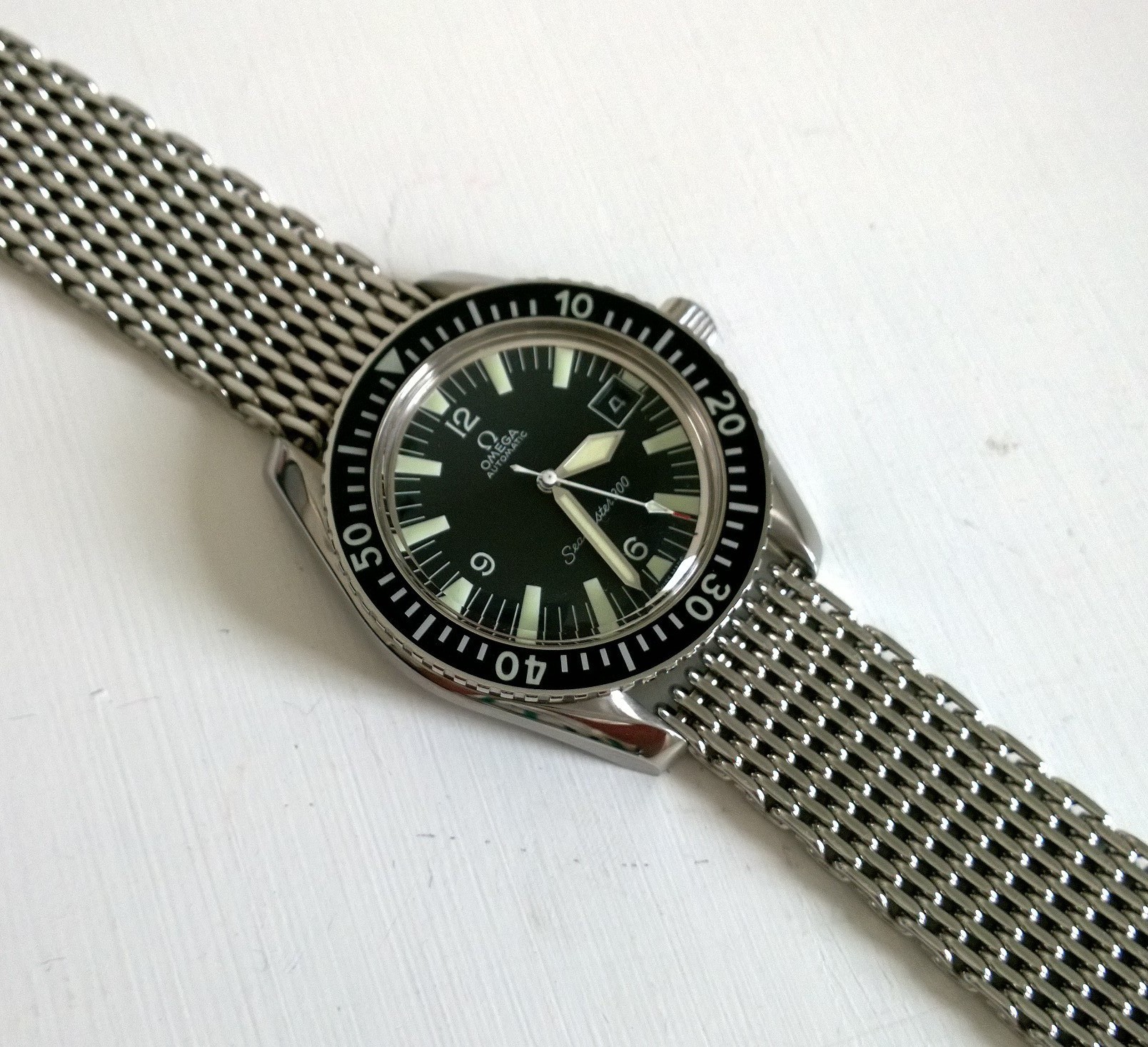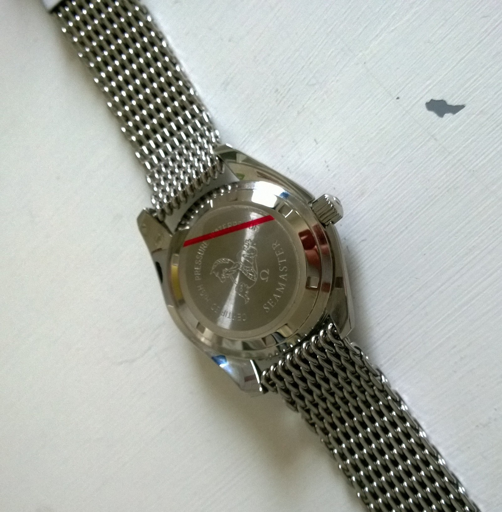 ·New and unworn watch built from all original Omega spare parts, same as "Watchco". However, the movement is the chronometer version 564, which was also used in some Seamaster models, but not originally in the Seamaster 300, which had the otherwise identical 565. The watch was built for daily regular wear, so I thought I might just as well pick the best grade movement available - the second hand is tipped red to show this additional chronometer feature. The mesh and its extension piece are very lightly used, only some minor scratches on the clasp. The watch had a full service a few weeks back at an official Omega service station and it will be delivered with replaced movement parts and service receipt. Please note, that the movement picture was taken prior cleaning and service.