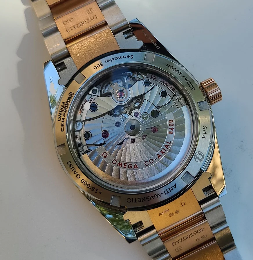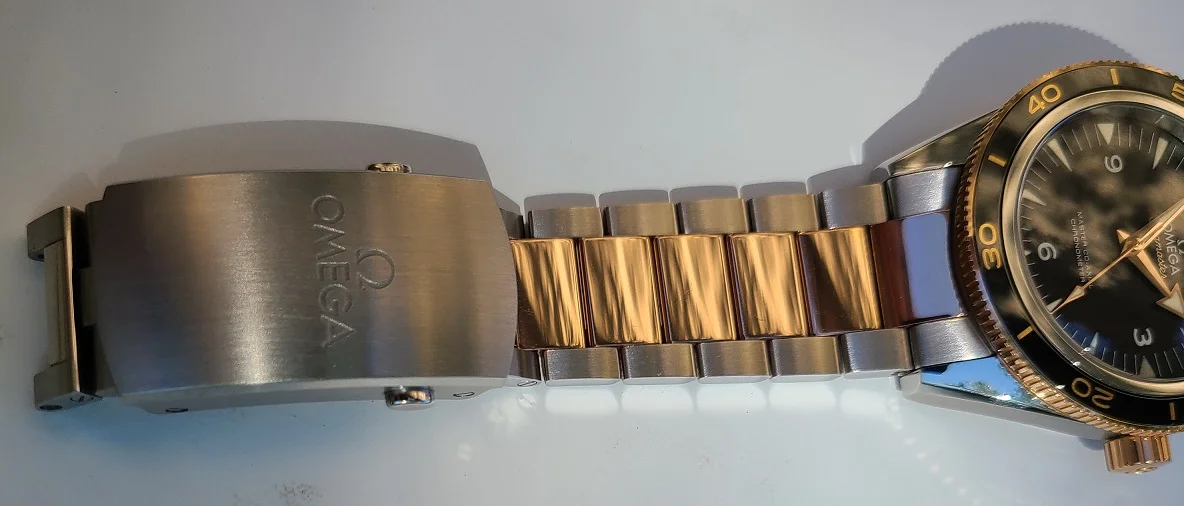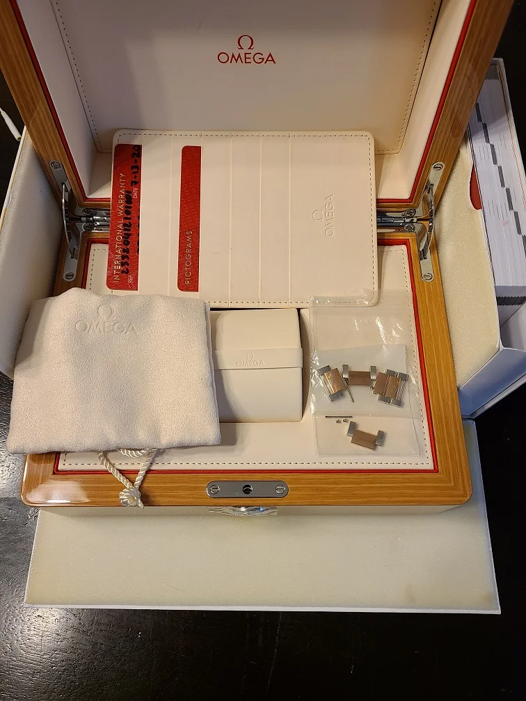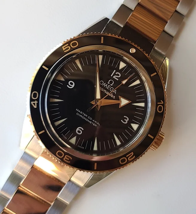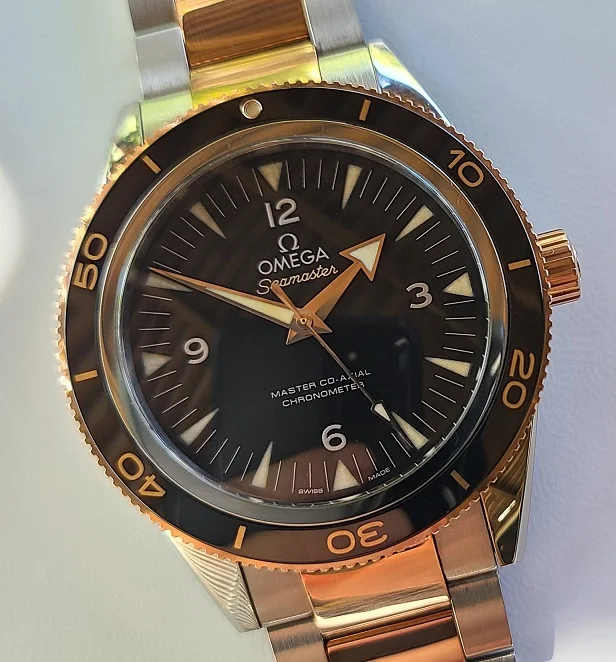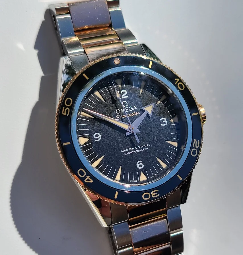 ·For sale is a pre-owned excellent condition stainless steel and 18-karat rose gold Omega Seamaster 300. The reference 233.20.41.21.01.001, originally sold in July of 2020, includes box and papers. Accompanying the watch are the original white box, instruction manual, pictogram card, warranty card, and the full set of loose links.