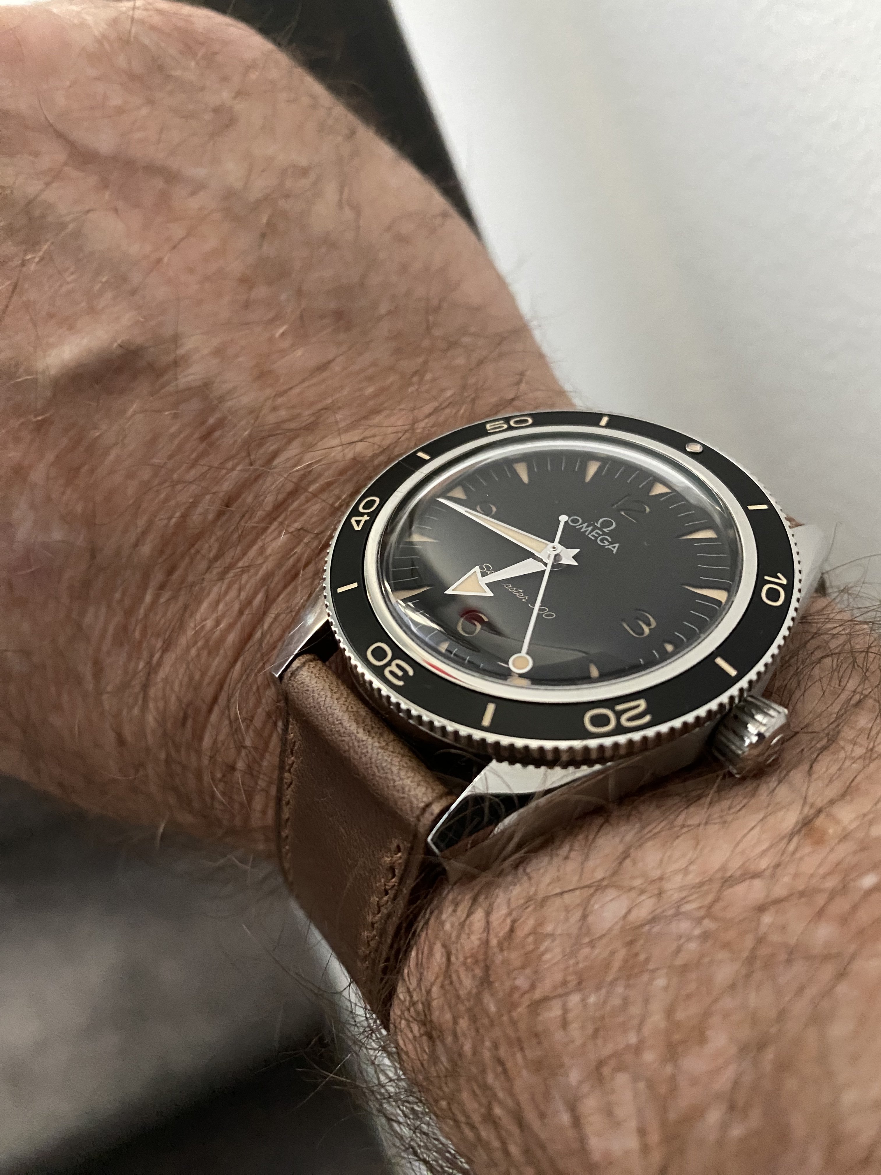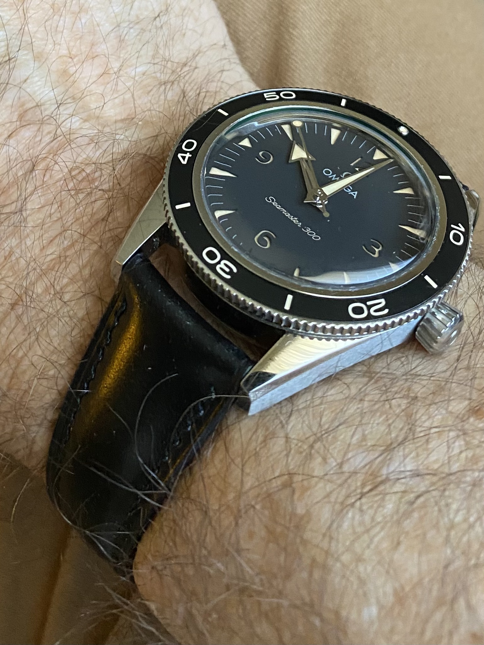 ·I recently purchased a new black dialed Seamaster 300 Heritage. The watch comes on a very nice flat link OEM bracelet with micro adjustment, but I also picked up a dark brown horween chromexcel strap (thought it would look nice with the fauxtina on the bezel, hour markers and hands) and a black shell cordovan strap (thought it would look nice with the black dial). Just curious which “look” the OF crowd thinks is best. I’m kinda partial to the black strap. Maybe it depends on the occasion/setting? Fantastic watch, by the way. Well done, Omega.