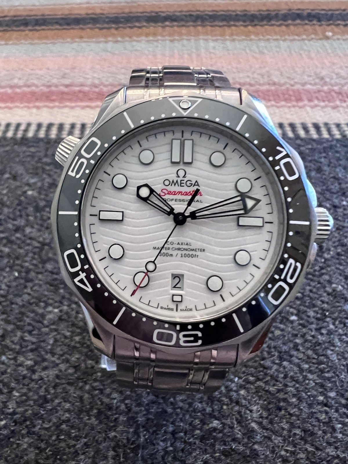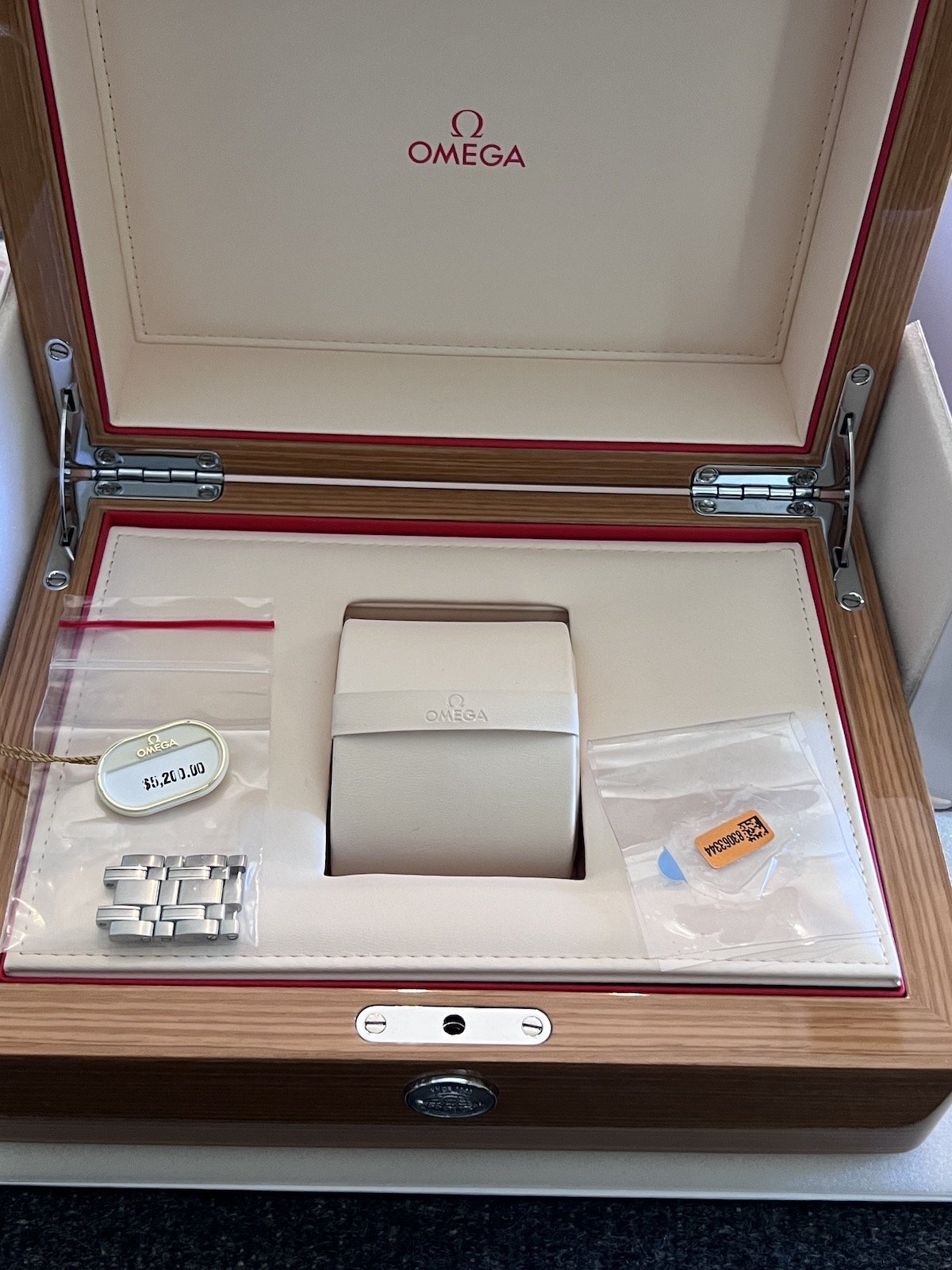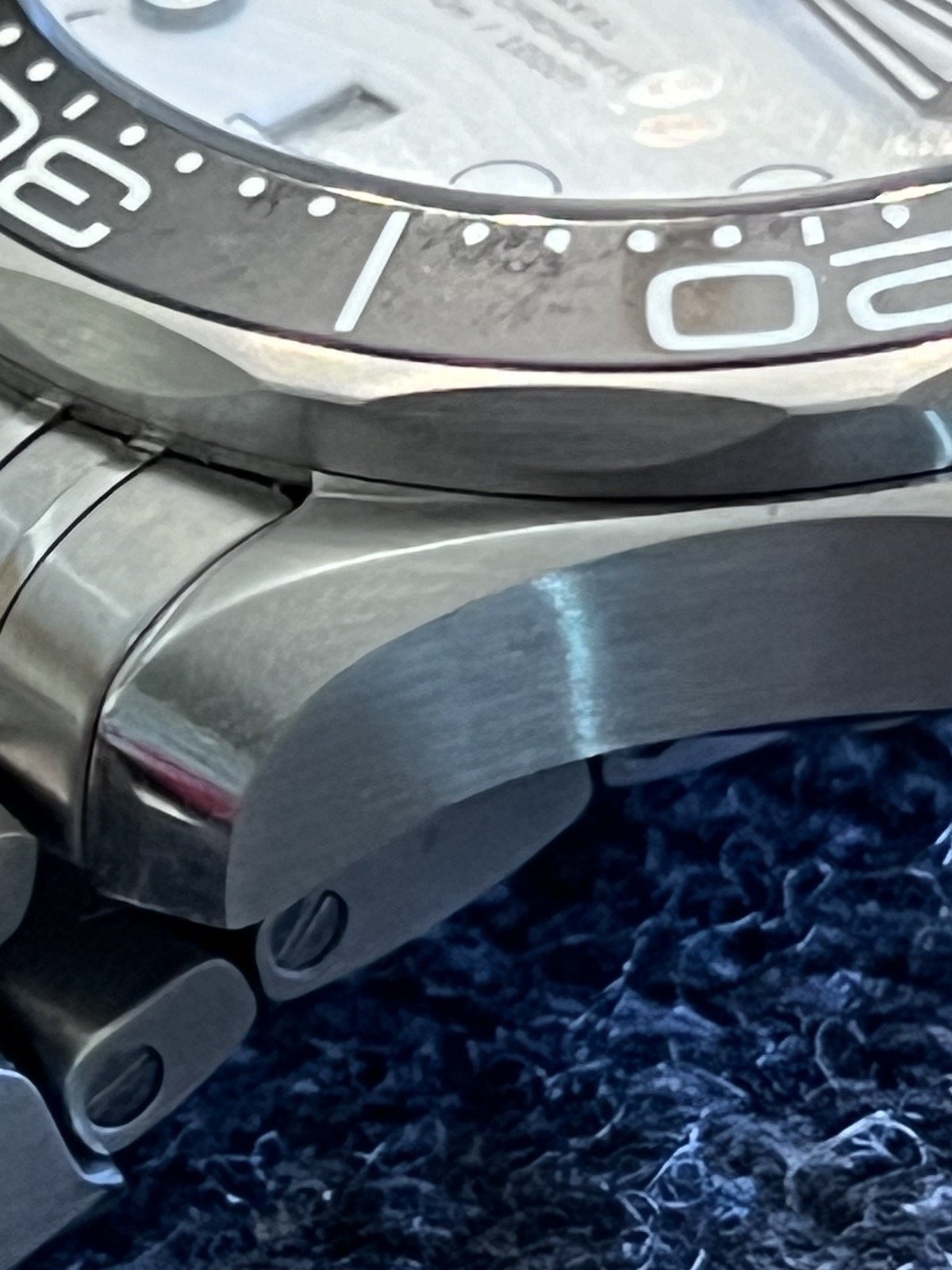 ·I'm looking to trim the collection a bit, so, for your consideration I have the Seamaster 300, master chronometer. Black ceramic bezel and white ceramic dial on the bracelet. Originally purchased 3/2021, it comes with all boxes, owners manual, warranty cards, hang tag, and all bracelet links. I've checked this watch and I can't find any dings or scratches on the watch head and bracelet. The deployment has a really faint mark can barely see it, I did try to get it on the pic but not really visible.