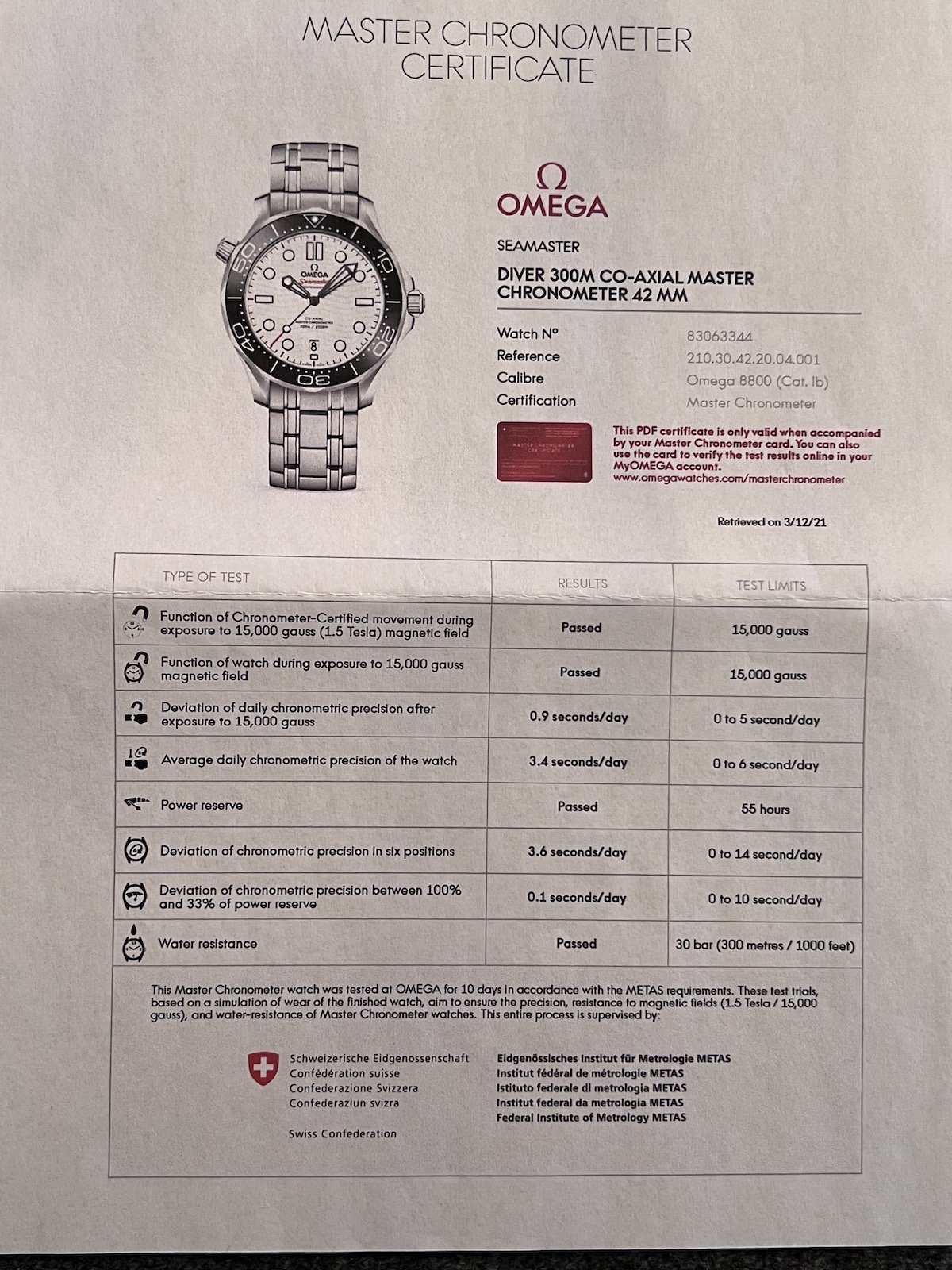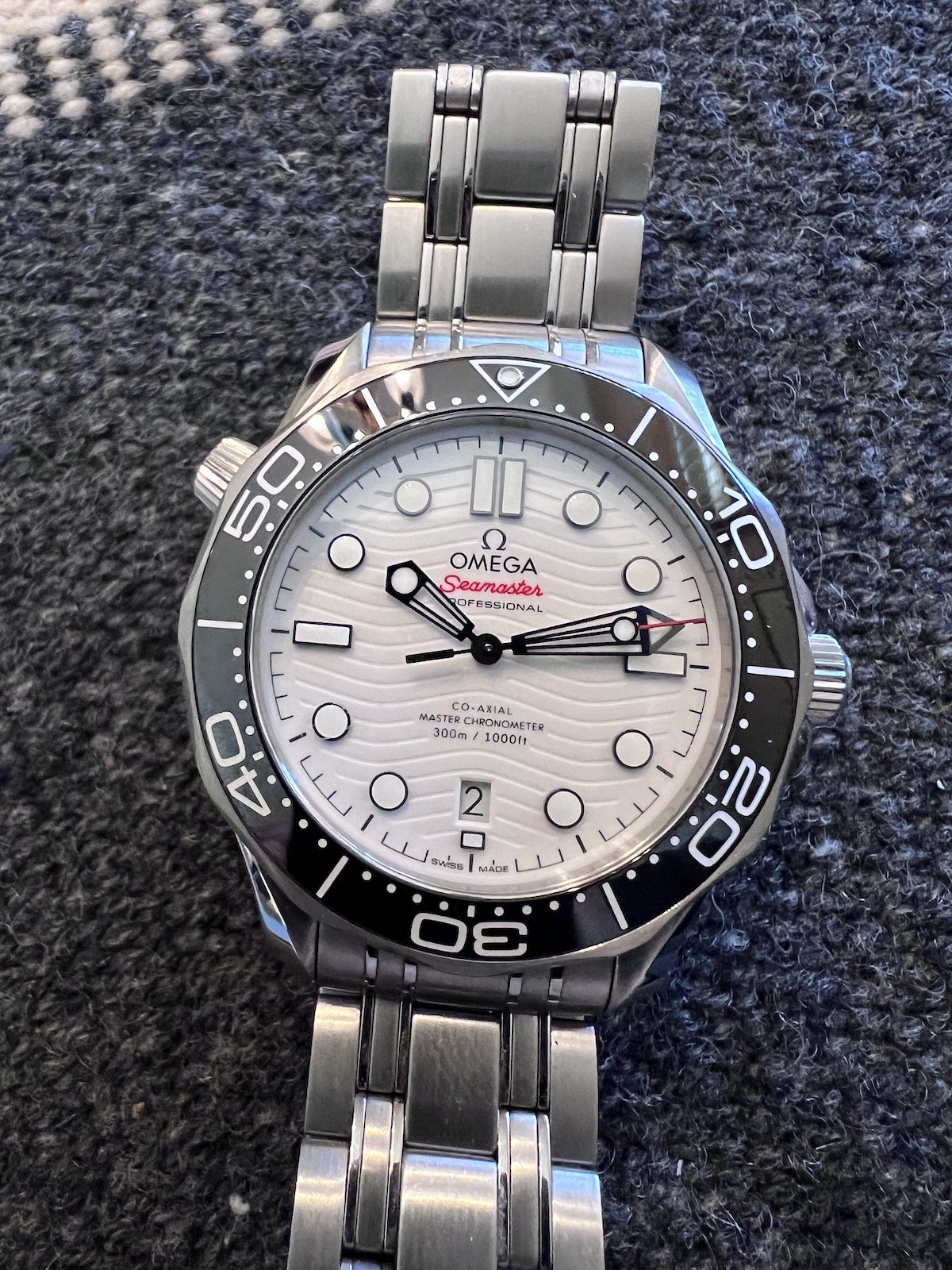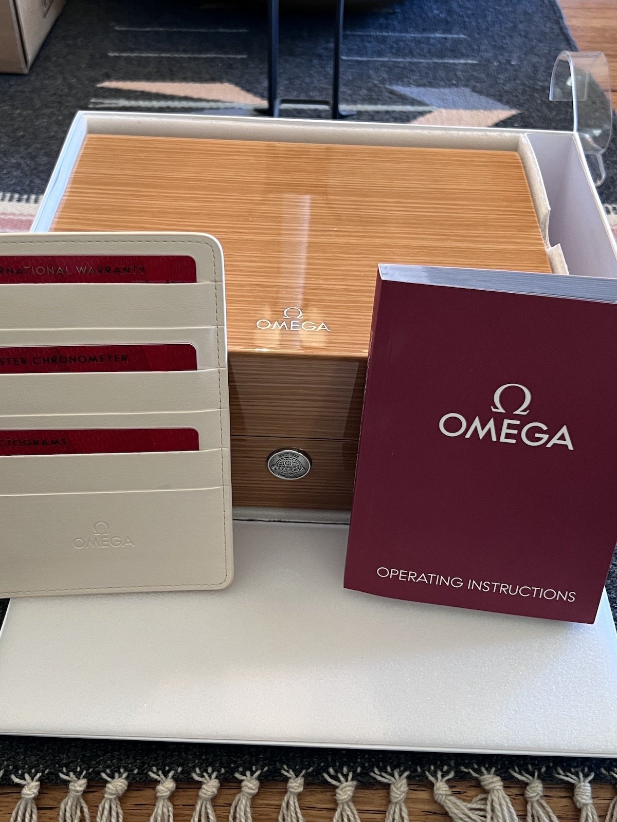 ·I'm looking to trim the collection a bit, so, for your consideration I have the Seamaster 300, master chronometer. Black ceramic bezel and white ceramic dial on the bracelet. Originally purchased 3/2021, it comes with all boxes, owners manual, warranty cards, hang tag, and all bracelet links. I've checked this watch and I can't find any dings or scratches on the watch head and bracelet. The deployment has a really faint mark can barely see it, I did try to get it on the pic but not really visible.