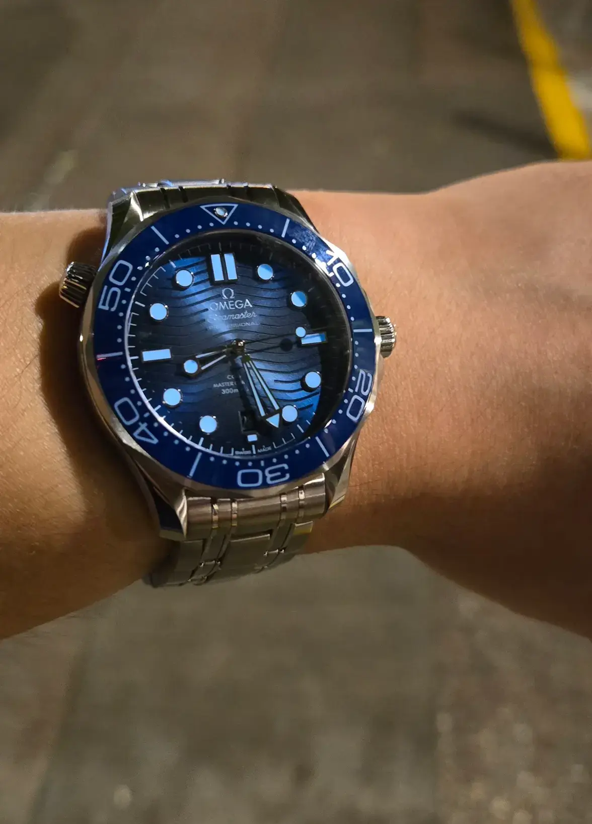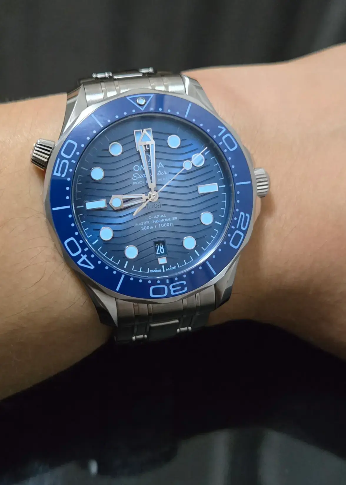 ·It has been a month since I've purchased my Seamaster 300M Diver Summer Blue on the metal bracelet. My friend helped me get it from a local HK Watch Shop for a 25% discount on the offical RRP. The 1st thing I have to say about the watch is that you really need to look at it in person in order to experience. The way the Summer Blue color of the bezel and the dial changes to a different shade of blue depending on how the light reflects off it, makes it a joy to look it. I have white lights in the rooms of my apartment, the bezel and the dial looks like a metallic cyan blue. In a darker enviroment or a place with warm yellow lighting the bezel looks like a royal blue similar to the blue of the original Brosnan Bond Seamaster, and the dial has the dark ocean blue effect. Now I know that allot of people hate the new 5 link metal bracelet. To me the new 5 link metal bracelet feels just as good as the original 5 link metal bracelet. Normally I would prefer the glass case back so I can look at the caliber 8800 movement, I do like the 75th Seamaster Aniversary Posedon case back. This watch has become my daily wear.