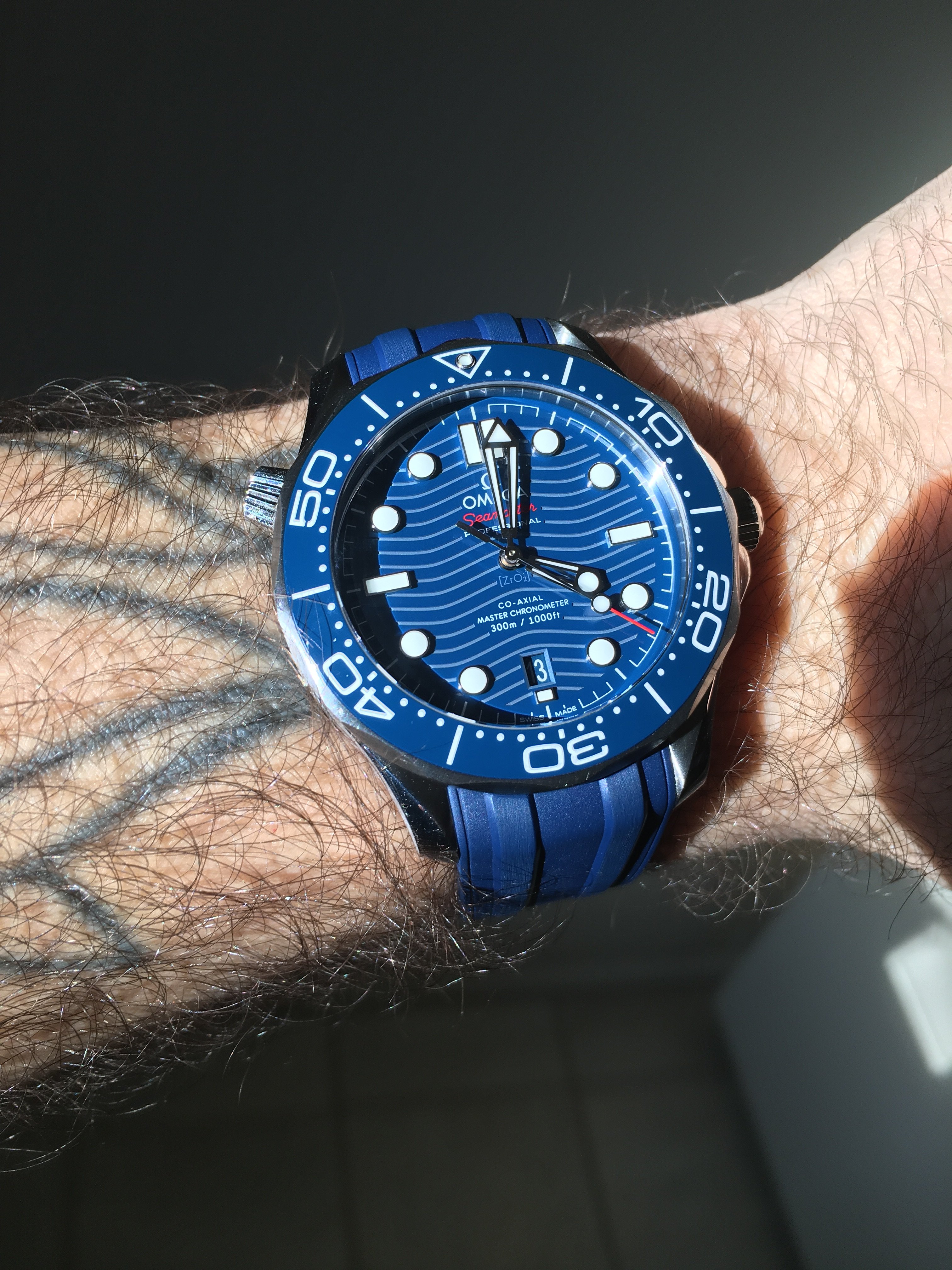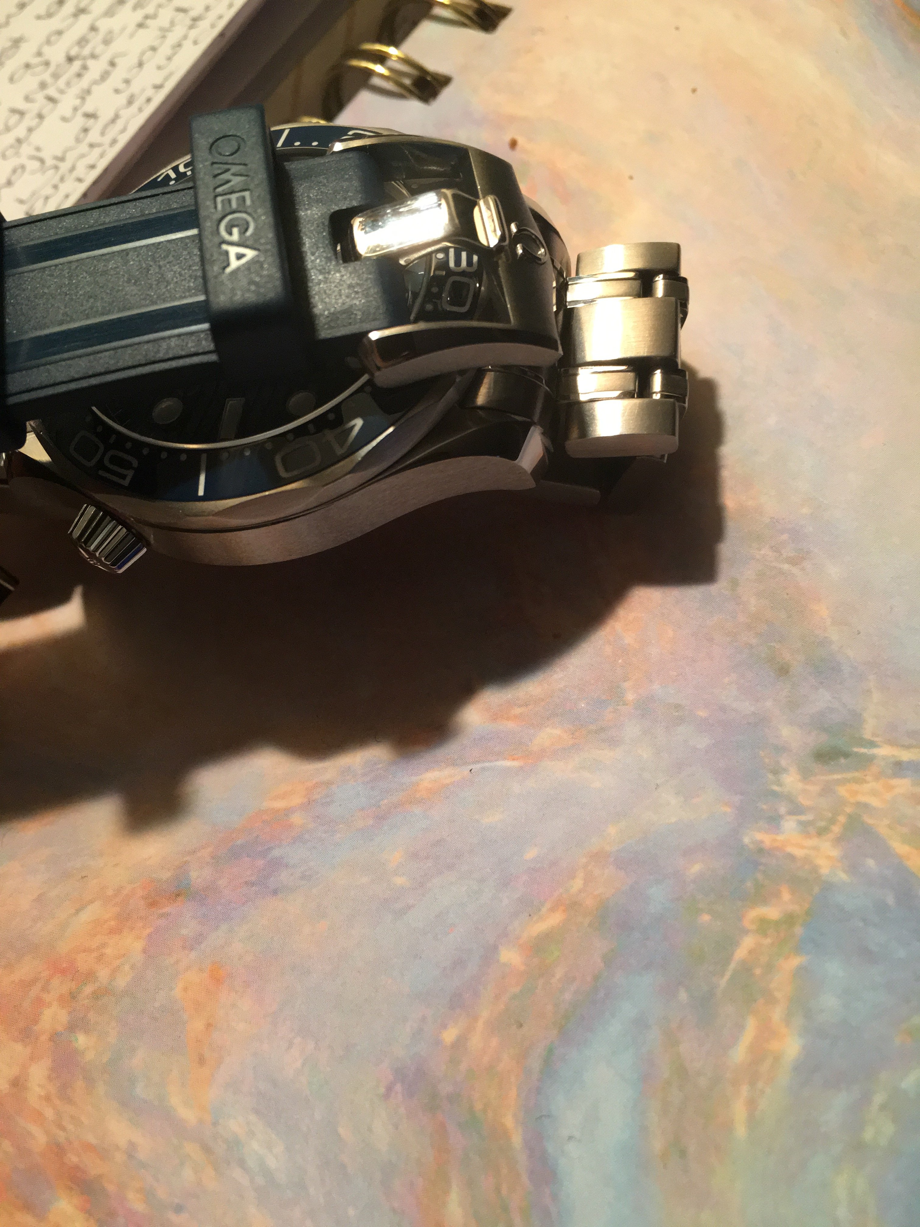 The way omega have added the lines and textures in the rubber to mimic the look of the bracelet, plus the waves on the underside, and the nipple keeper/ strap design that always keeps you locked in with a consistent amount of excess “tail” sticking out. The buckle on the factory rubber continues the look of the chamfering on the case lugs, and is really high quality.