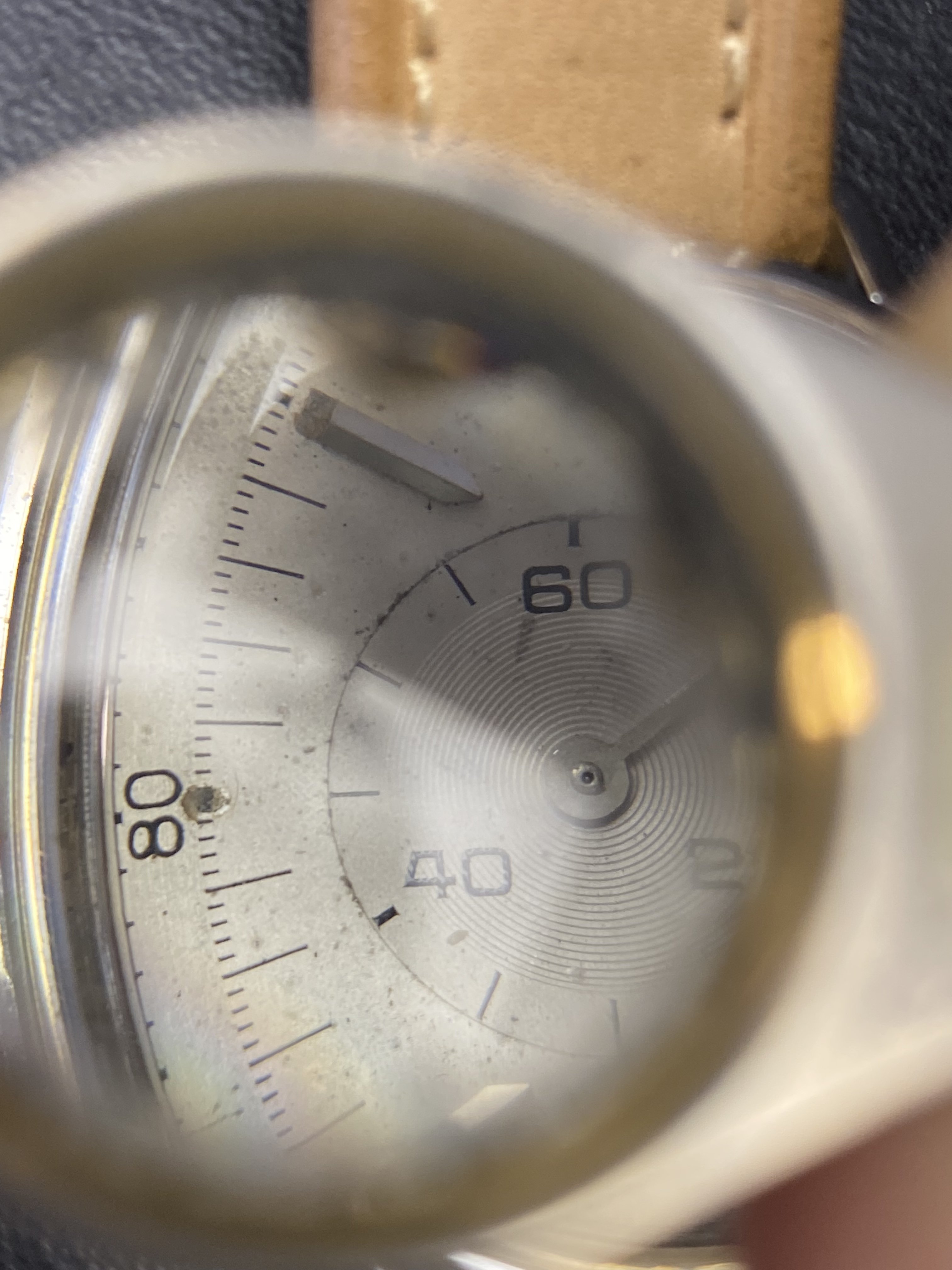 I didn’t find anything wrong with the text on the dial. The dial itself is in pretty good condition, only with very small bubbles due to aging/humidity. I’d give it 8/10. Hands look fine too. Crystal is signed. Comes with original strap too.