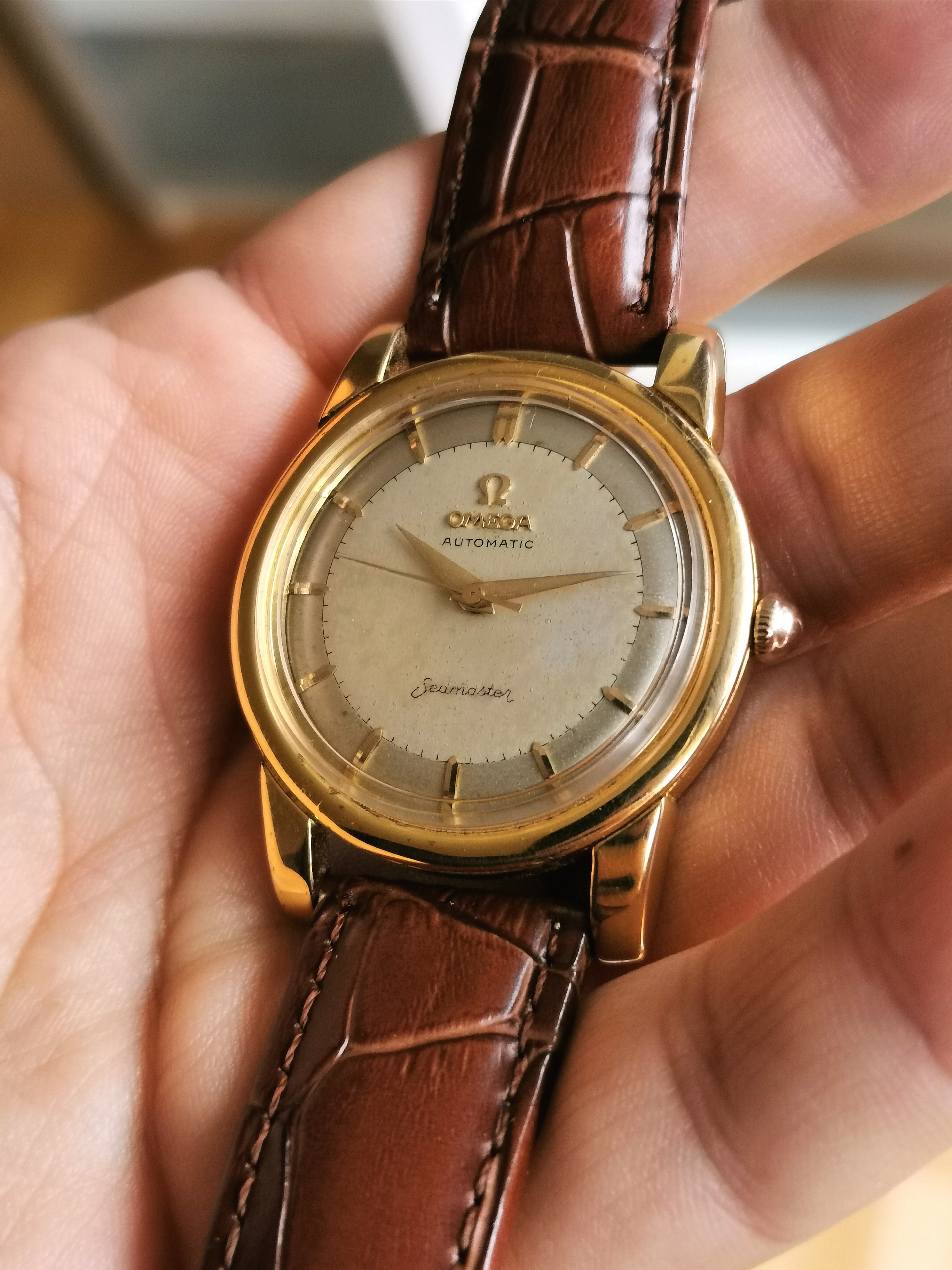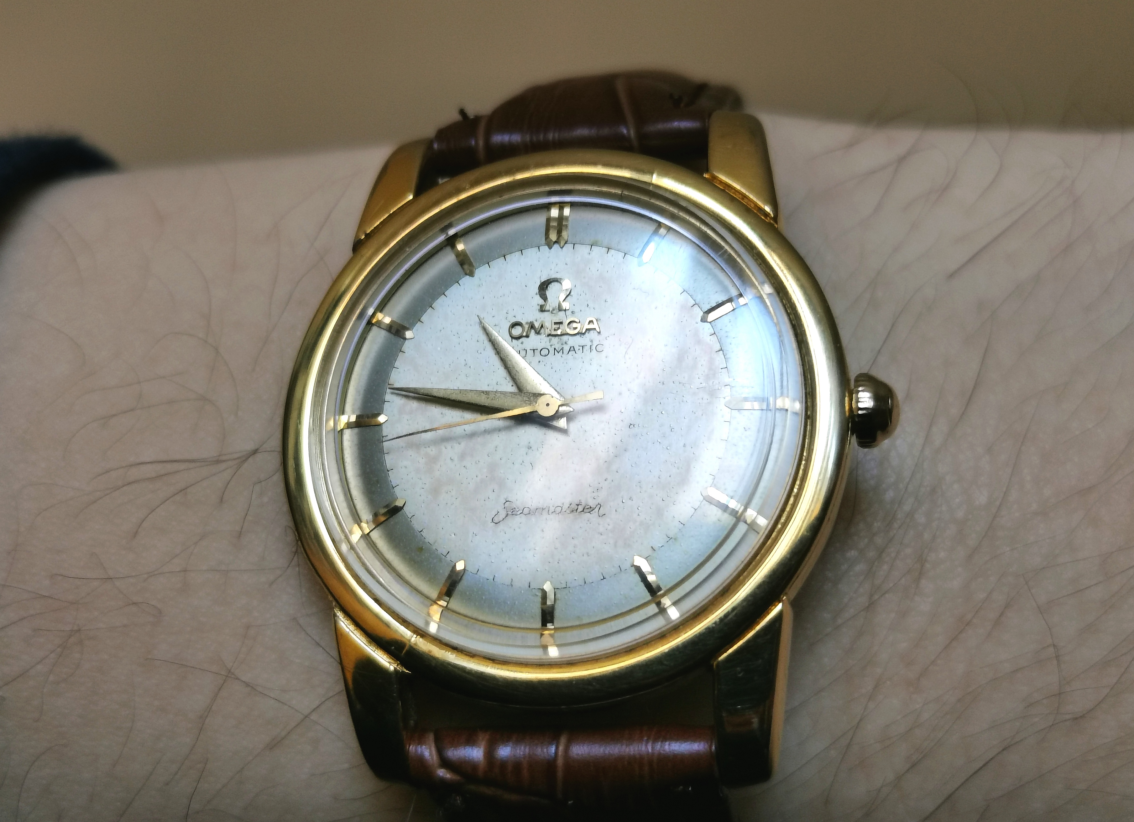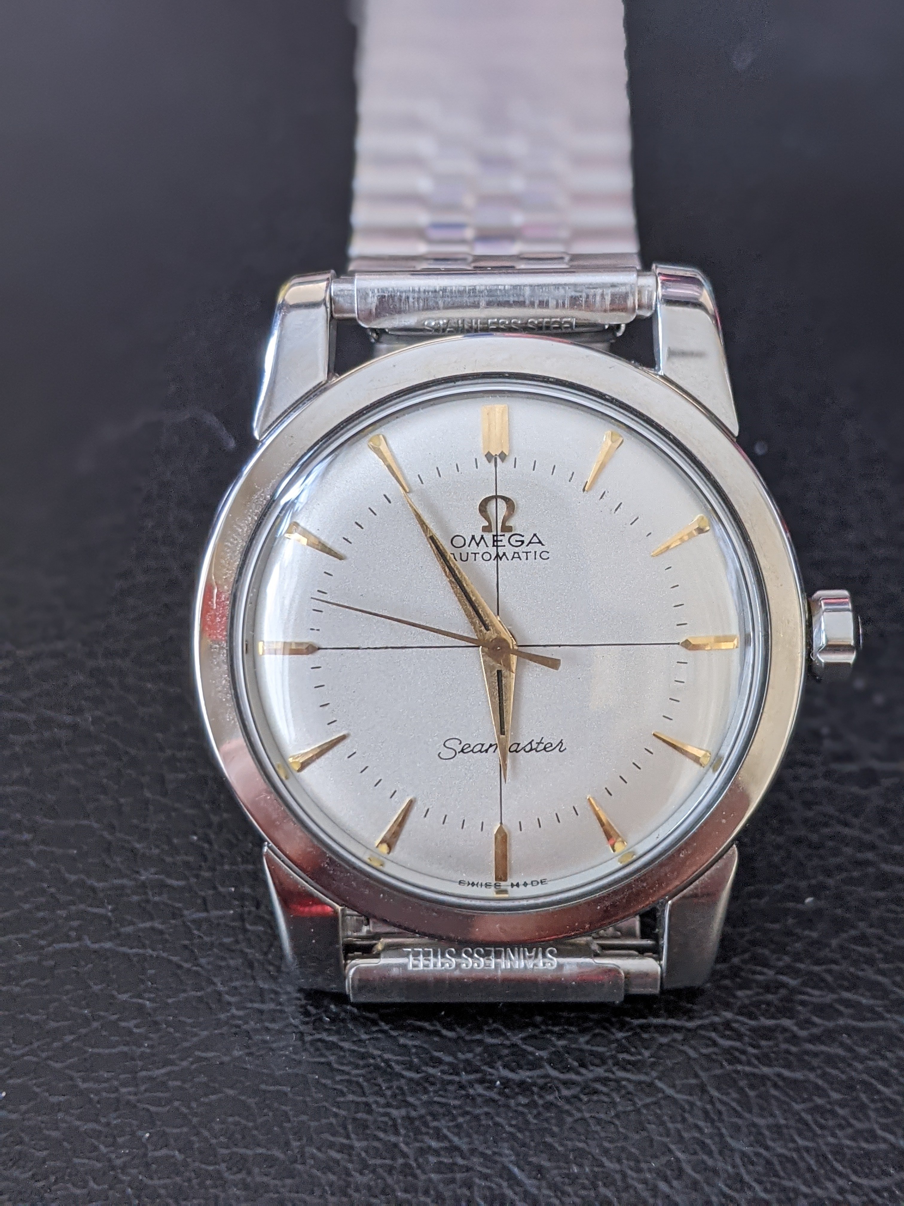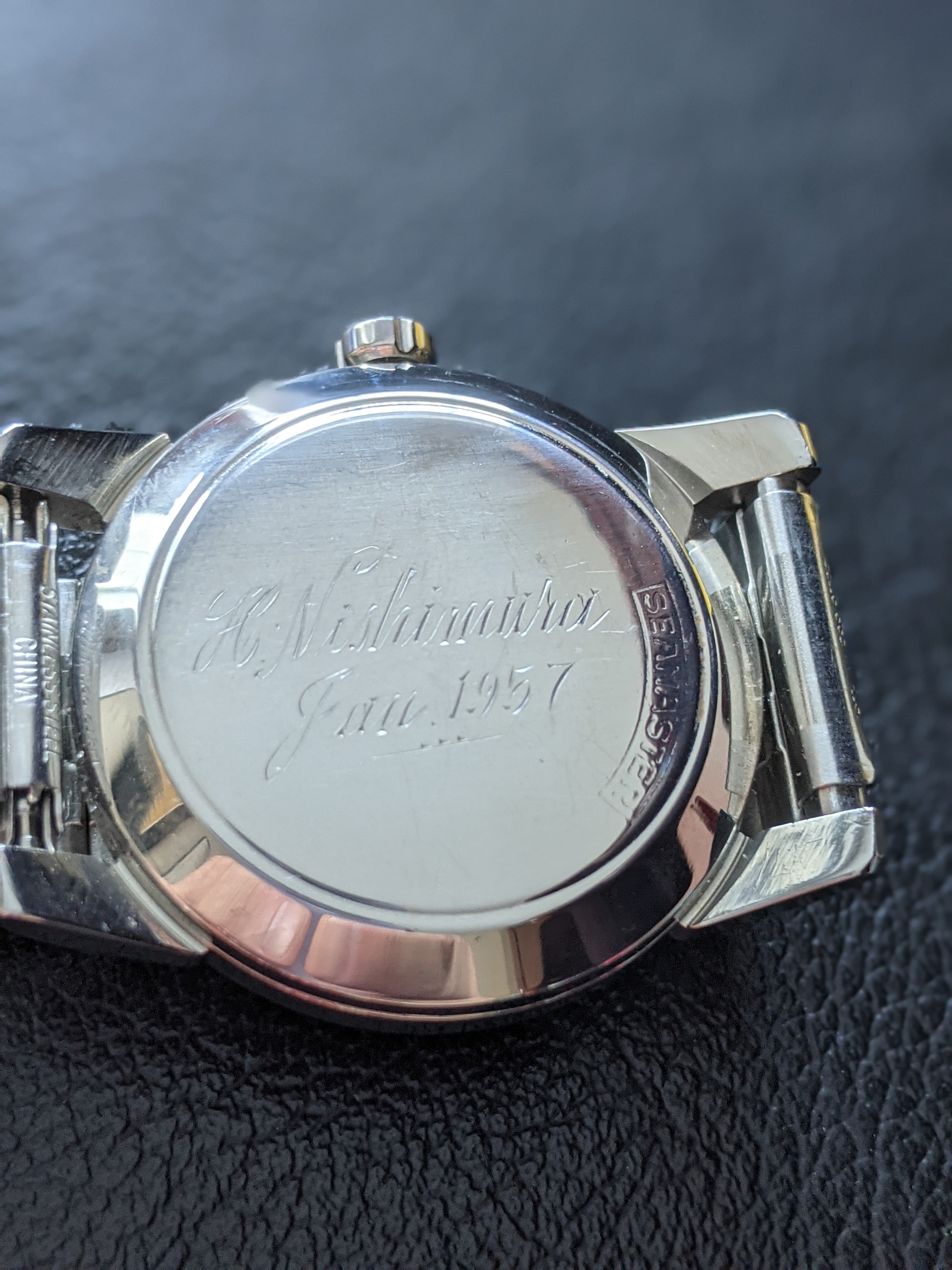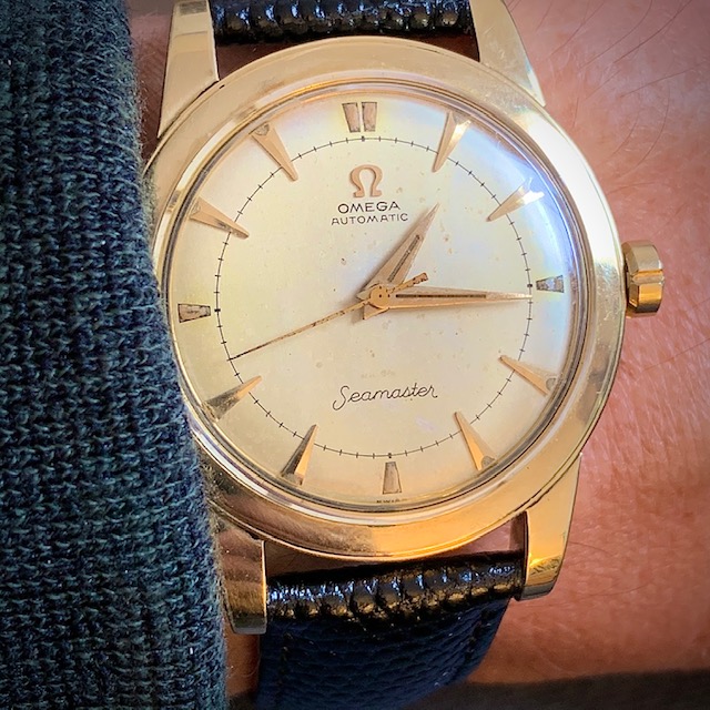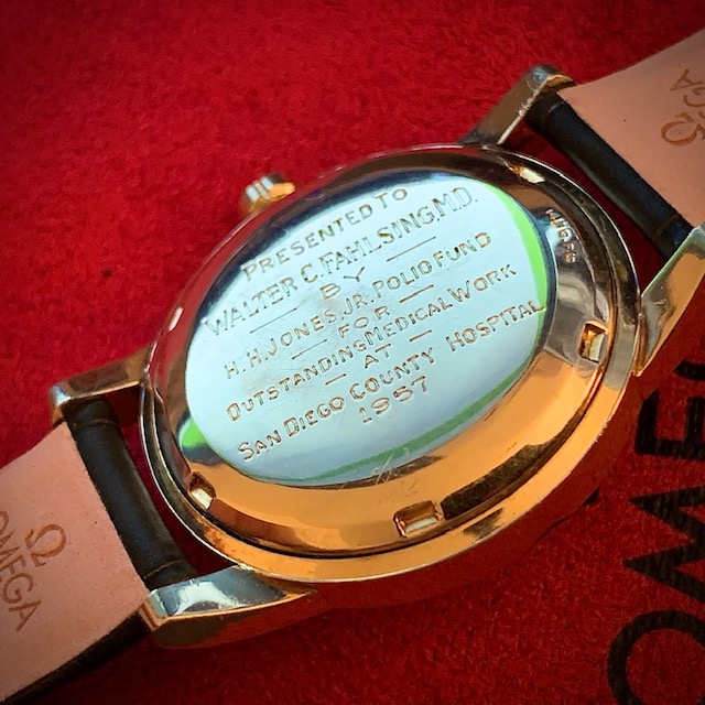 ·My father bought this Omega Seamaster in 1956 or 1957, which he had engraved at the time of purchase, or possibly shortly after. He passed it on to me 10 years ago, which my wife had serviced for me as it was in pretty rough shape after a several decades of use.