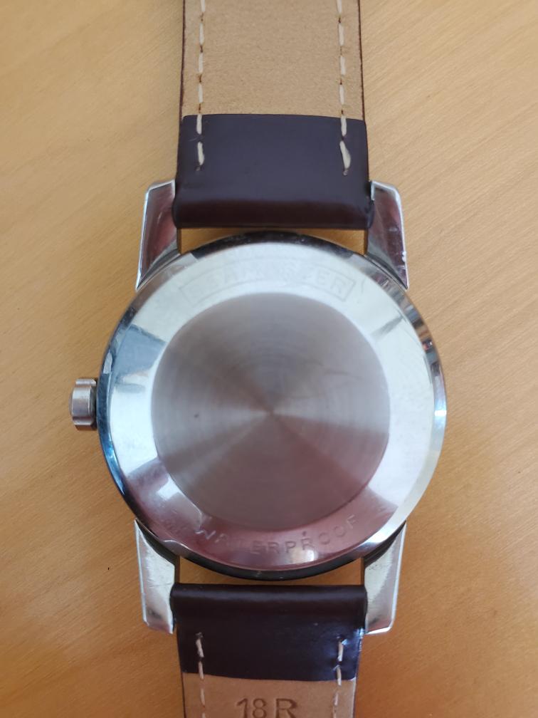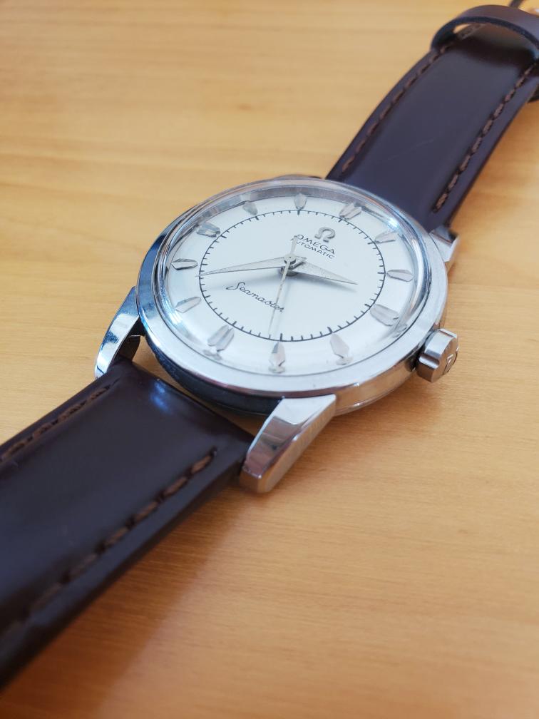 That watch plus a 501 movement could date to around 1956. Definitely a redial. The new text on dial is not factory printing (notice how the text is distorted and not linear) and has that quasi-amateur quality that is emblematic of many independent watchmaker redial efforts. I've tried those smooth crowns from that 50s Omega period, and they are difficult to get traction on with your thumb and fingers to wind. Wish they were knurled instead. The case is around 34mm and has an 18mm band. They are average size for the era, but now wear a little on the dainty side. They work well with a suit. Looks like it may have been polished. The casebook was sanded in the center. From the factory, the back was all polished, not brushed. Handset looks original. If you wanted to return it to more of a vintage look, you could find a vintage, original dial to swap in.