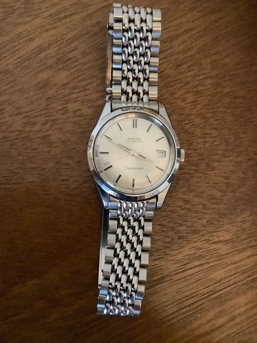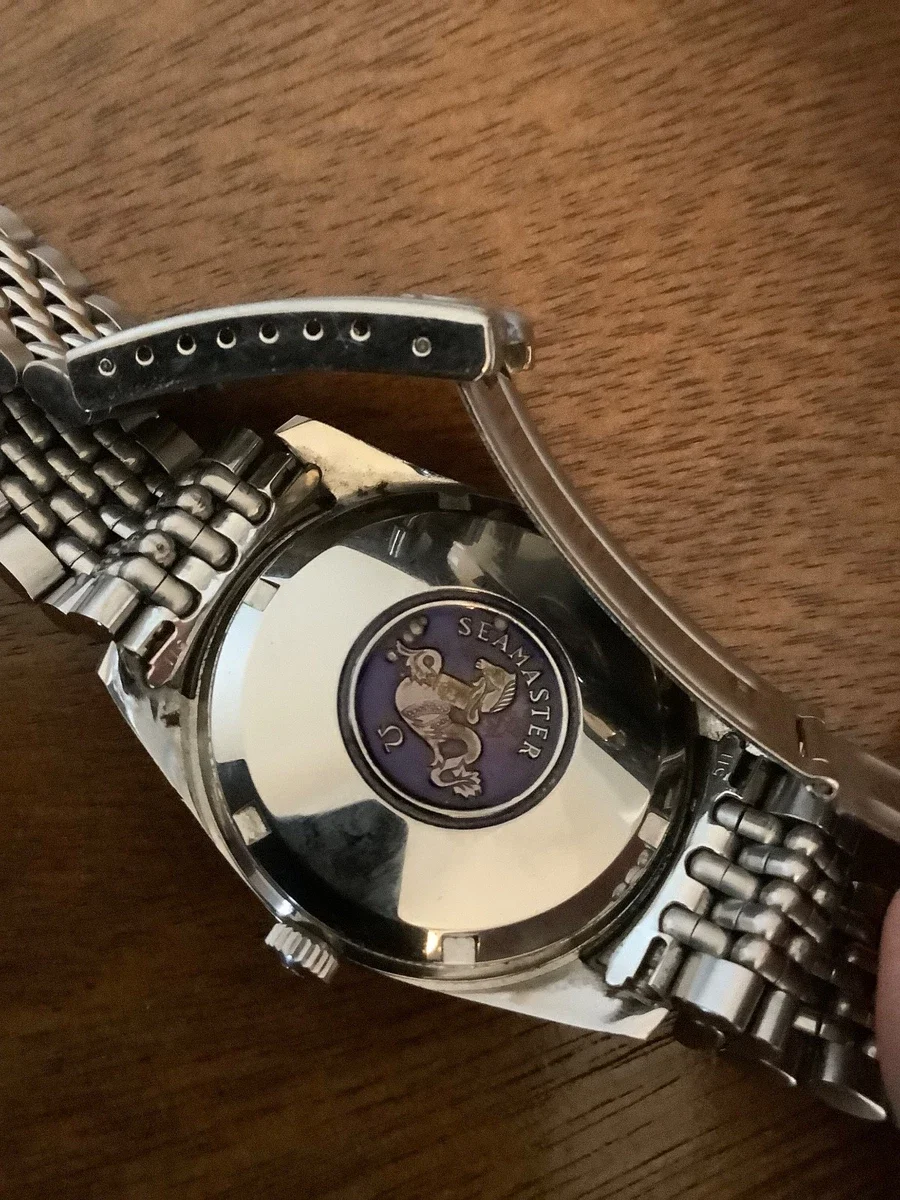 The listing claims a "screw-back case with 'Seahorse' Seamaster medallion with Bubbles and Blued. This is a very RARE Case-back that OMEGA did to select watches"