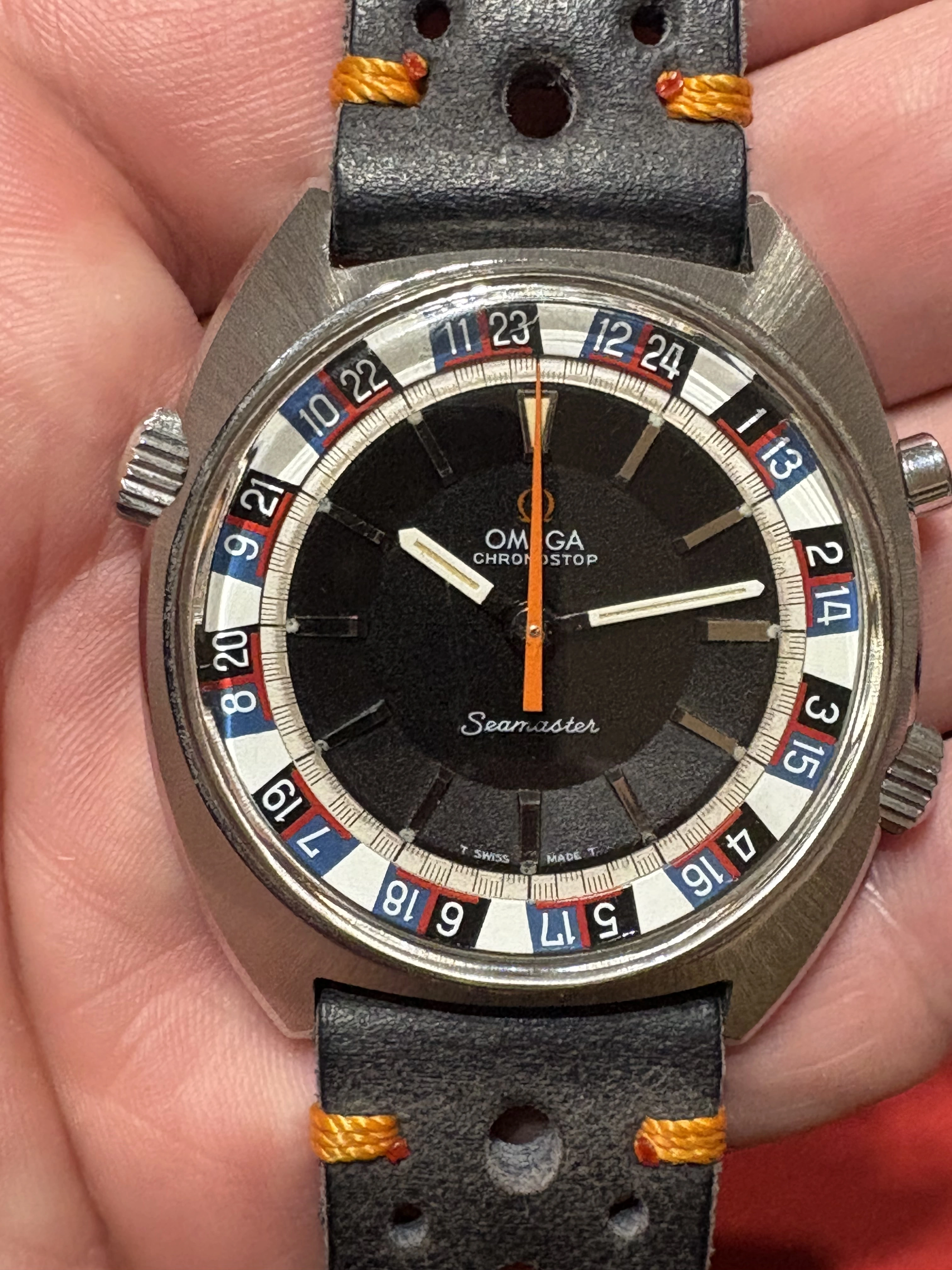 ·For sale original Omega Seamaster Chronostop ref. 145.008, a distinctive Omega sports model from the late 1960s / early 1970s.