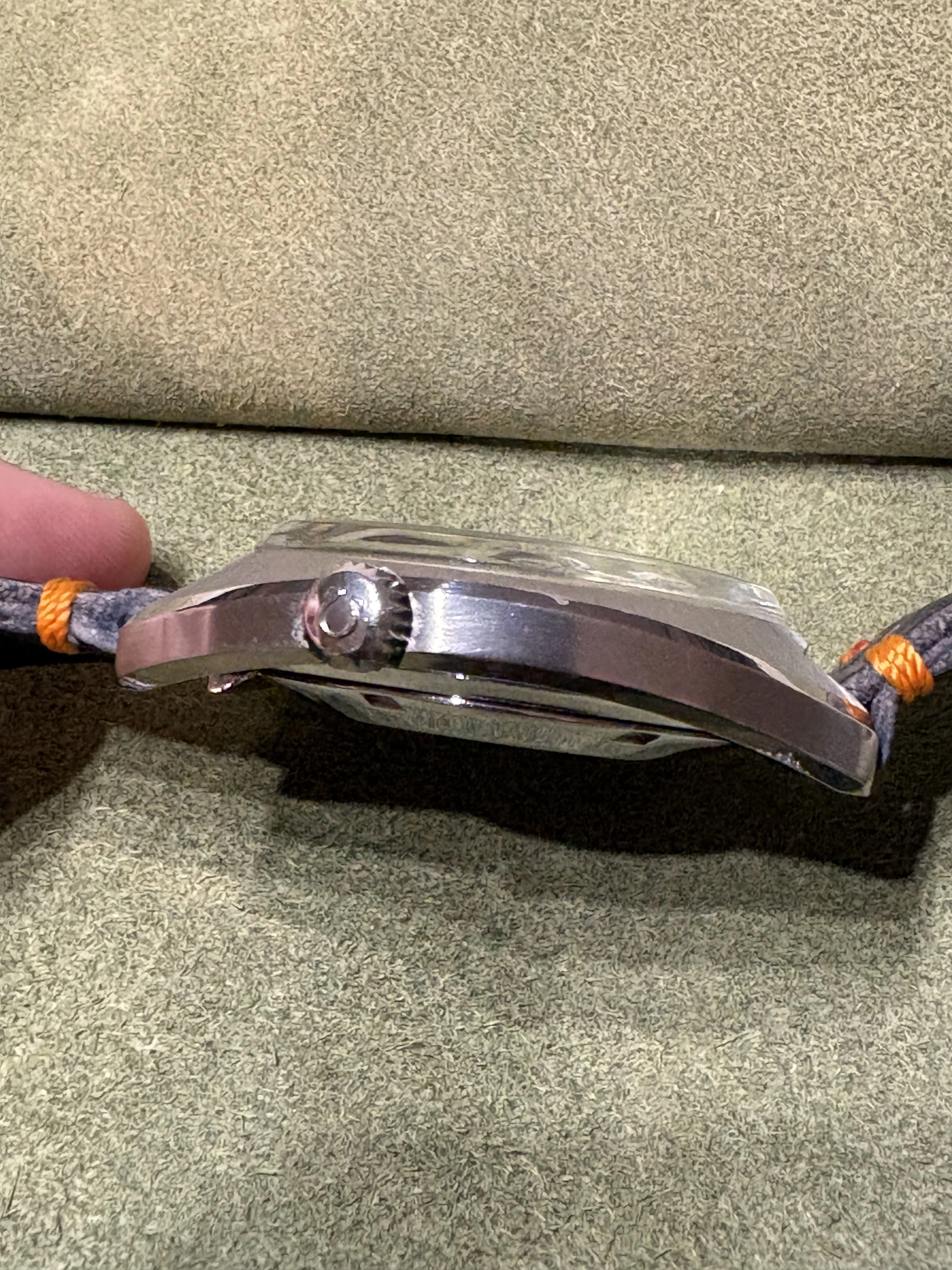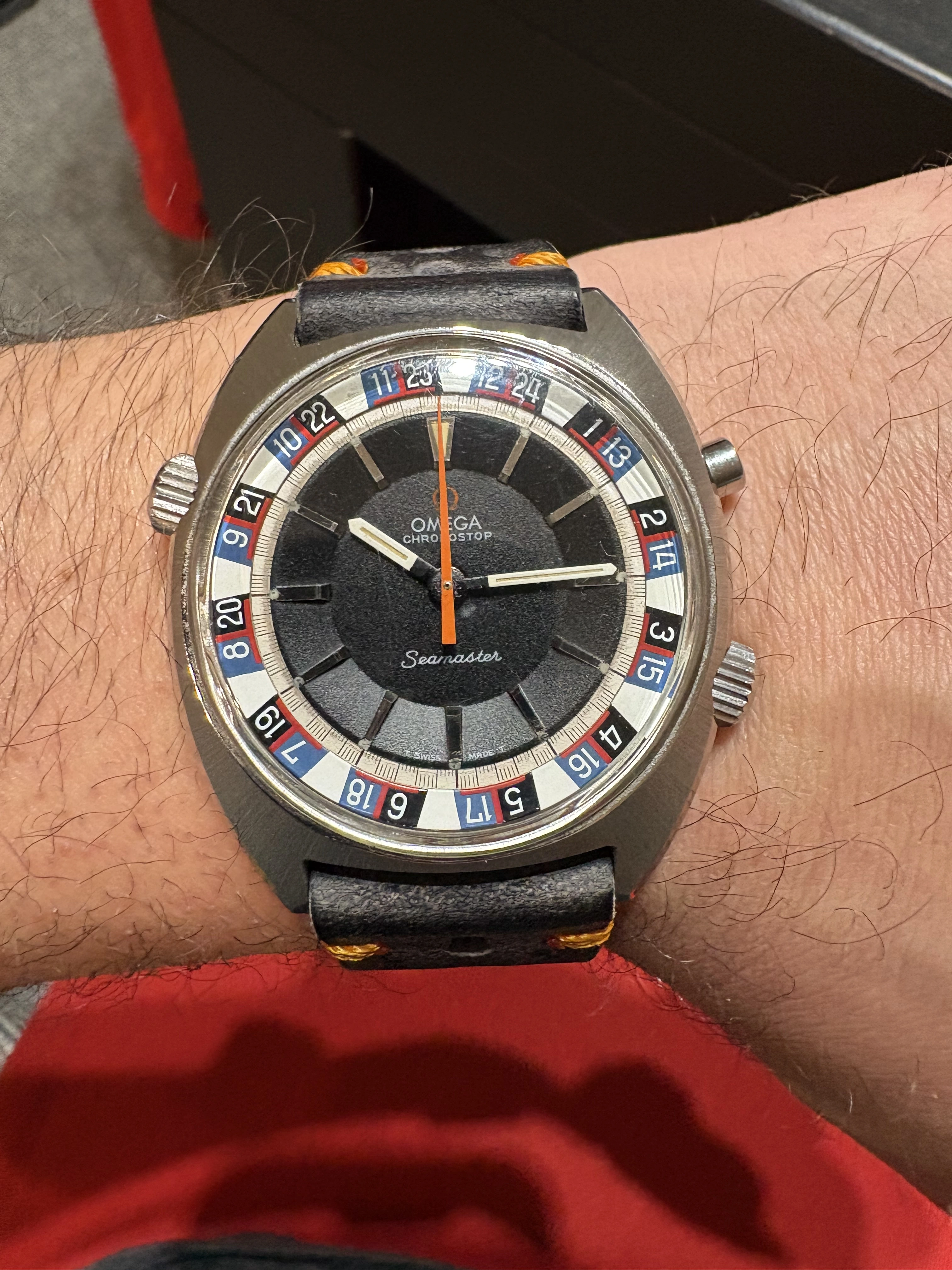 This watch features the characteristic Chronostop chronograph, where the central seconds hand starts with a push of the pusher and resets when released. The model is well known for its retro racing design and inner 24-hour scale.