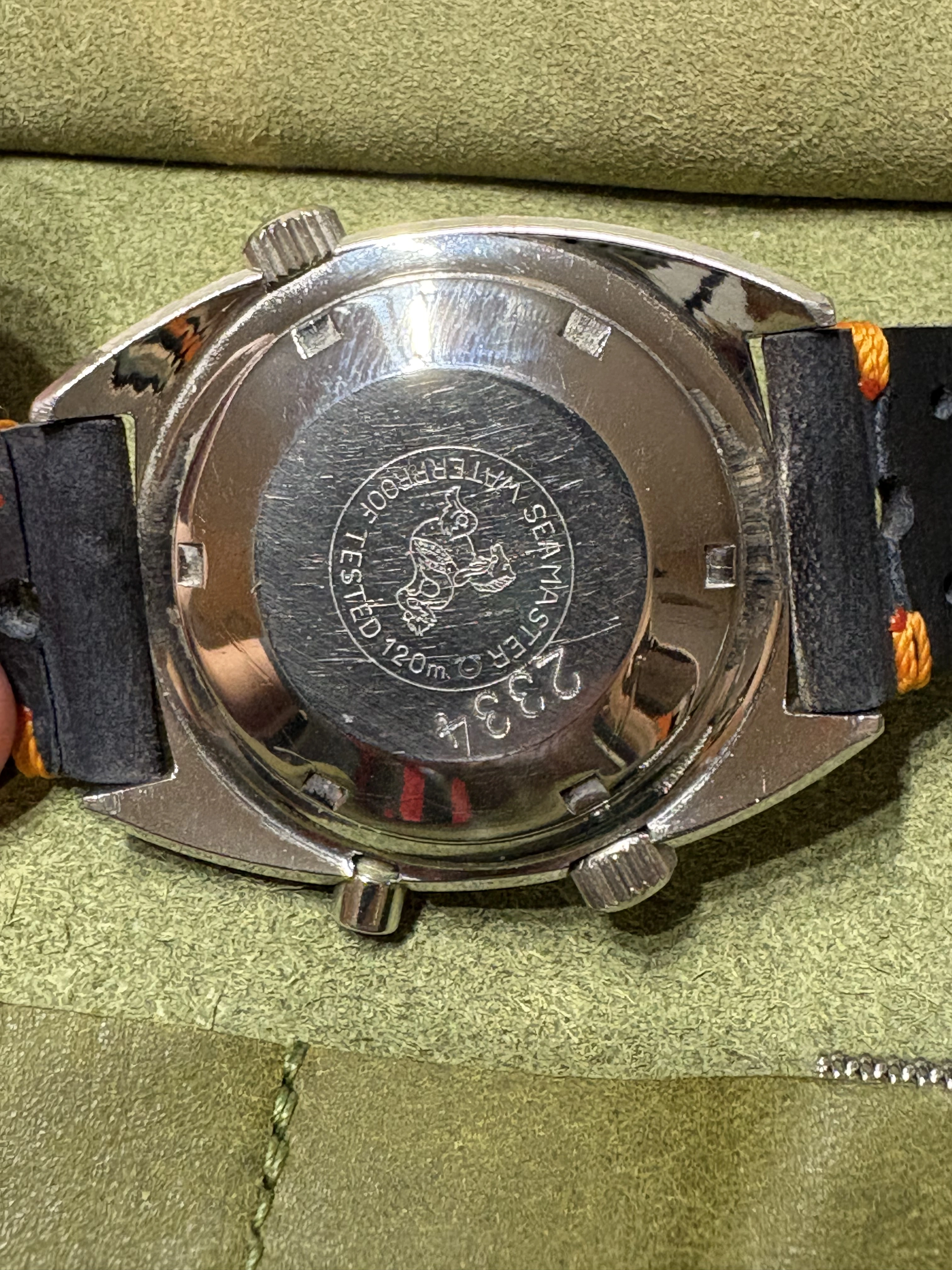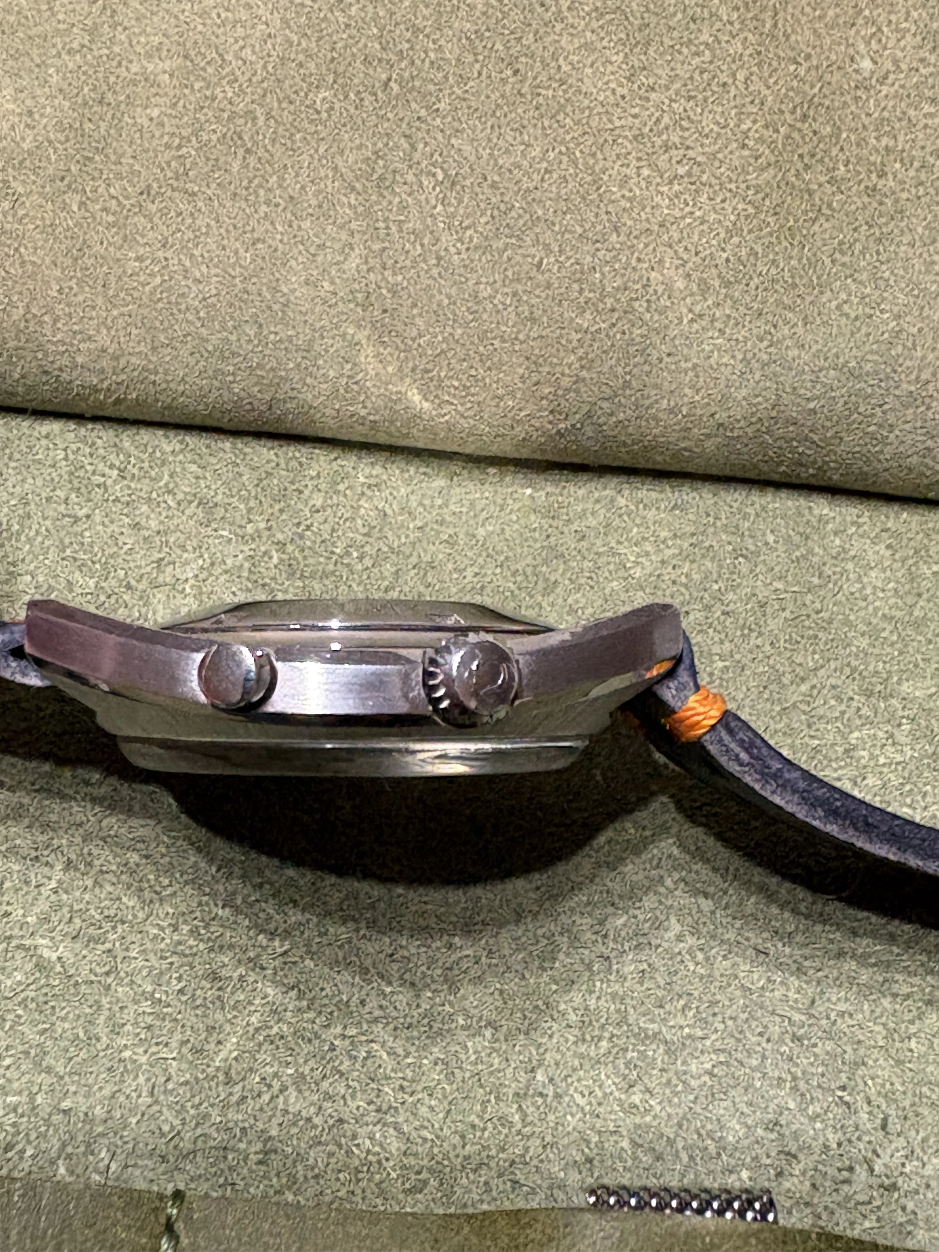 This example is nicely preserved with an attractive dark dial, red/blue 24-hour inner bezel and orange chronograph hand, giving it a classic vintage racing look.