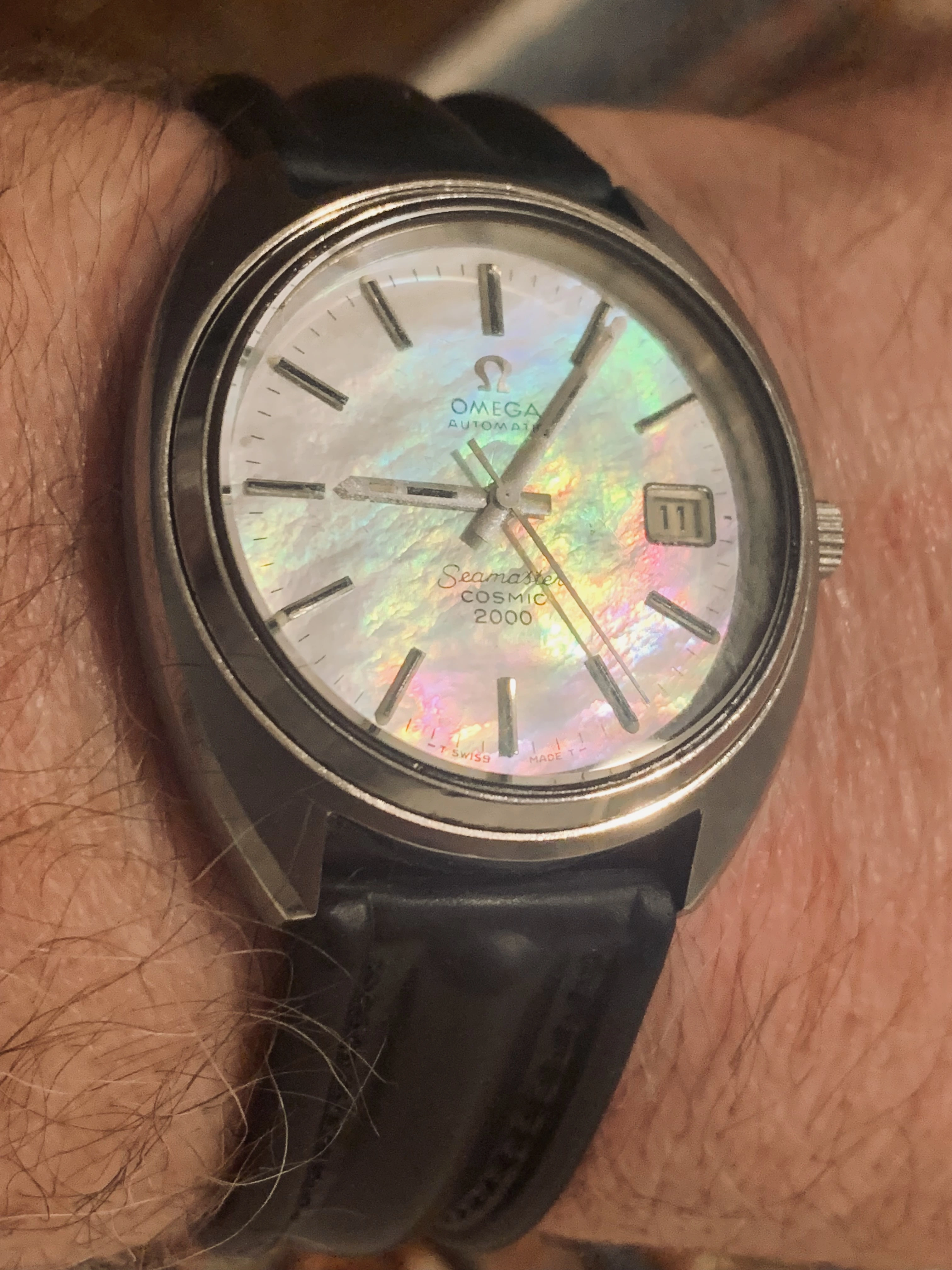 ·Several years ago I bought a really beautiful MOP dial Cosmic 2000 from an old collector here in Tokyo. It’s a relatively rare white MOP dial version sold in the US Navy Exchange in Yokosuka (like a PX) back in the early 70s. He’d advised me because it had a stuck stem it needed an overhaul although it ran at the time. Because I love the dial so much I bought the watch anyway, and stuck it away as a future project. A couple years later I inquired locally about an overhaul from several repair shops, but since the dial was marked as tritium lume, and maybe I’d thought because they also didn’t want to muck around with a cosmic 2000, they refused. So back into the drawer it went. This weekend I sent off another repair request via email to a specialty repair shop here, and although he didn’t outright refuse it, he said he would have to send it out of the country because of the tritium, (which actually has been a problem with other watches I’ve had OH’d) , even so I was a little disappointed he wouldn’t let me slide. However, he did give me some advice, which was basically to heat the watch to no more than 45°C for an hour and then operate the stem several times. Alas the stem seems to work now and I could hack the watch, and set the time date, although when it’s fully depressed winding it seems a bit crunchy. He also advised me to wear the watch or put it on an auto winder and see how it does for a few days, saying after these many years it probably needs to run at least a week to get everything to smooth out internally. I’ve never been given that advice, but this guy does a lot of expensive repairs on Pateks and Vacherons etc. , so I’m going to heed it. I’ll give it a few days and see how she does, but as of now it’s running. If it keeps time fairly well for a day, I’m just going to put it on an auto winder in the closet and leave it be like that so I don’t have to mess around with the stem so much. I think I’m at the point now where I don’t care if the date is correct, if I can just hack it, and then restart it to synchronize it once in a while, that will be fine for me. I’m starting to get a bit like that physically too ha ha.